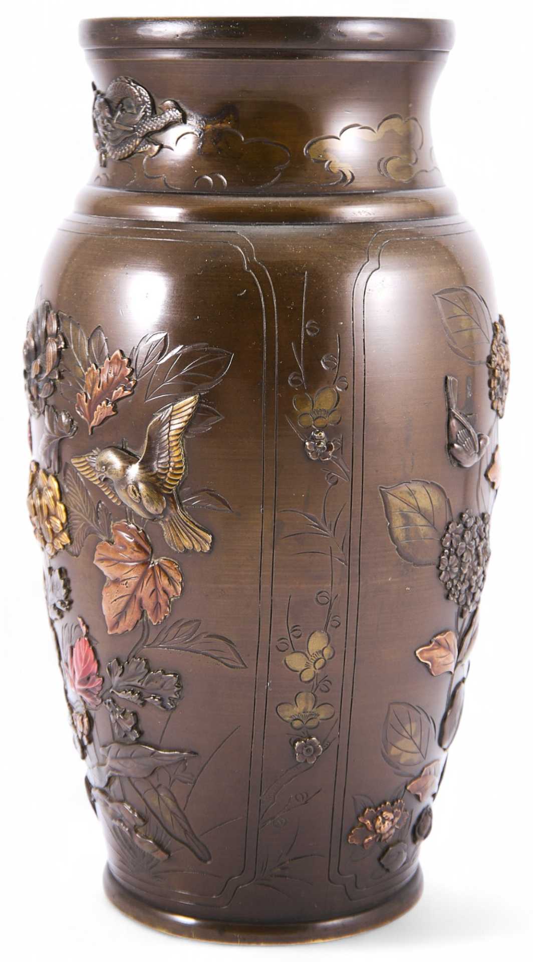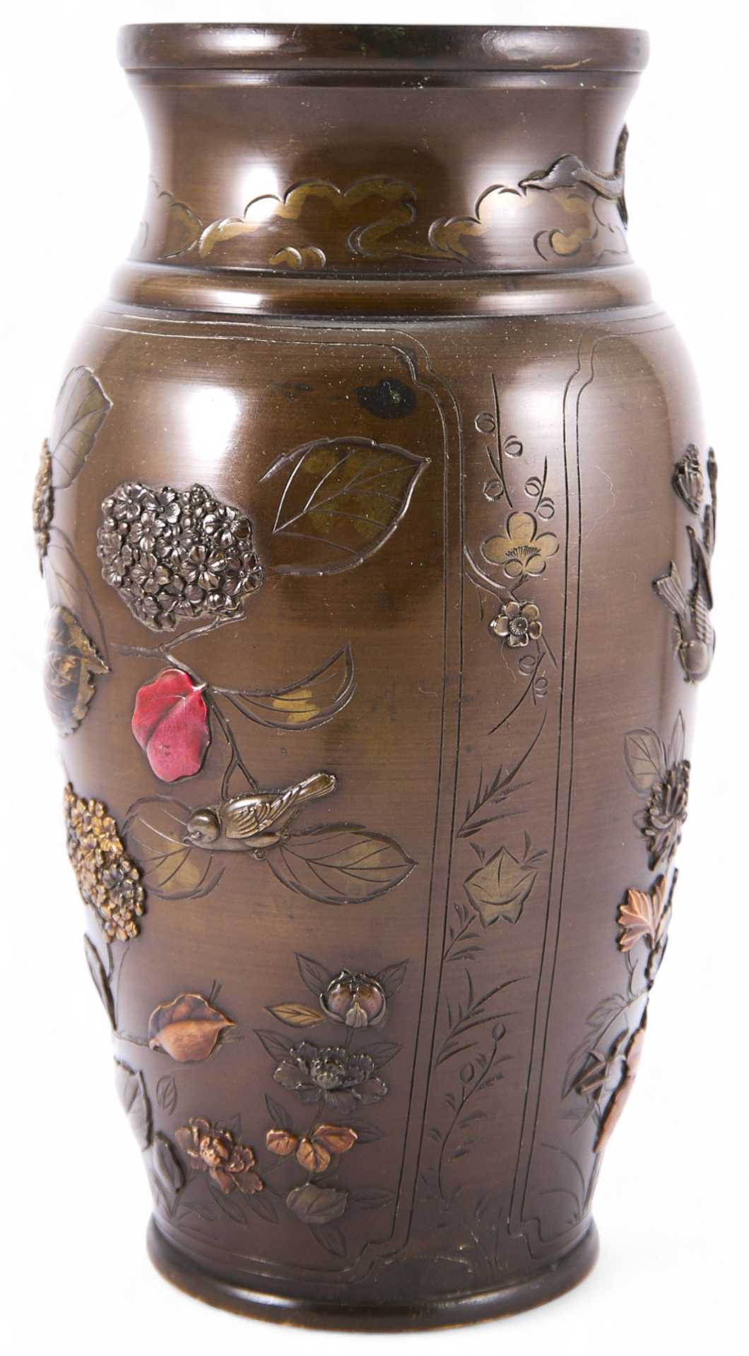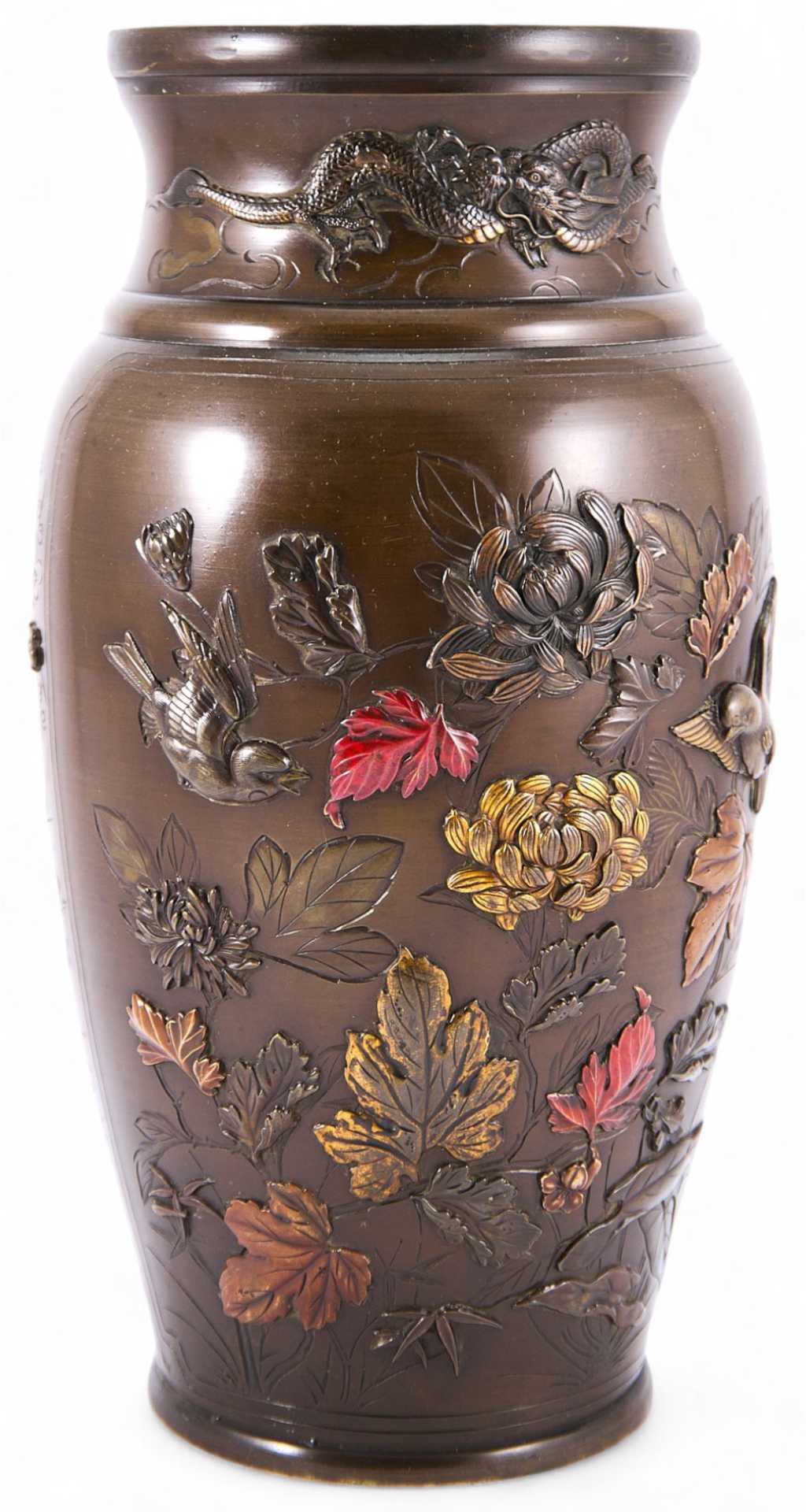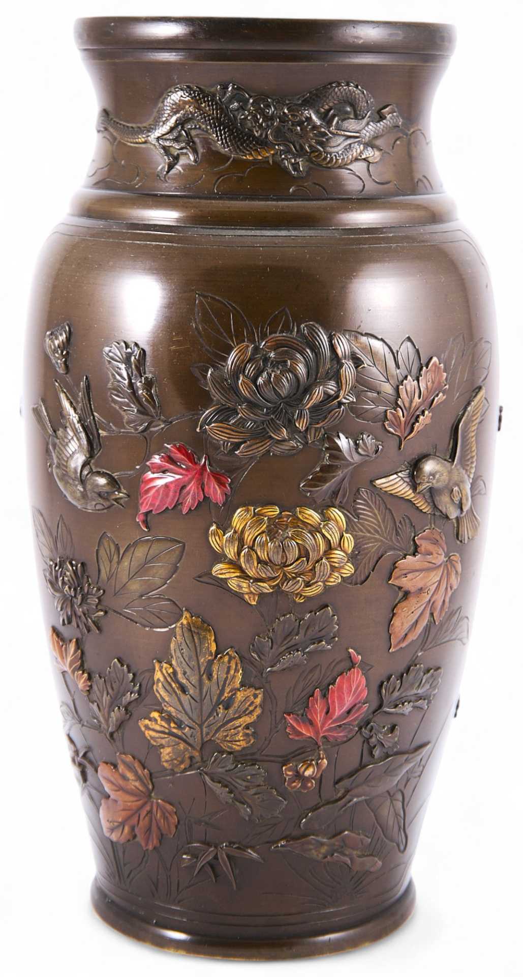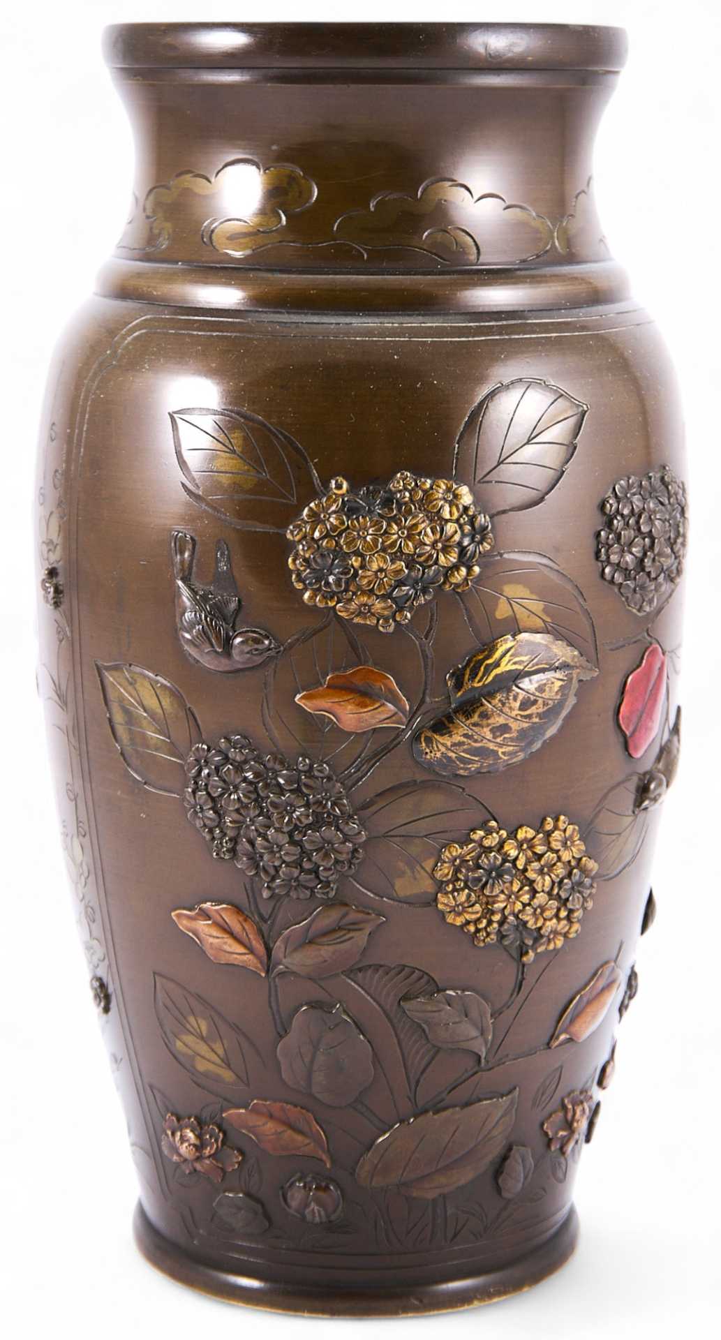 Ваза, украшенная рельефным изображением воробьев и хризантем. Мотивы японской живописи изображающей природу и её представителей в их естественной среде обитания часто становились декоративной составляющей предметов декоративно-прикладного искусства.