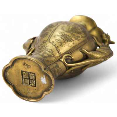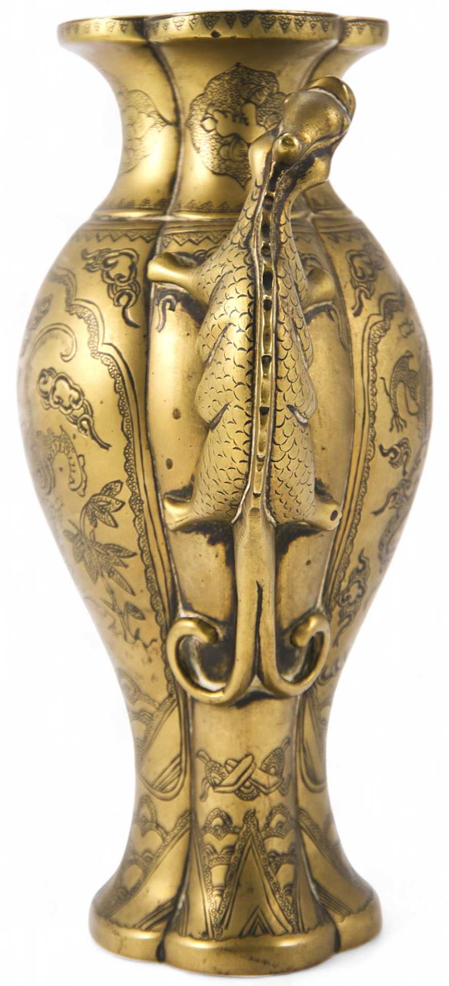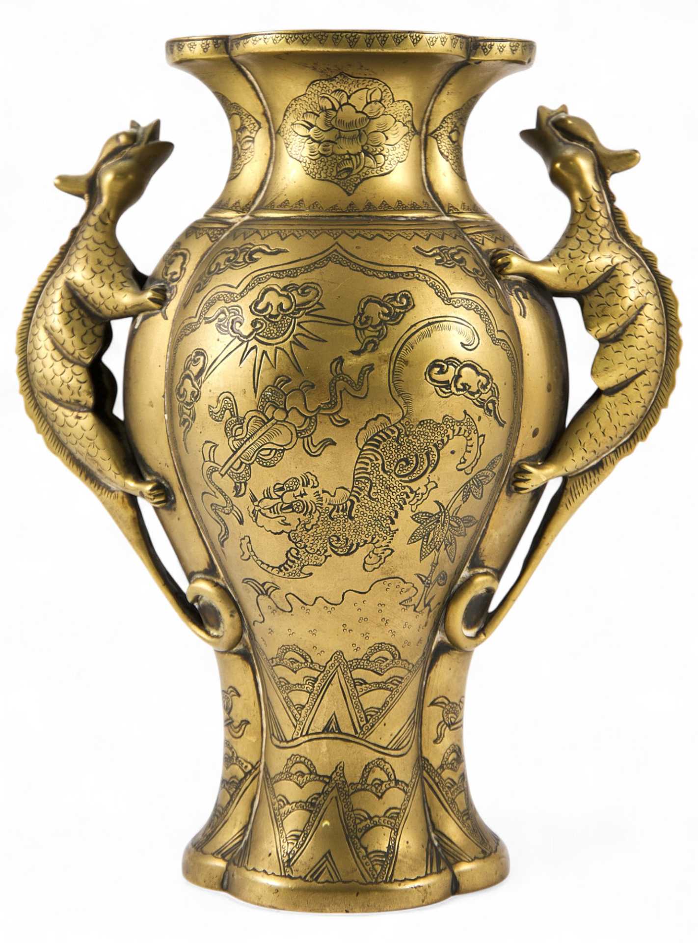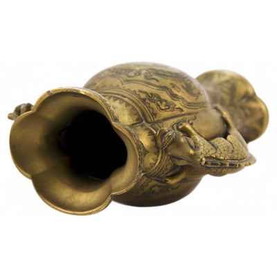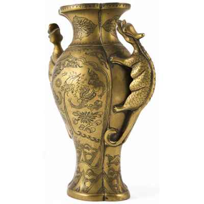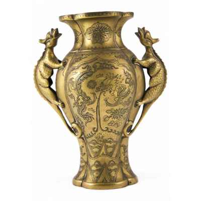 Бронзовая ваза, украшенная изображениями драконов в технике гравировки. Ваза — символ мира и гармонии.