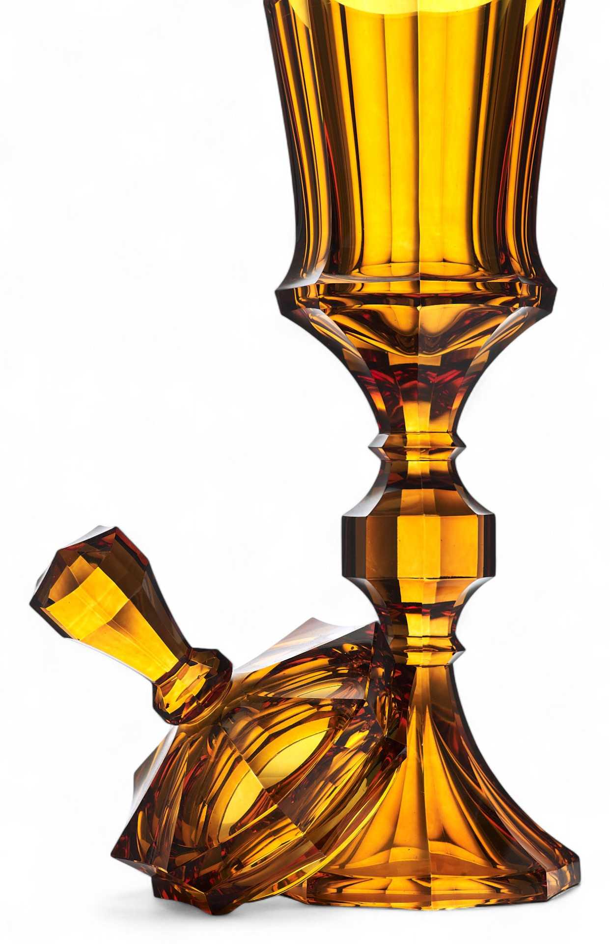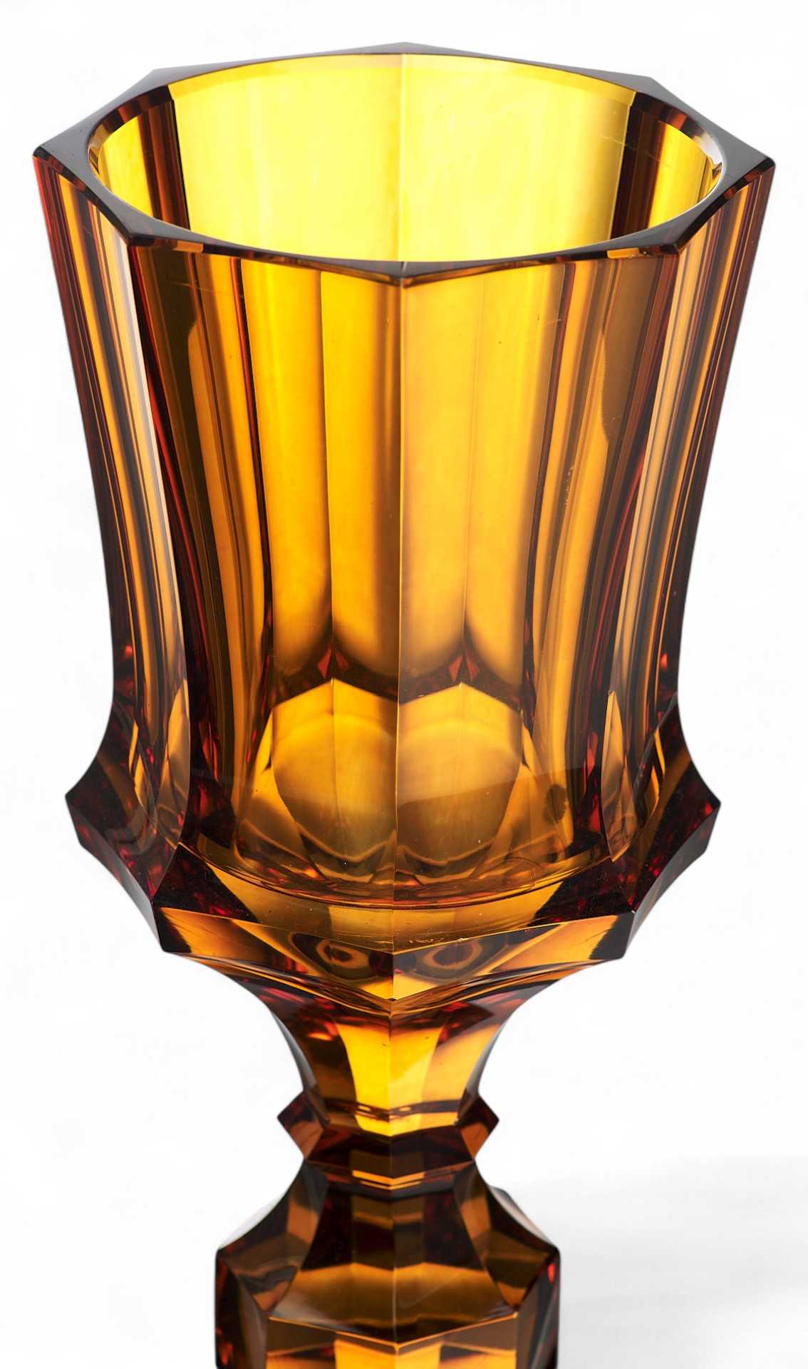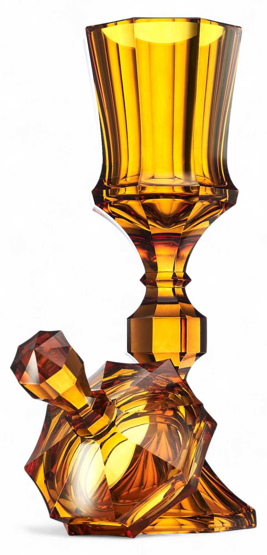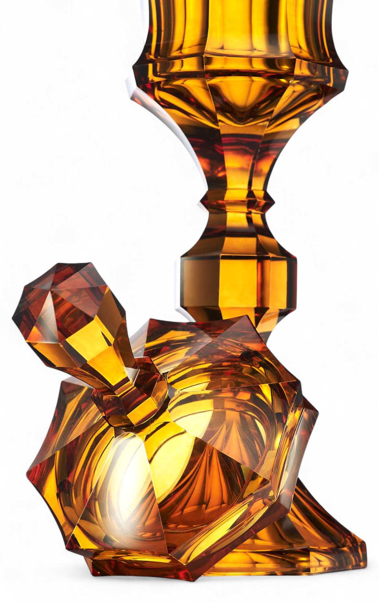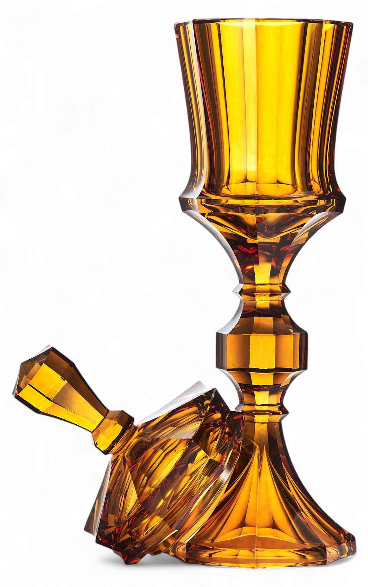 Тулово конусовидное с граненым утолщением в нижней части, ножка в виде ограненного “яблока”, в верхней и нижней частях стойки “денежки”. Основание восьмигранное. Стекло желто-коричневое.