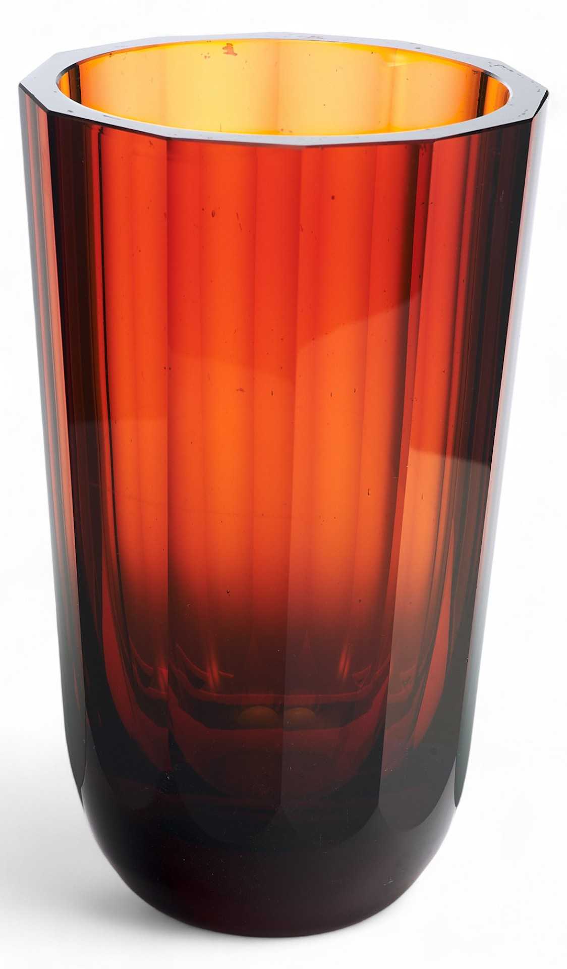 Тулово конусовидное, огранено двенадцатью вертикальными гранями, основание круглое. Стекло краснокоричневого цвета.