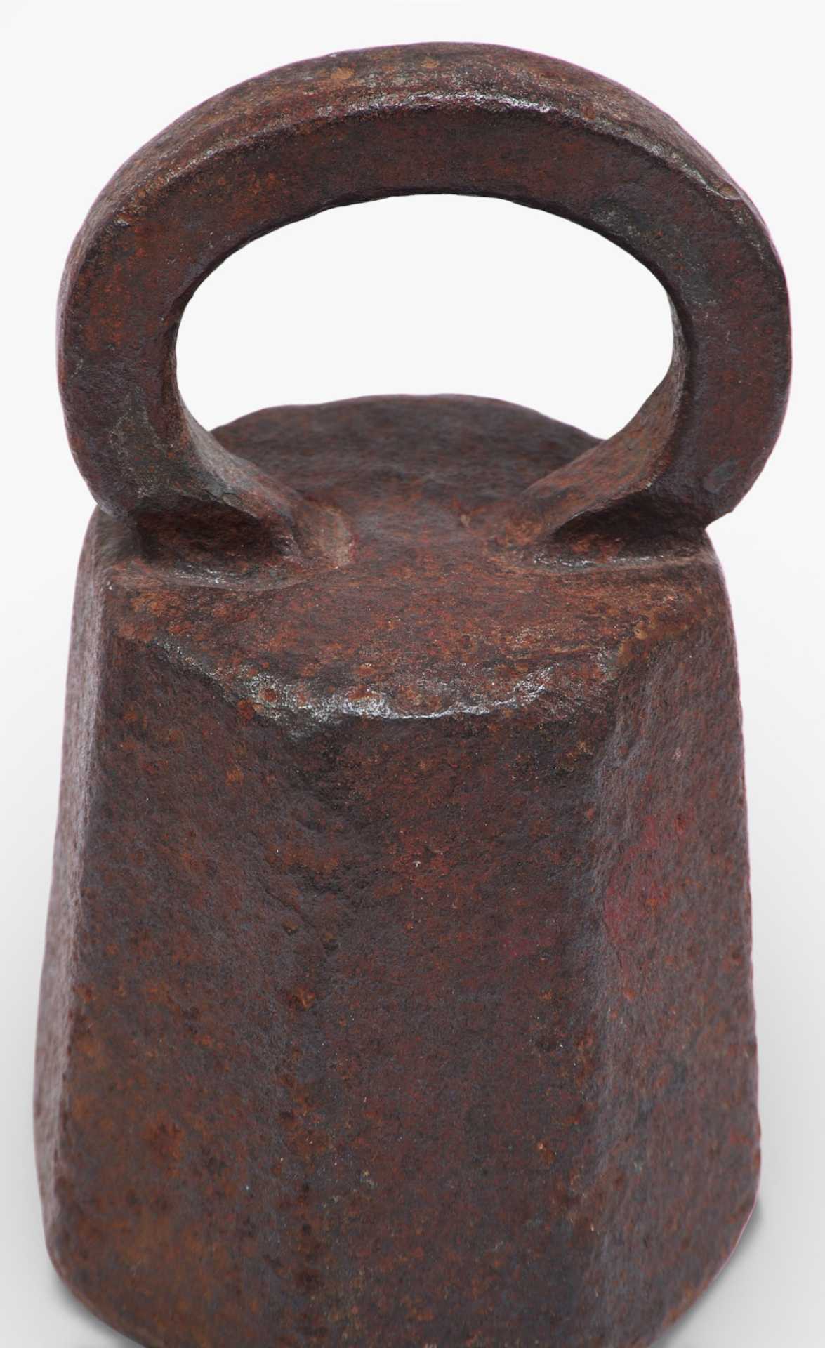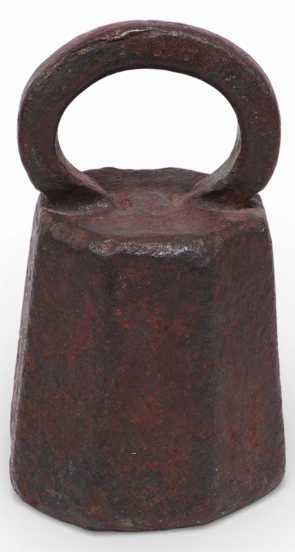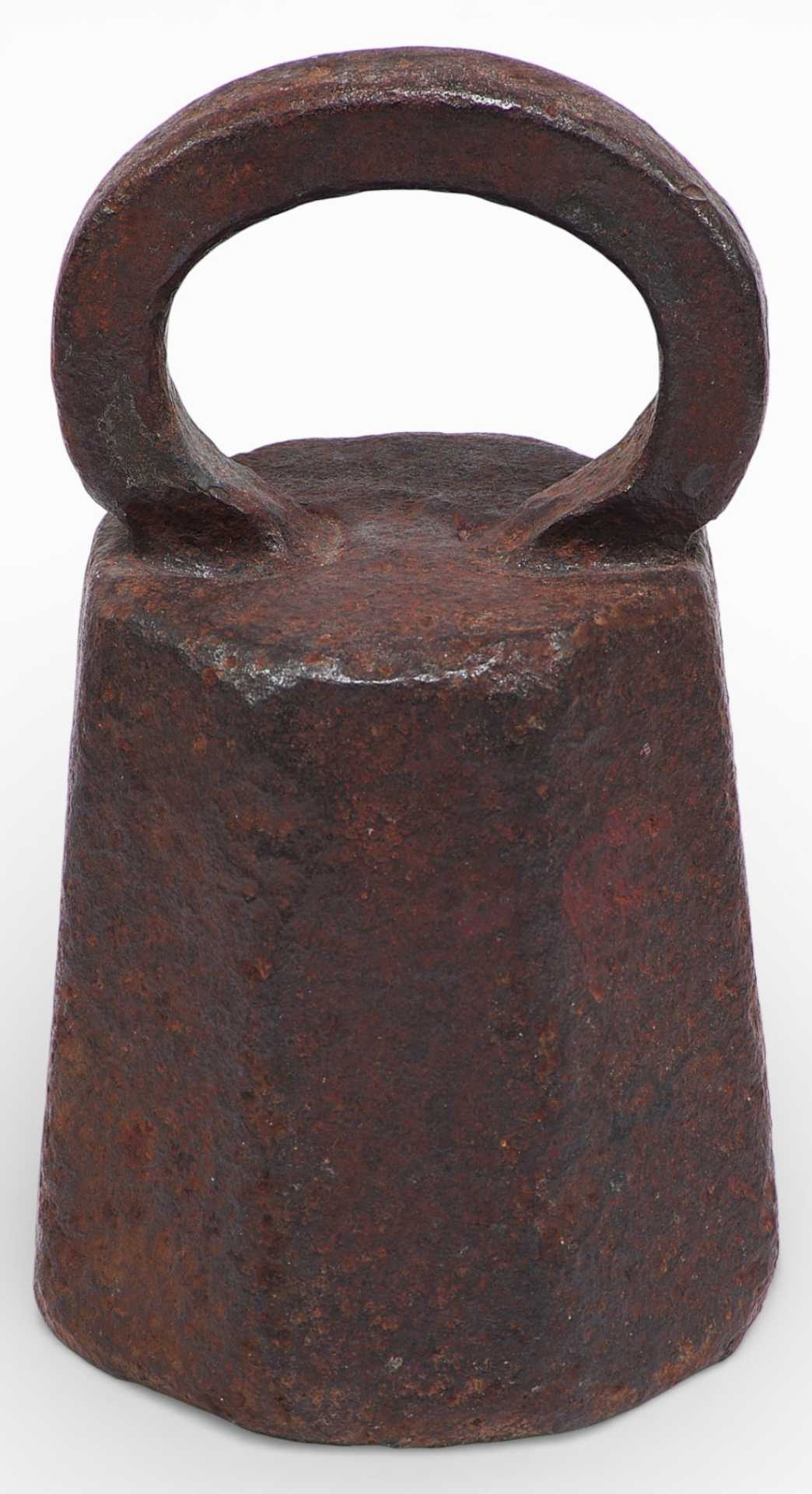 Гиря торговая восьмигранной формы с дужкой. Предмет изготовлен из чугуна весом в два пуда и служил для взвешивания. На дужке имеется обозначение веса — углублениями точками. Древнейшей мерой веса была гривна (160 г и 200 г), а начиная с ХП века в письменных источниках уже упоминаются такие меры как пуд (16,38 кг), берковец (10 пудов или 163,8 кг),золотник (4,266 г).