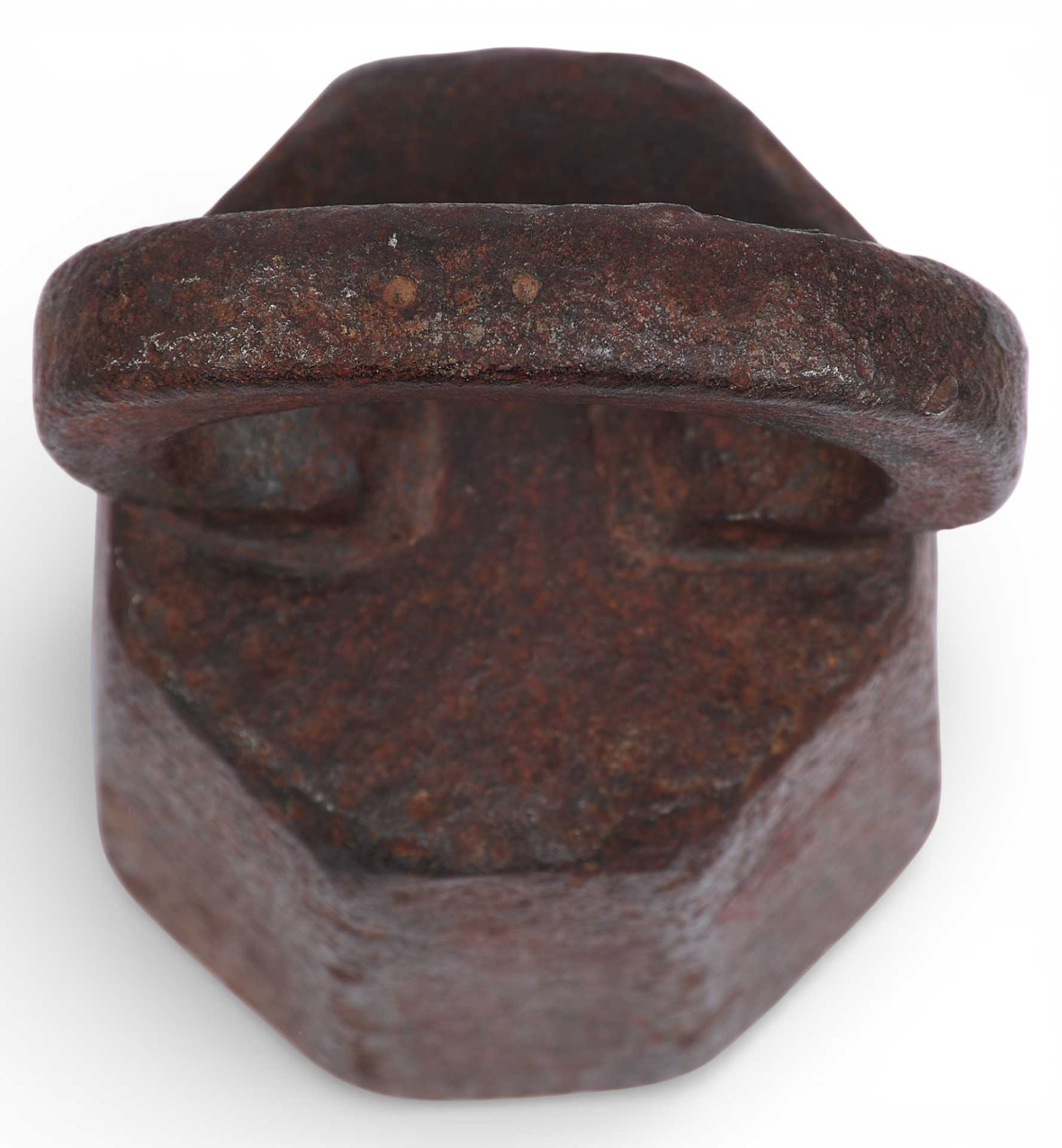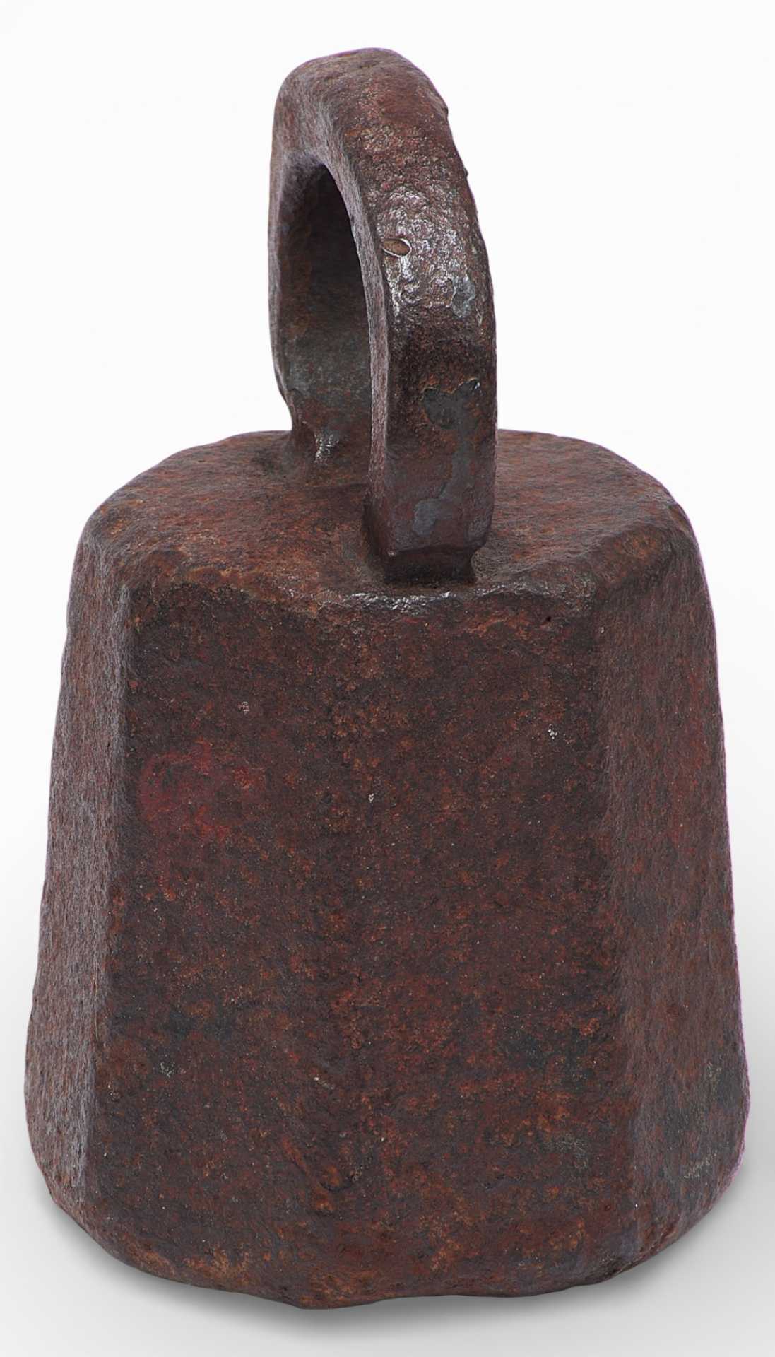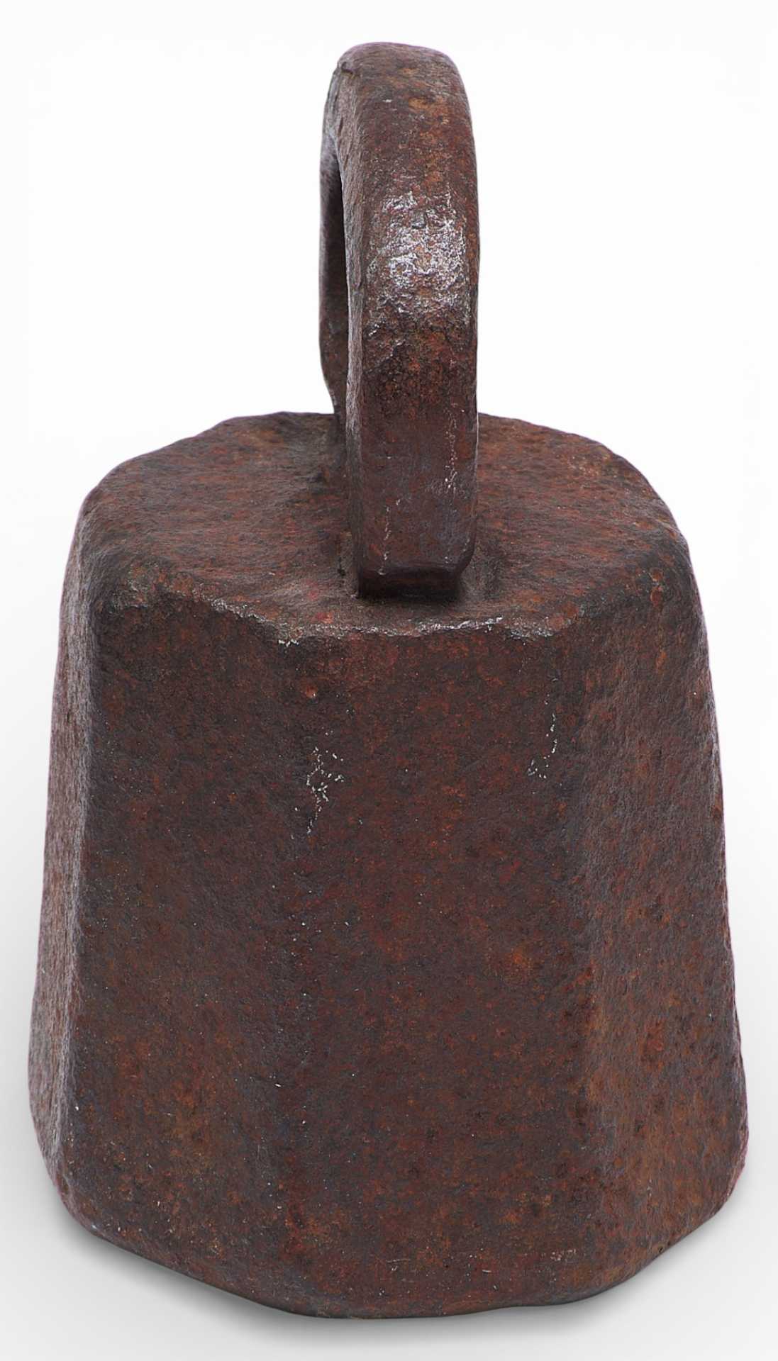 Гиря торговая восьмигранной формы с дужкой. Предмет изготовлен из чугуна весом в два пуда и служил для взвешивания. На дужке имеется обозначение веса — углублениями точками. Древнейшей мерой веса была гривна (160 г и 200 г), а начиная с ХП века в письменных источниках уже упоминаются такие меры как пуд (16,38 кг), берковец (10 пудов или 163,8 кг),золотник (4,266 г).