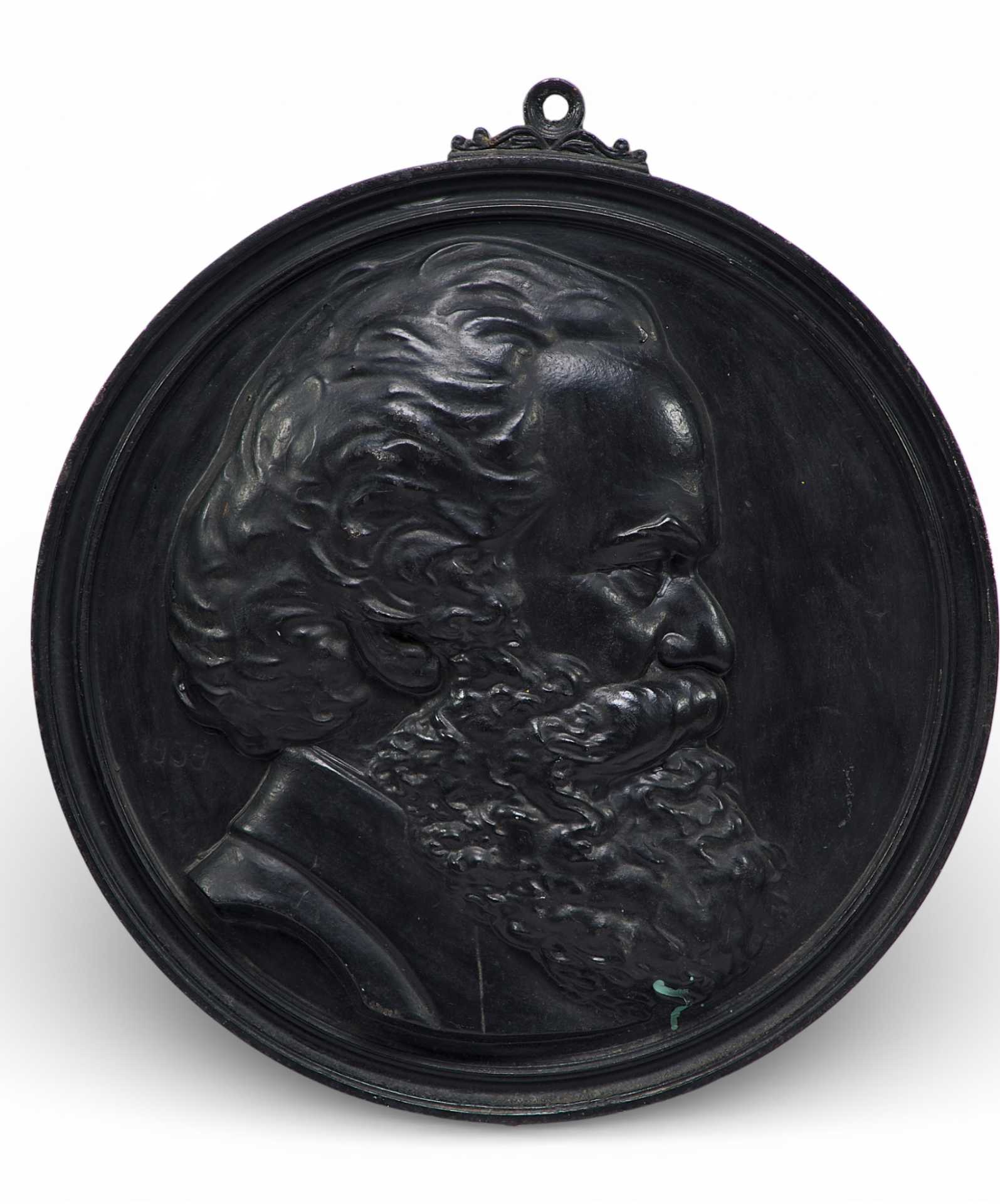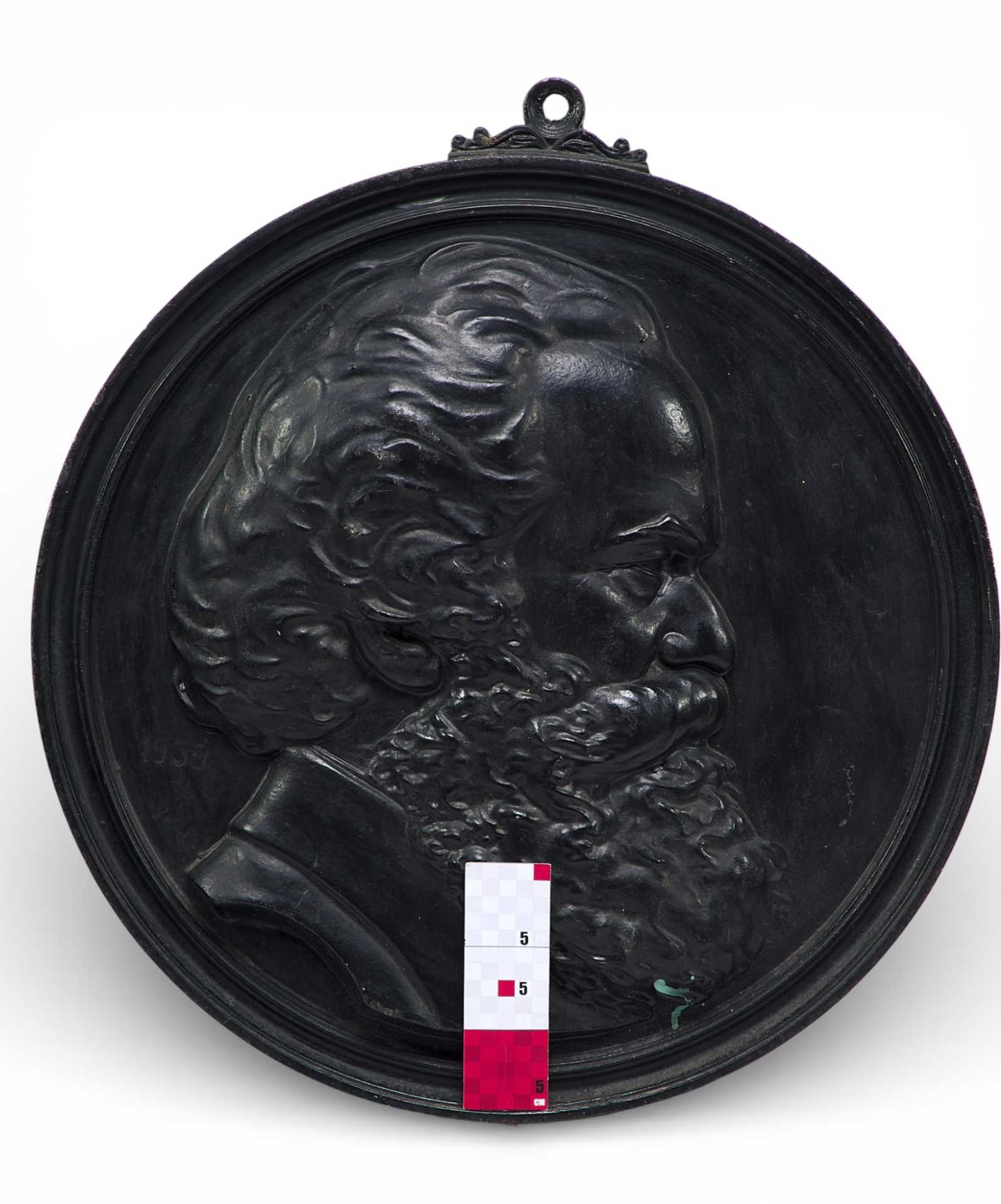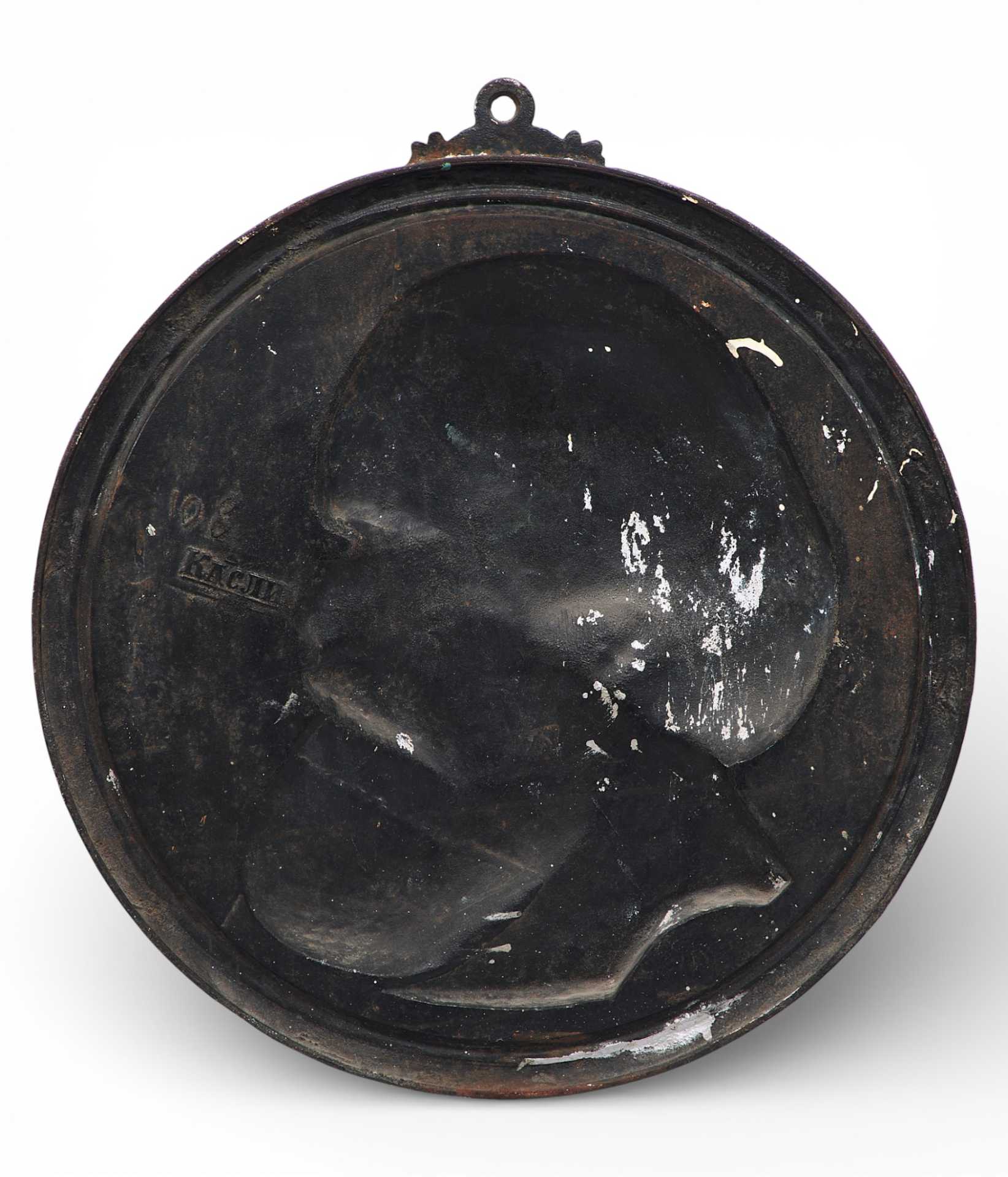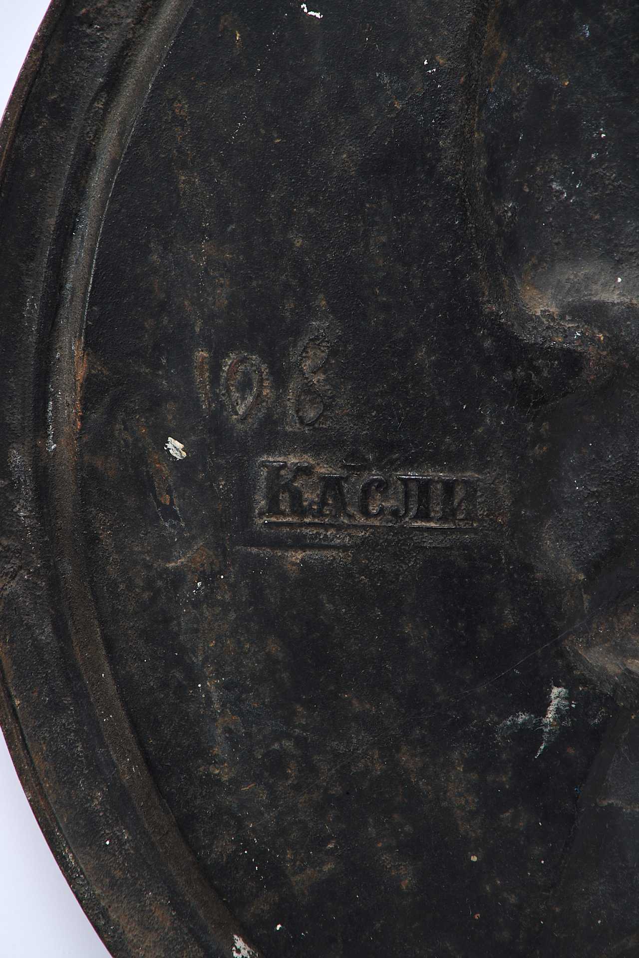 На круглой пластине с профилированным бортом - профильное (вправо) изображение головы бородатого длинноволосого мужчины.Вверху на ребре пластины - крепительное кольцо. На обороте пластины клеймо изготовителя и номер: «Касли», 108.