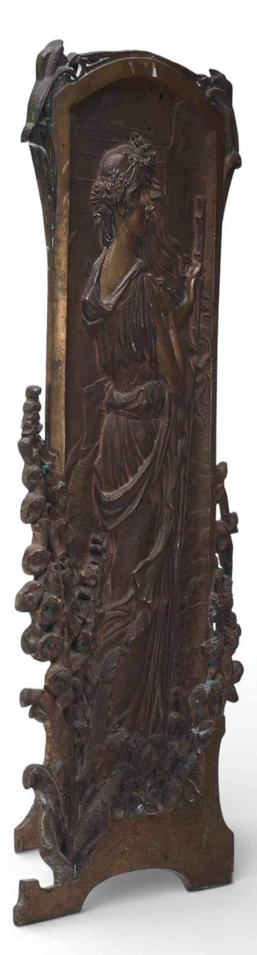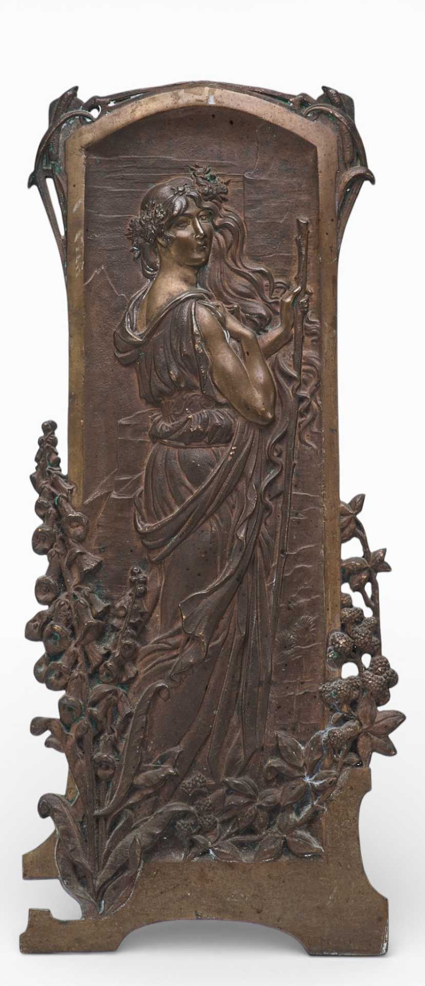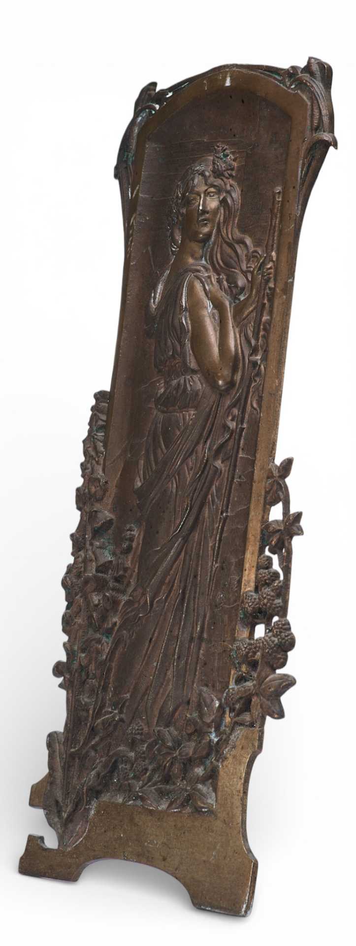 Панно, на котором изображена женщина с посохом в античном хитоне. Художественное оформление предмета соответствует по своим признакам стилю модерн и, вероятно, было создано под влиянием творчества чешского художника эпохи модерна