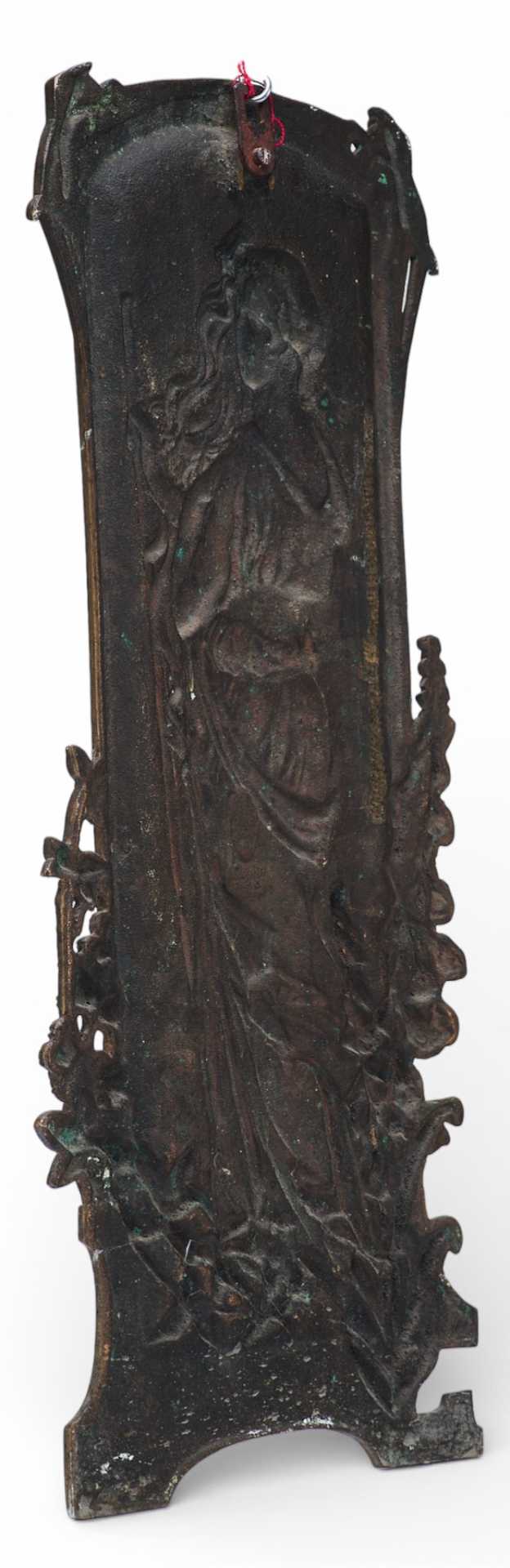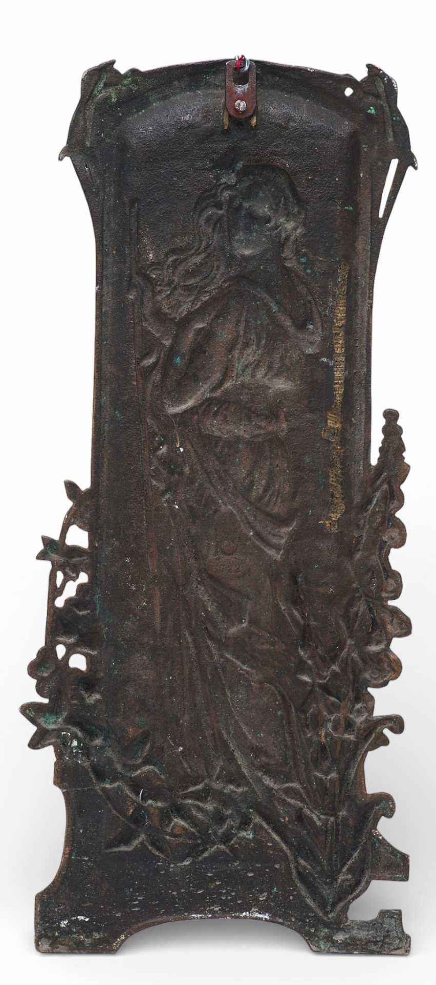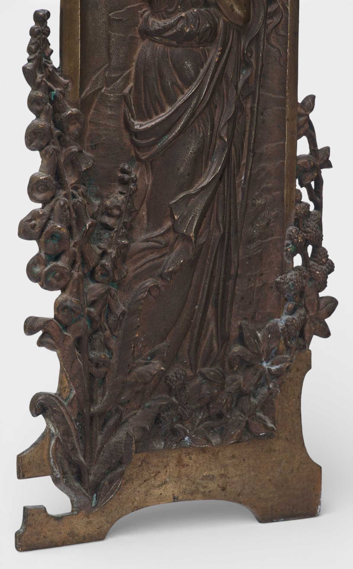 Панно, на котором изображена женщина с посохом в античном хитоне. Художественное оформление предмета соответствует по своим признакам стилю модерн и, вероятно, было создано под влиянием творчества чешского художника эпохи модерна