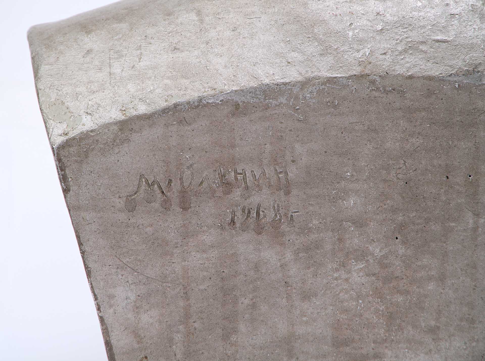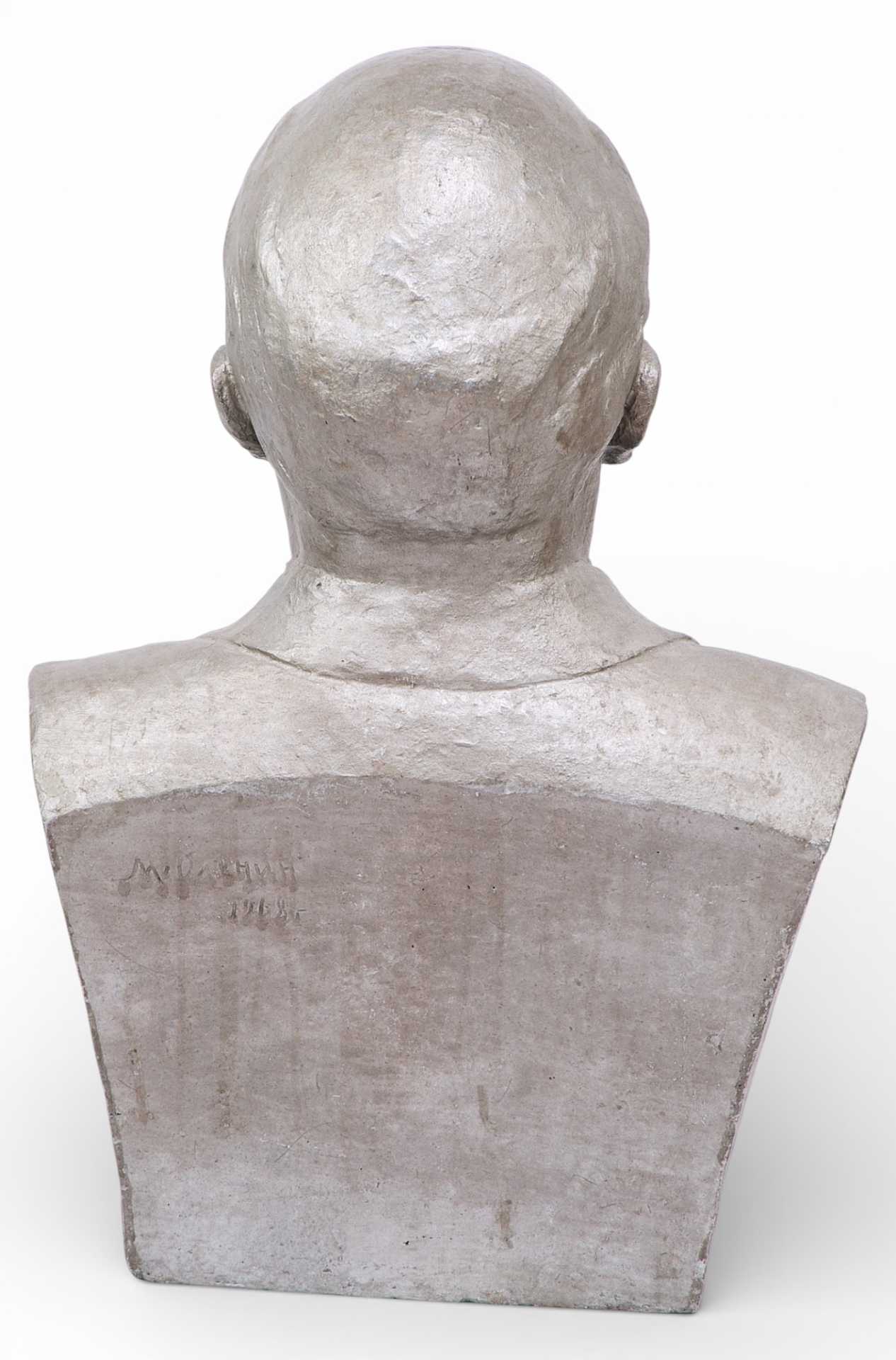Погрудное изображение мужчины с высоким небольшой бородкой с усами, в костюме. Владимир Ильич Ульянов (Ленин) (1870 - 1924) большевик-революционер, организатор РСДРП(б), основатель СССР. Сзади, на срезе спины надпись: “М. Оленин 1968 г”. Оленин Михаил Петрович (1896 - 1970). Родился в Нижнем Новгороде 20 ноября 1896 г. Побочный сын Петра Сергеевича Оленина. Посещал студию рисунка С.Ю. Жуковского; 1914 - студент Училища живописи, ваяния и зодчества по классу скульптора Волнухина.