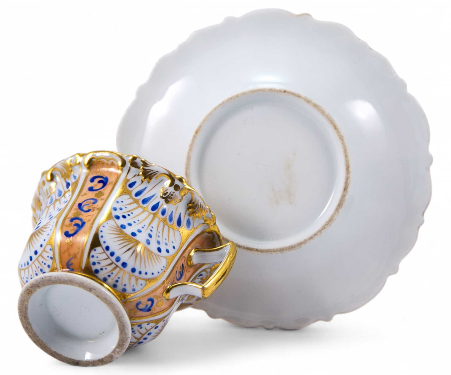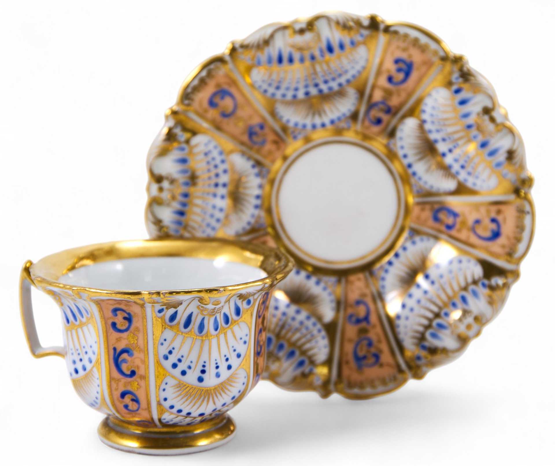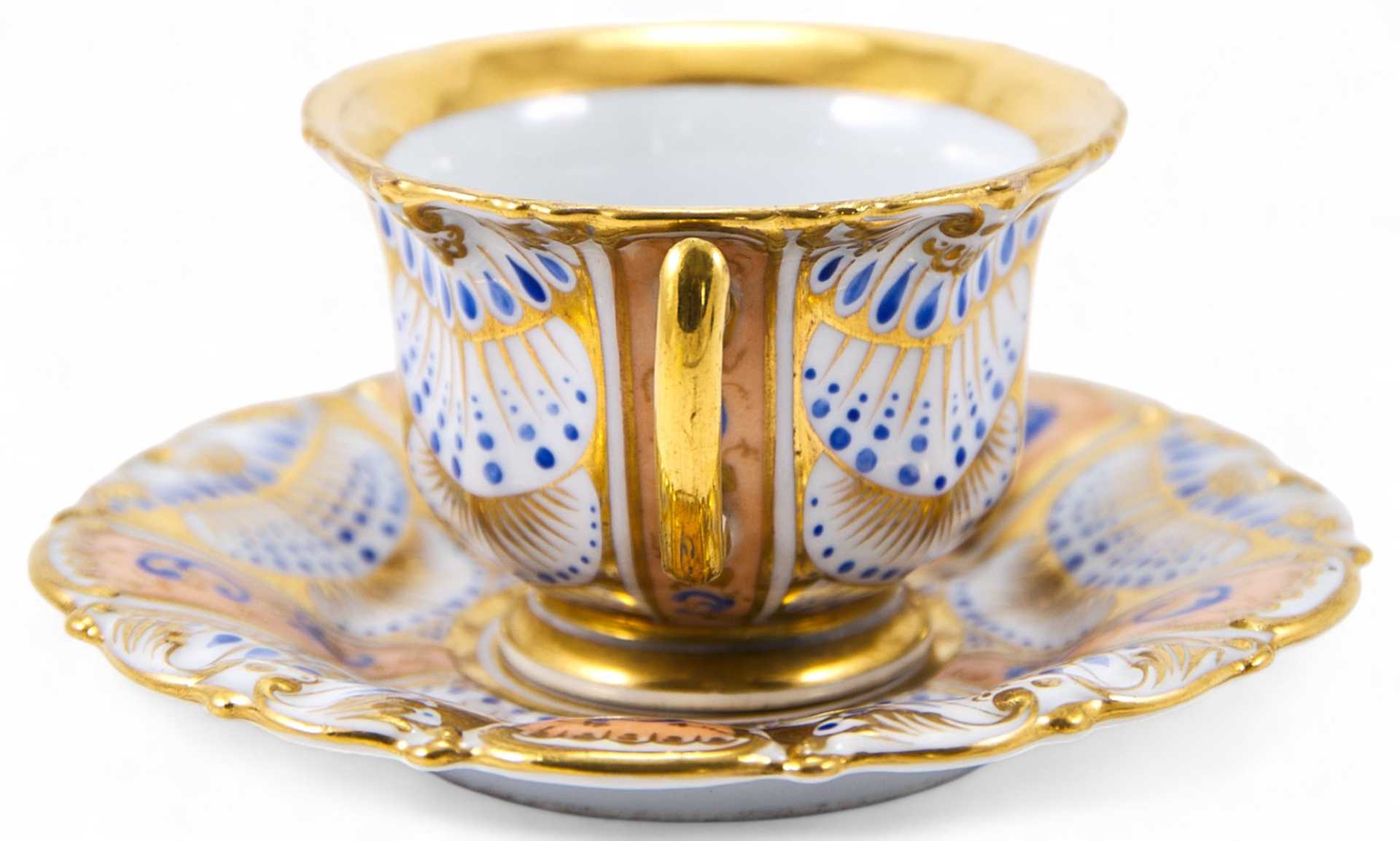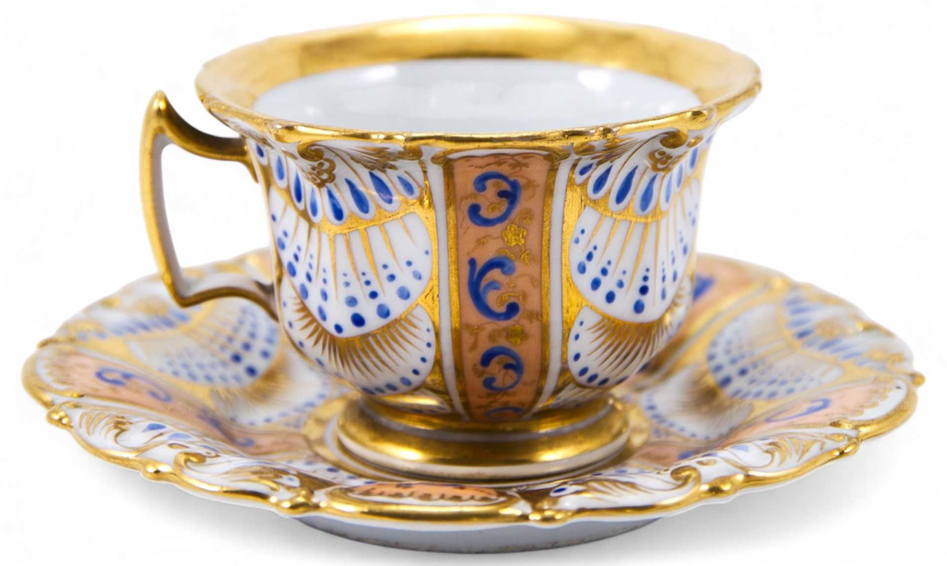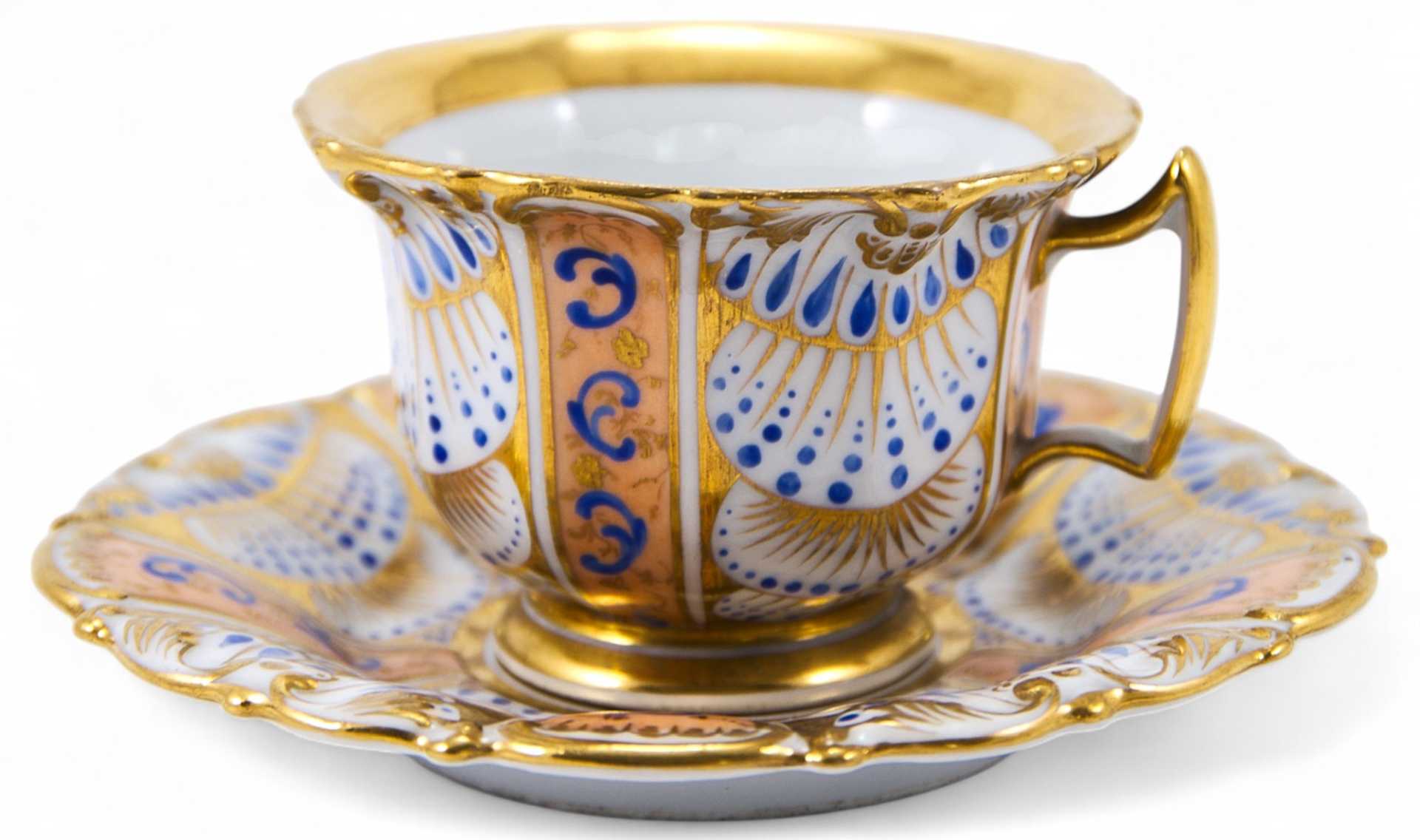 Чайная пара, форма и роспись которой соответствуют чайным парам стиля бидермайер. На основании нары клеймо фарфоровой мапуфактуры Porzeilanfabrik Epiag Ellbogen, ставившееся с 1830-1840 гг. в виде рыцарской руки с мечом вдавленное «в тесто», рядом серийное клеймо - 830, 23 (на блюдце); 839, 33 (на чашке).