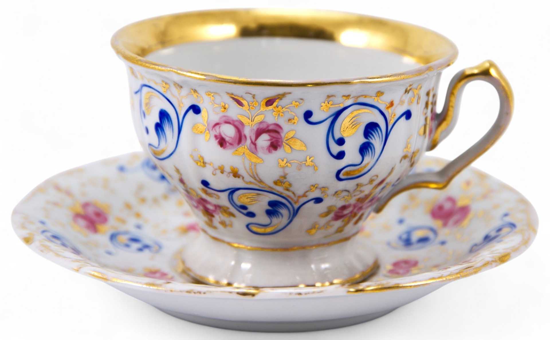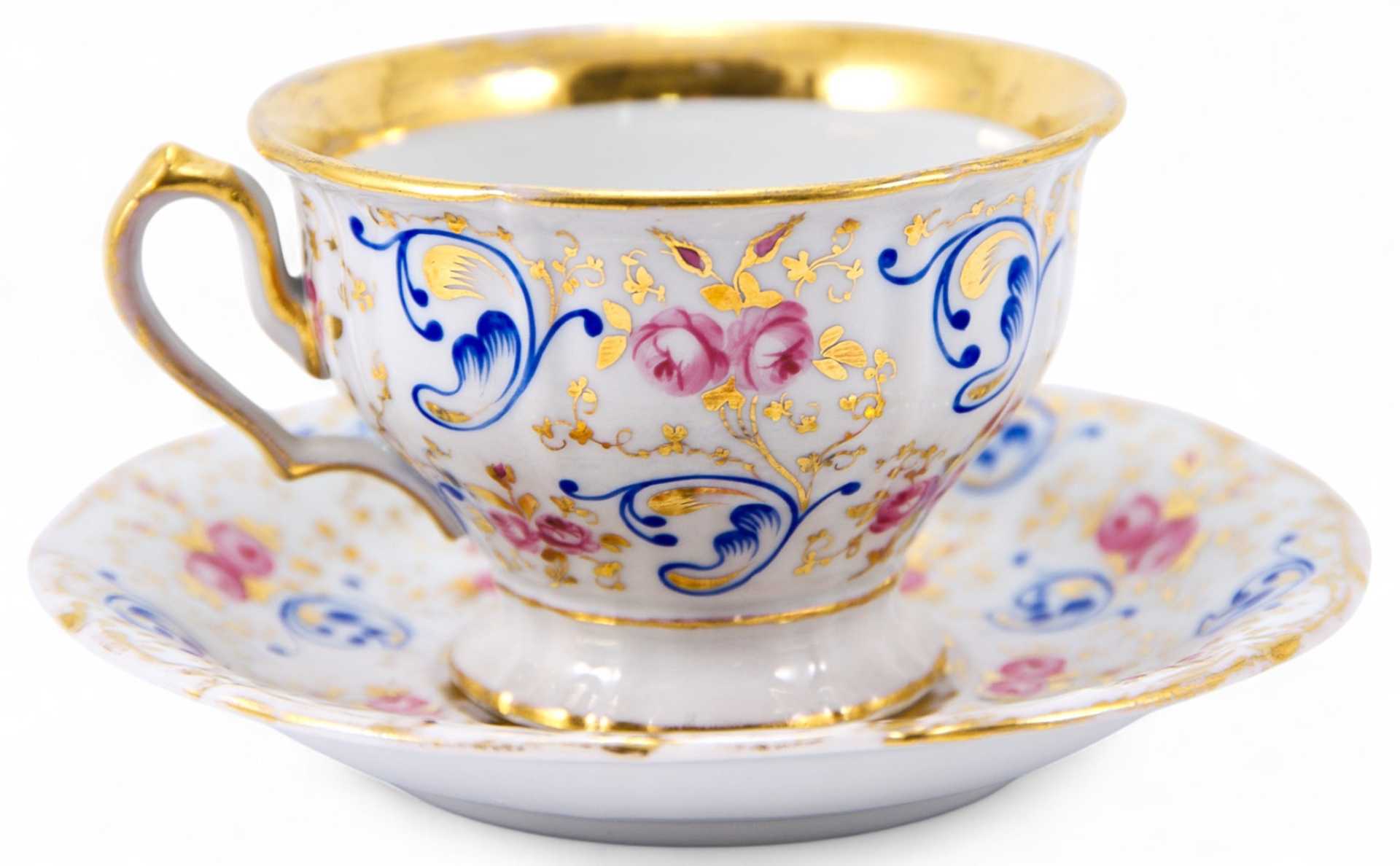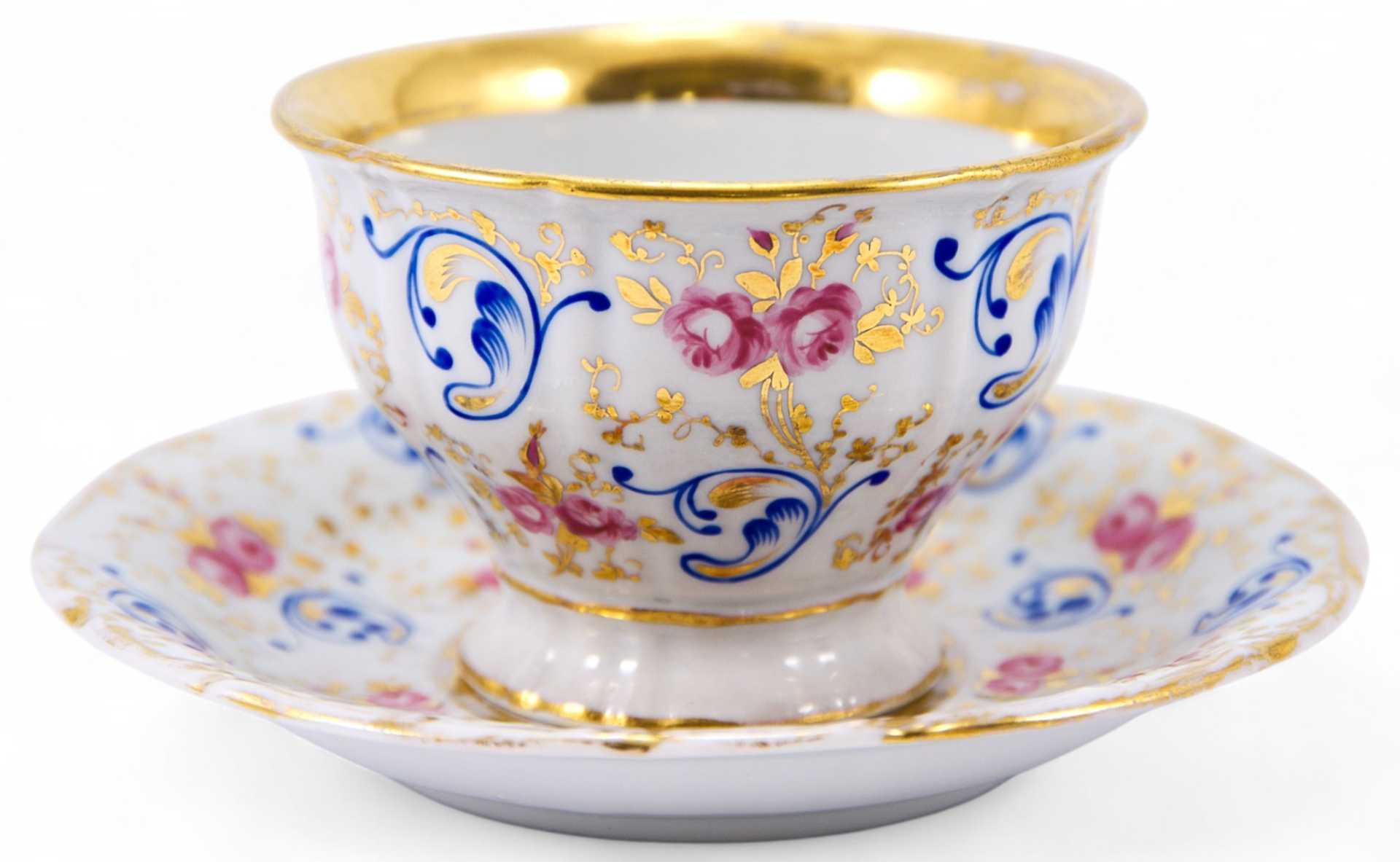 чайная пара, форма которой характерна для середины XIX в., когда форма чашки на высокой подставке и её декоративное оформление часто сочетали в себе стили бидермейера и декоративные элементы нео-рококо. Роспись выполнена в стиле характерном для середины XIX в. На основании пары клеймо фарфоровой мануфактуры Кристиана Фишера ставившееся с 1852 по 1859 гт. в виде вдавленного "в тесто" клейма CF. Фарфоровая мануфактура Кристиана Фишера.