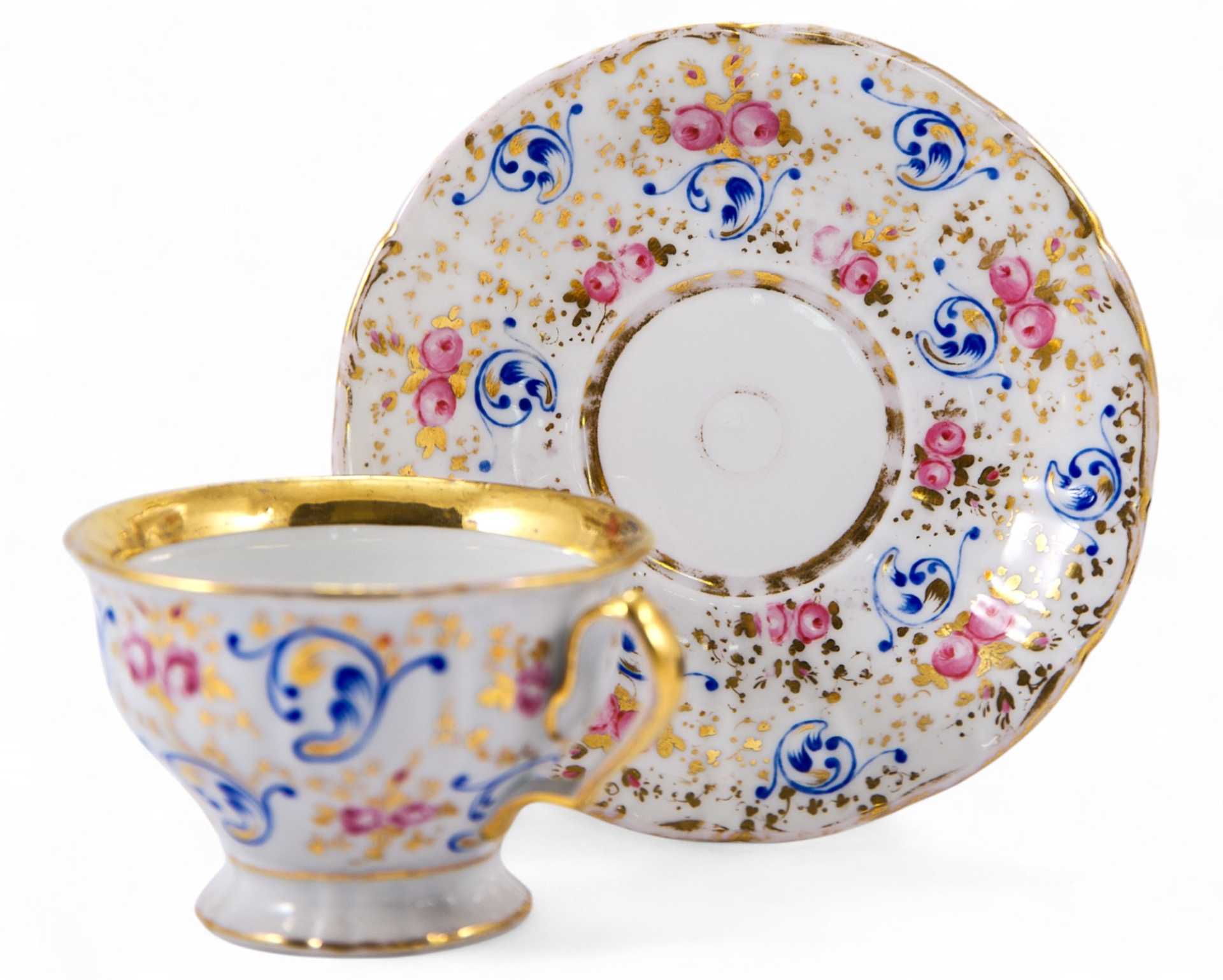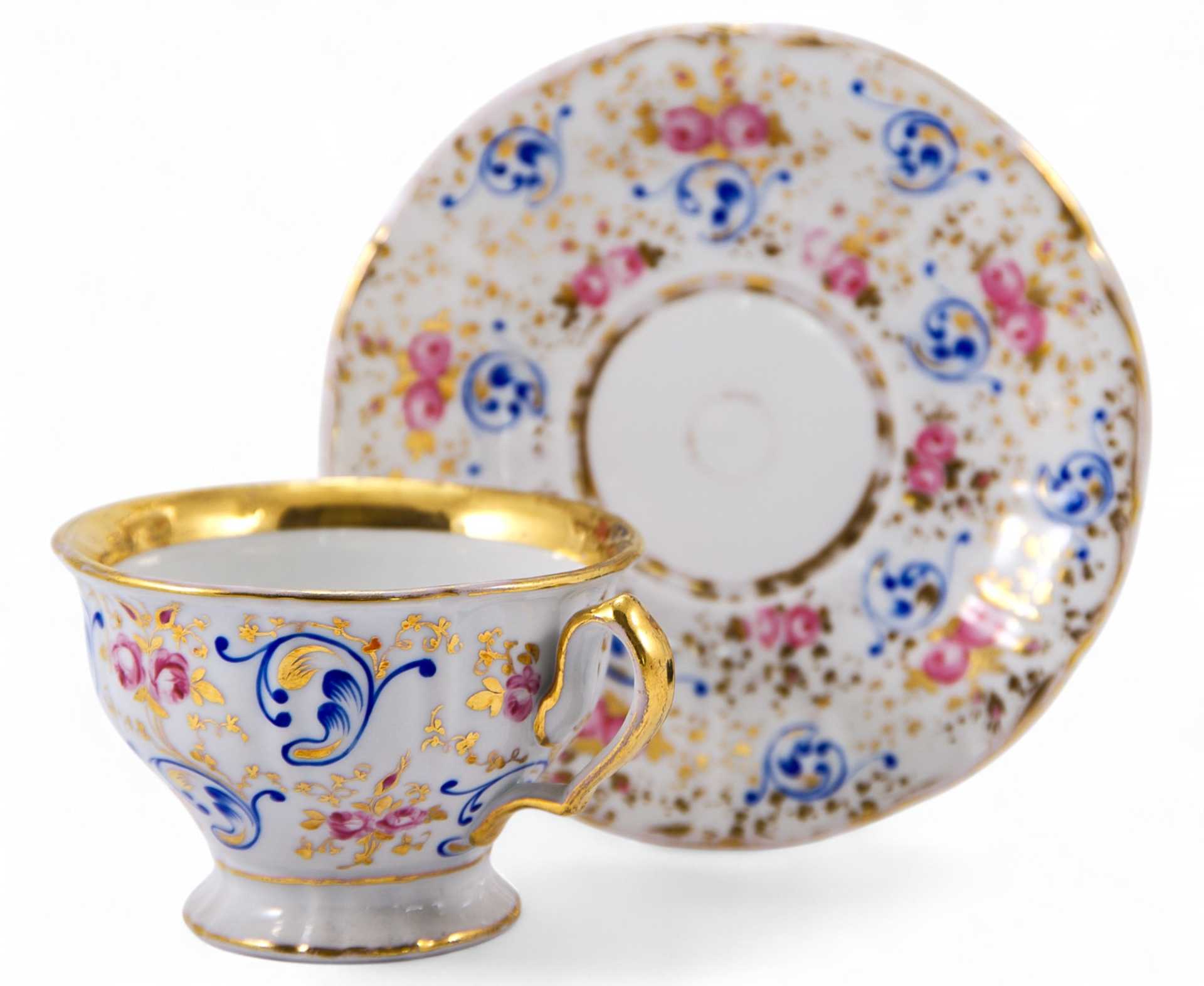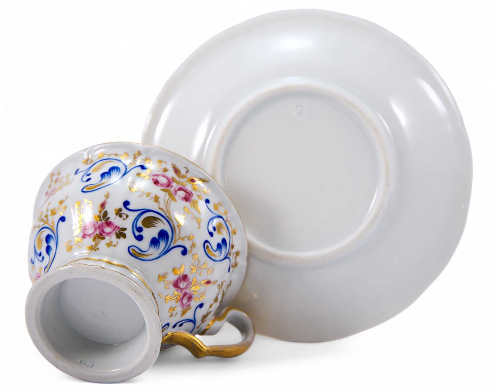 чайная пара, форма которой характерна для середины XIX в., когда форма чашки на высокой подставке и её декоративное оформление часто сочетали в себе стили бидермейера и декоративные элементы нео-рококо. Роспись выполнена в стиле характерном для середины XIX в. На основании пары клеймо фарфоровой мануфактуры Кристиана Фишера ставившееся с 1852 по 1859 гт. в виде вдавленного "в тесто" клейма CF. Фарфоровая мануфактура Кристиана Фишера.