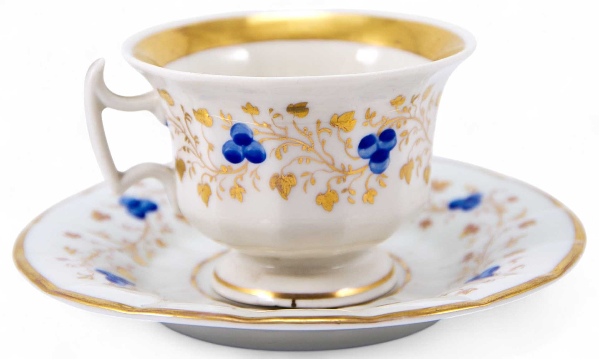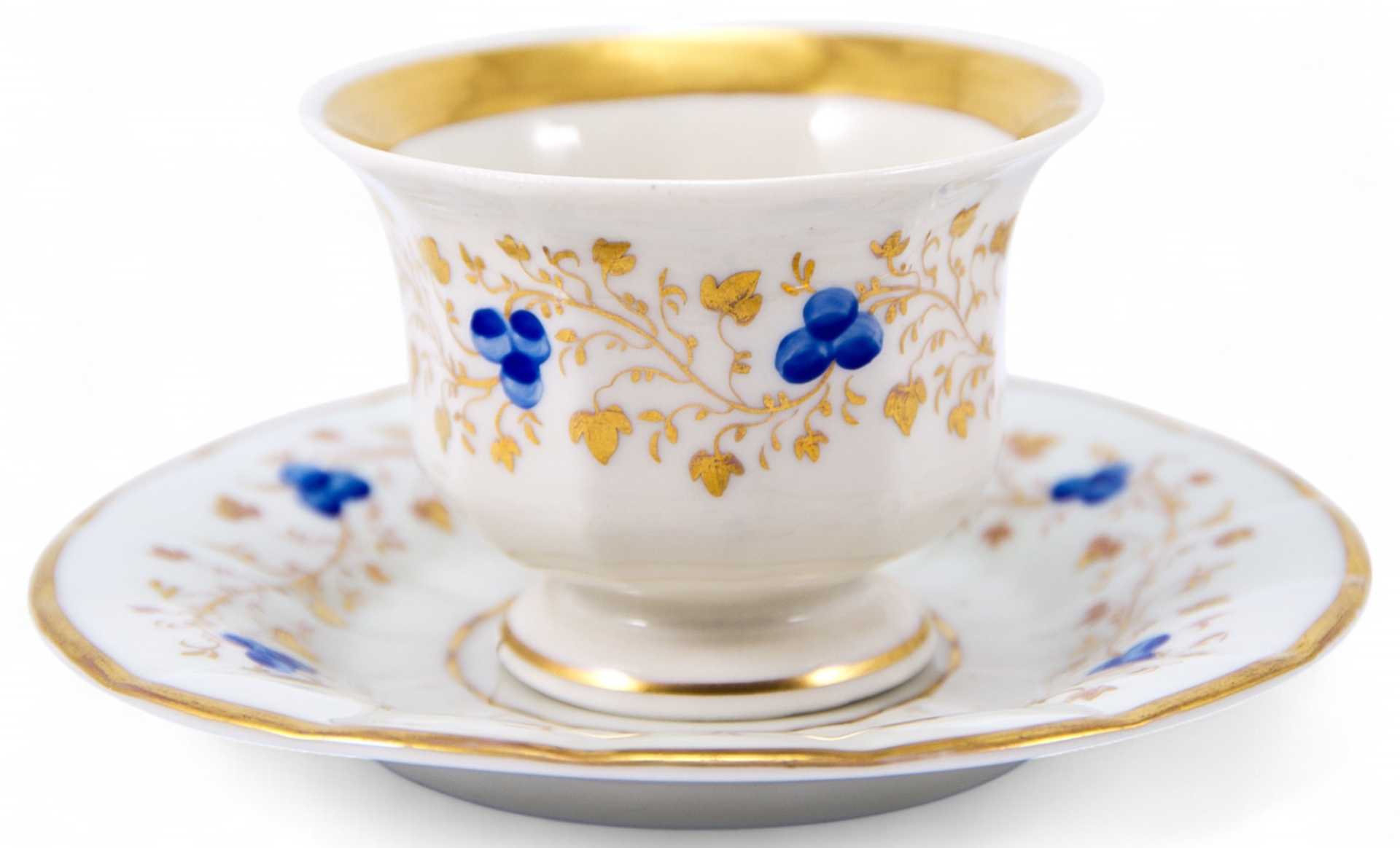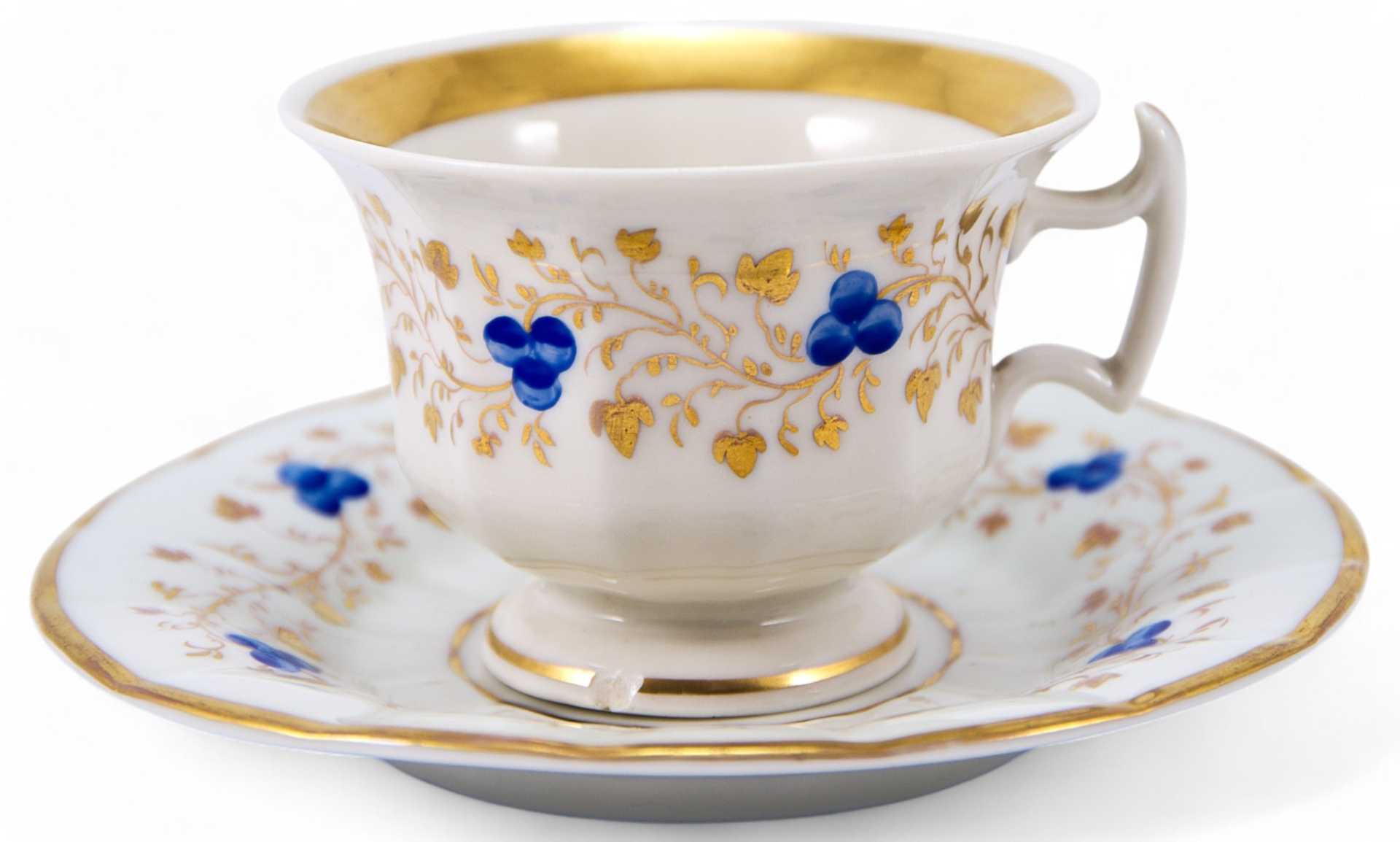 Чайная пара, форма которой характерна для середины XIX в., когда форма чашки на толстой подставке и её декоративное оформление сочетают в себе стили бйдермейера и нео-рококо. Роспись выполнена в стиле эклектики, характерной для второй половины ХЕХ в., однако уровень живописного оформления, цвета и линии указывают на то, что чайная пара