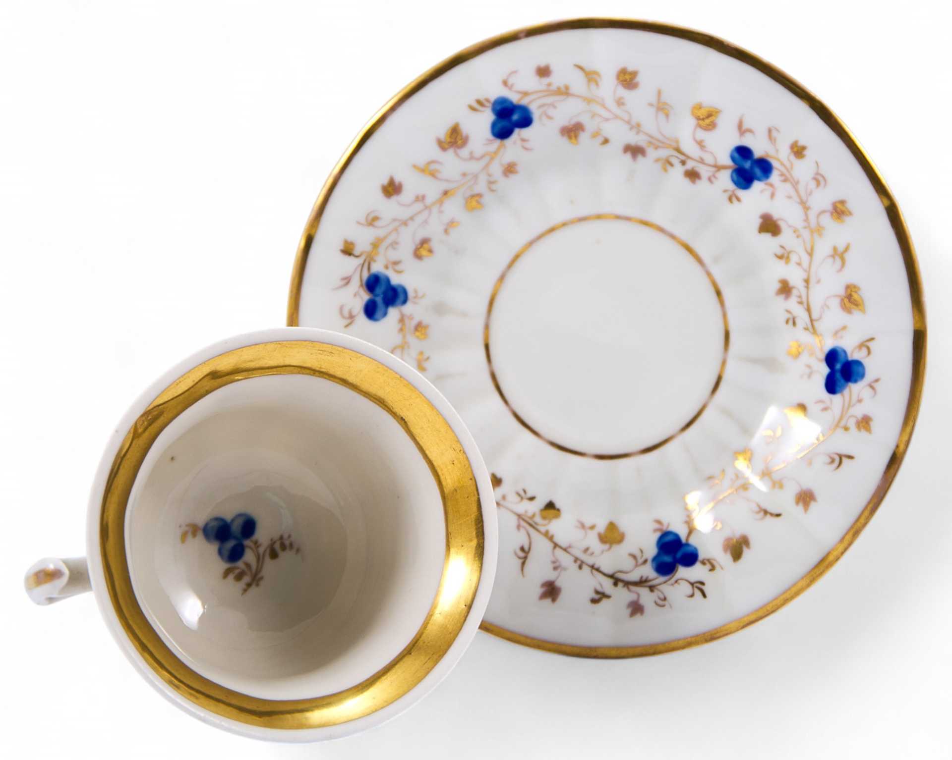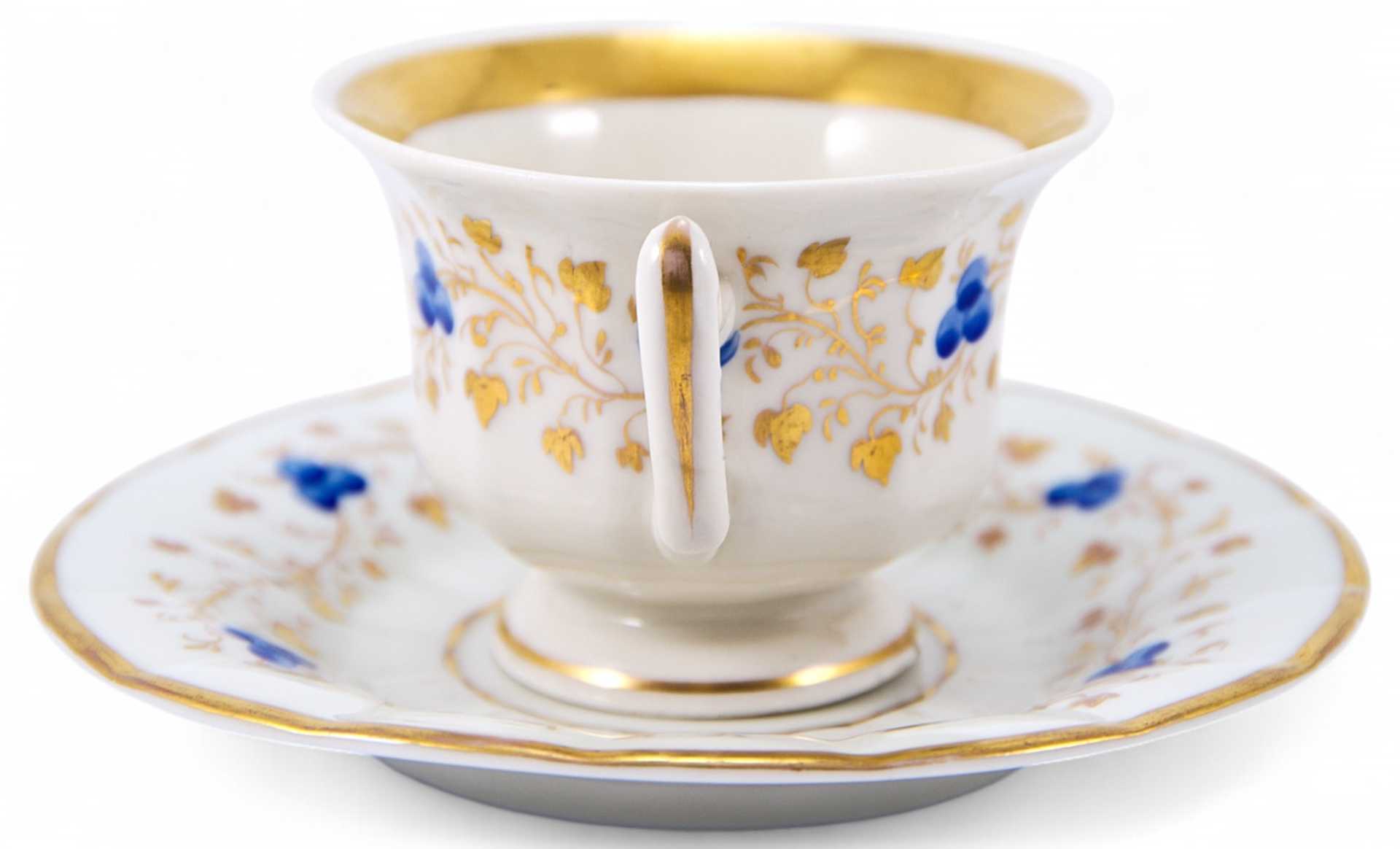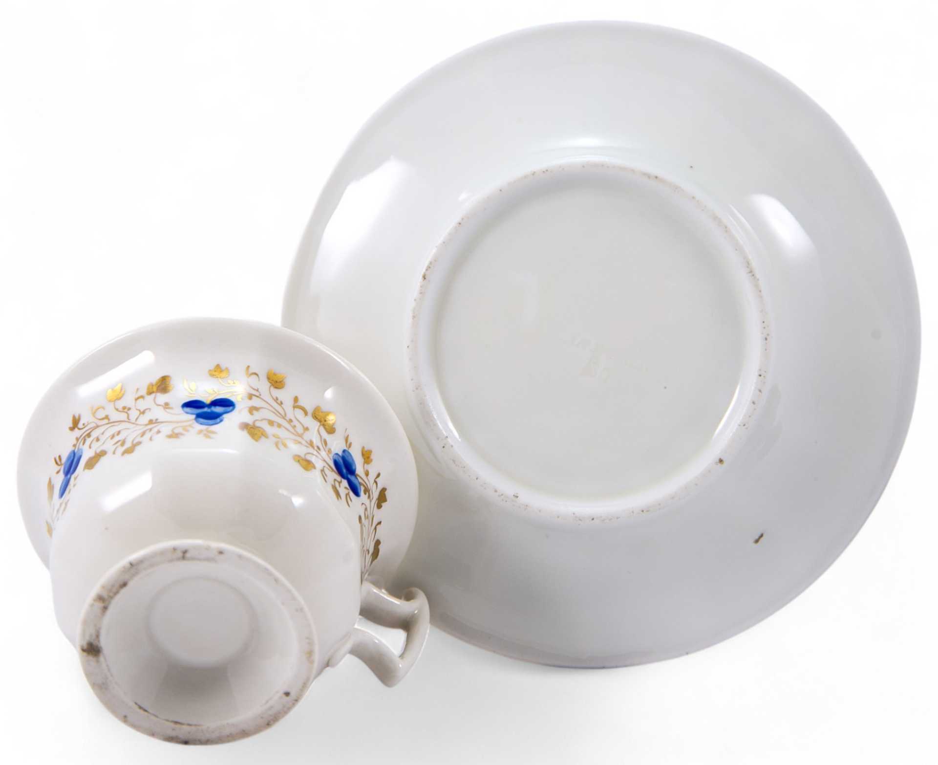Чайная пара, форма которой характерна для середины XIX в., когда форма чашки на толстой подставке и её декоративное оформление сочетают в себе стили бйдермейера и нео-рококо. Роспись выполнена в стиле эклектики, характерной для второй половины ХЕХ в., однако уровень живописного оформления, цвета и линии указывают на то, что чайная пара