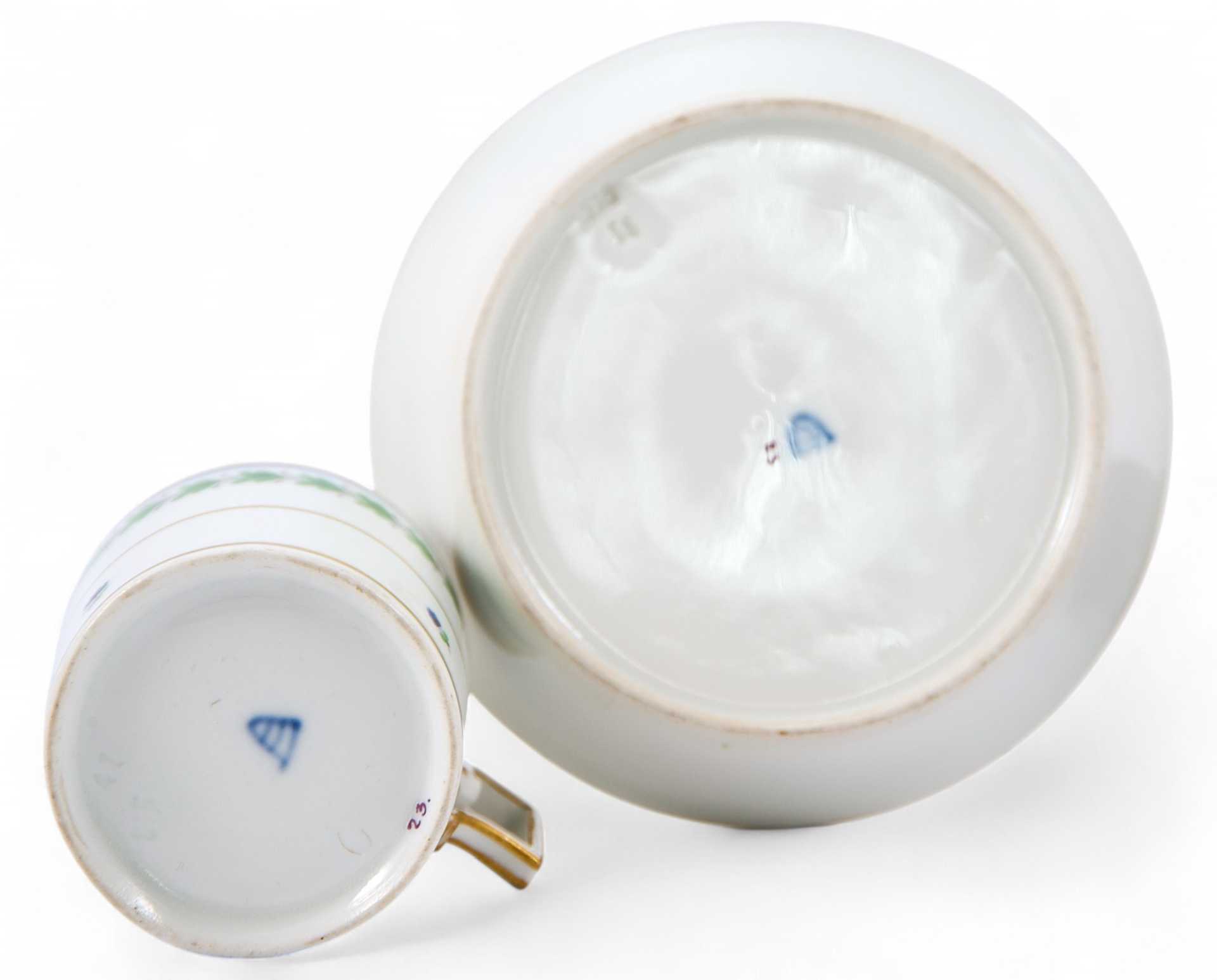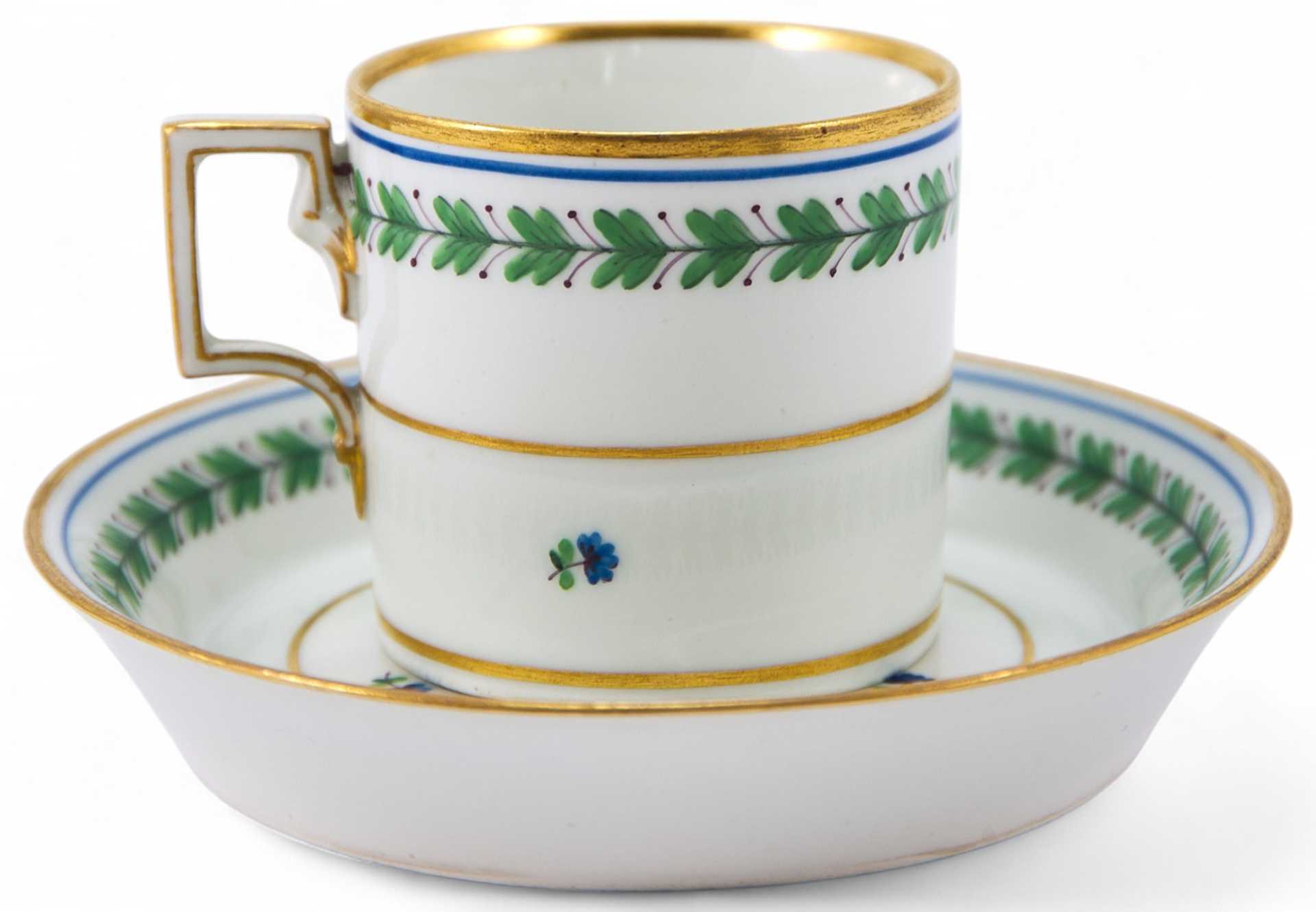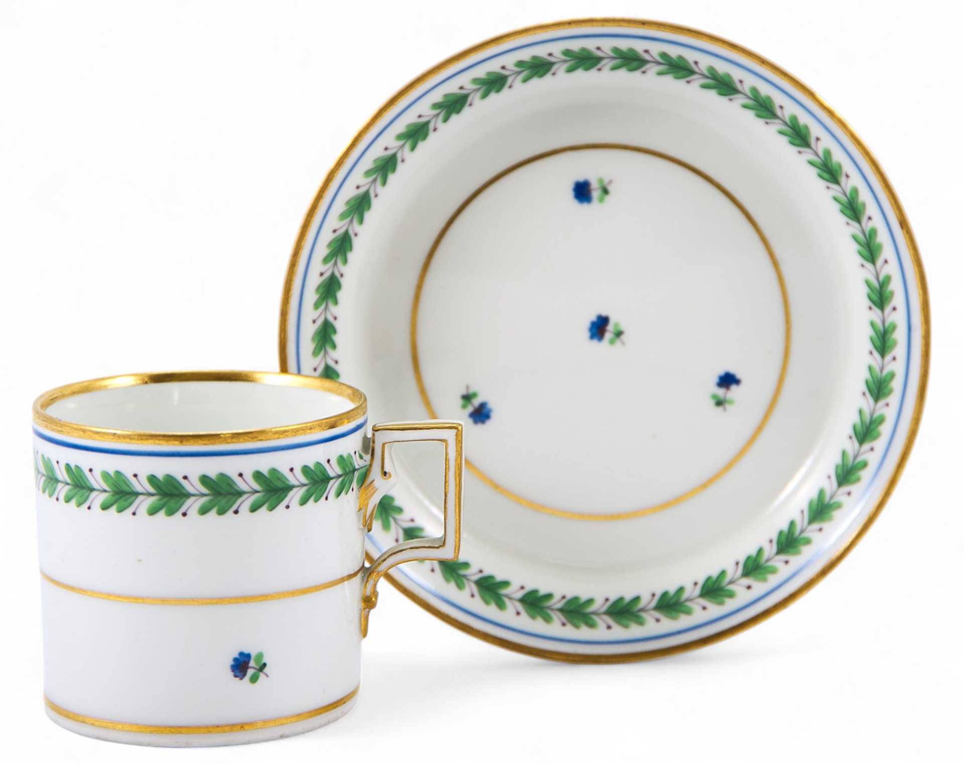 Представлена чайная пара, форма и роспись которой соответствуют стилю ампир (первая четверть XIX в.)- Простые, лаконичные строгие формы, ориентирующиеся на античное наследие европейской культуры, соответствуют принципам этого стиля. Края чашки и блюдца украшены стилизованным античным фризом; «нижнее» декоративное поле украшают разбросанные синие цветочки.