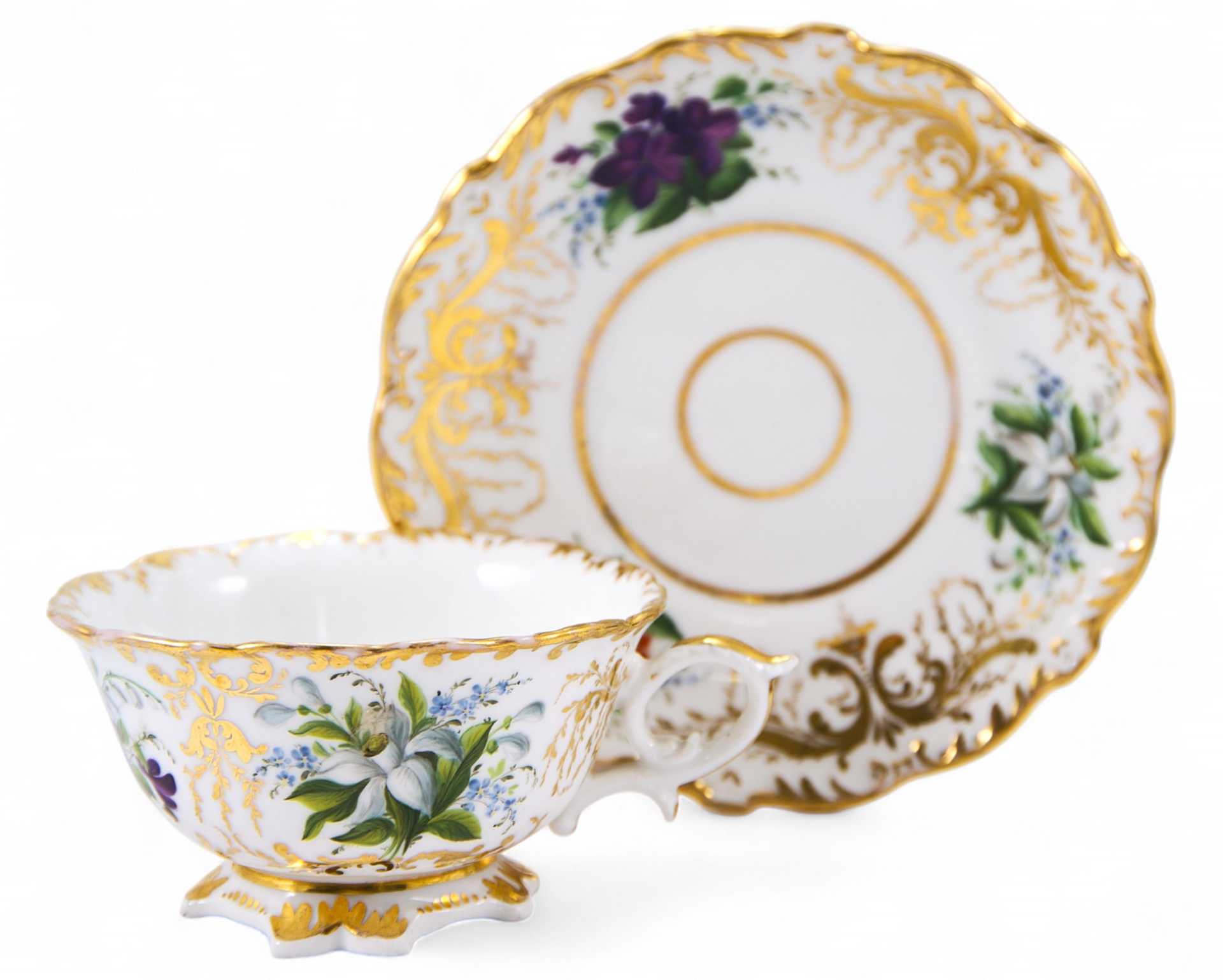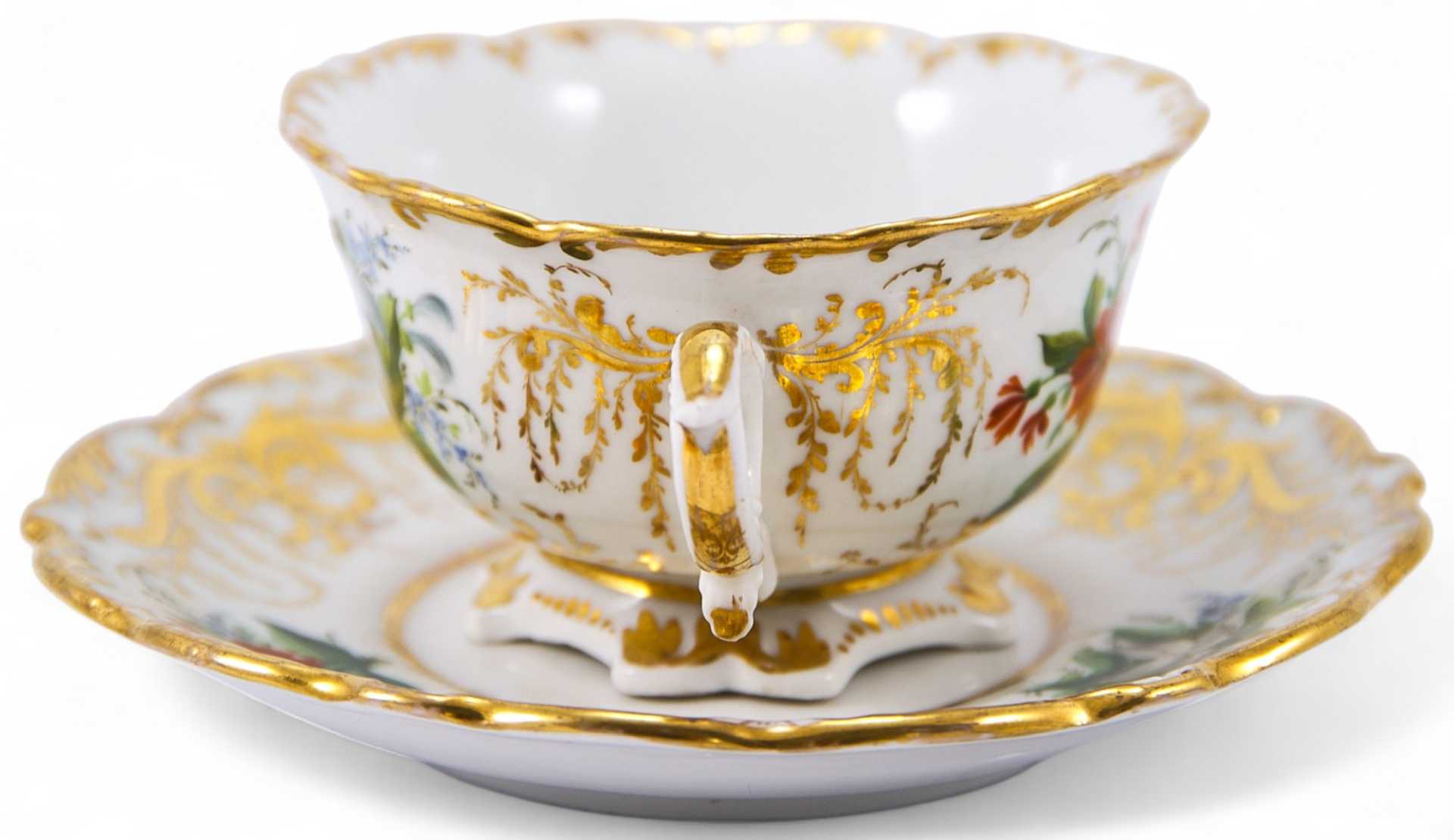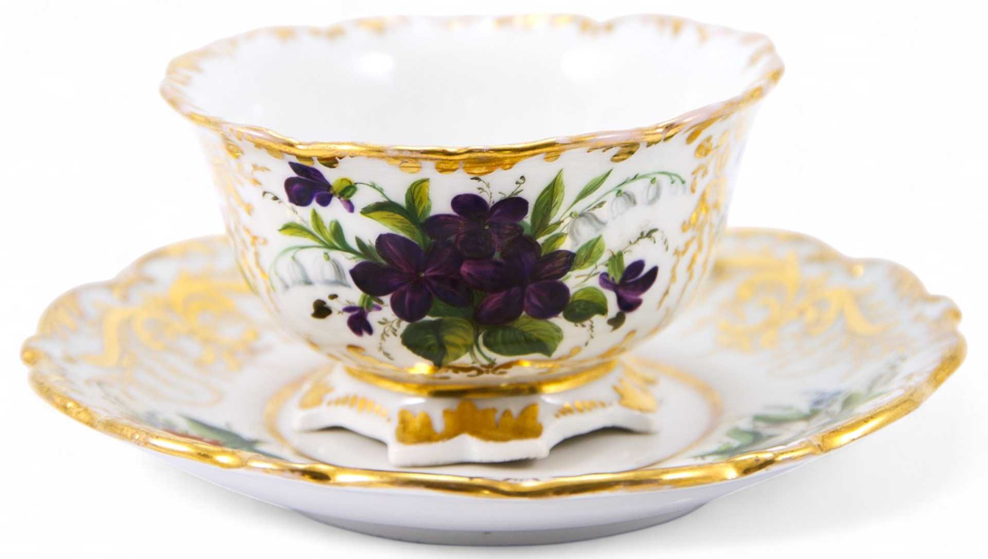 Представлена чайная пара, форма которой характерна для середины XIX в., когда форма чашки на толстой подставке и eč декоративное оформление сочетают в себе стили бидермейера и нео-рококо. В росписи использованы изображения фиалок, лилий, гвоздик и маргариток - это традиционные символы невинности, чистоты, победы и любви Уровень