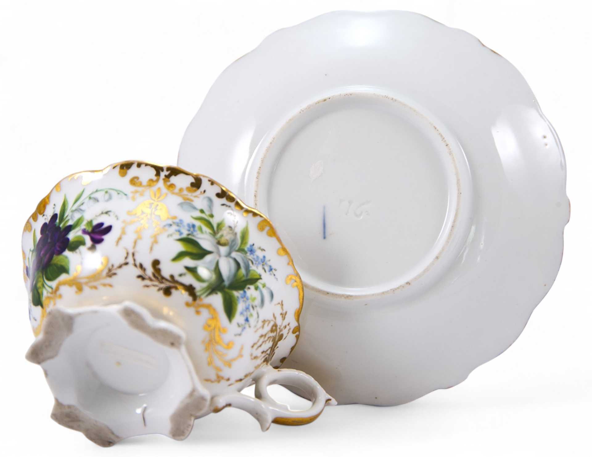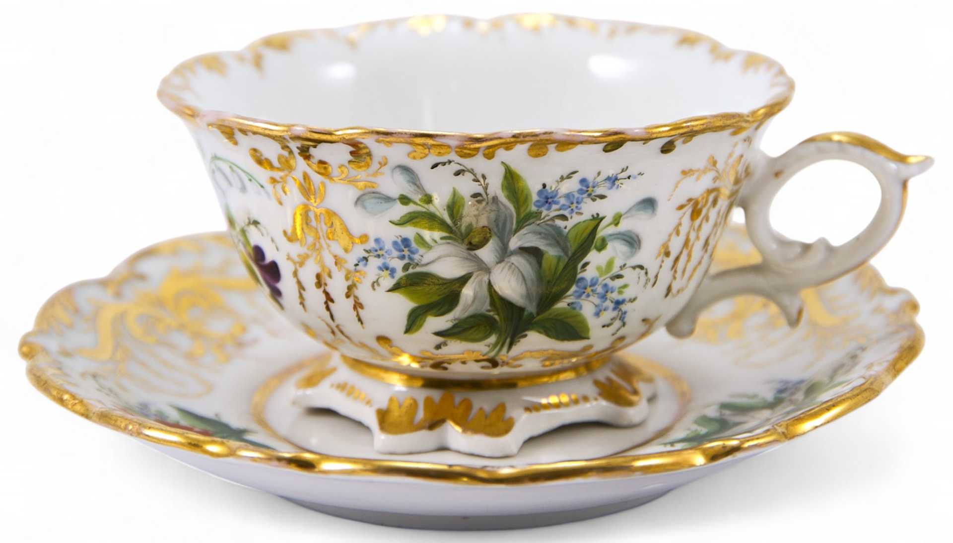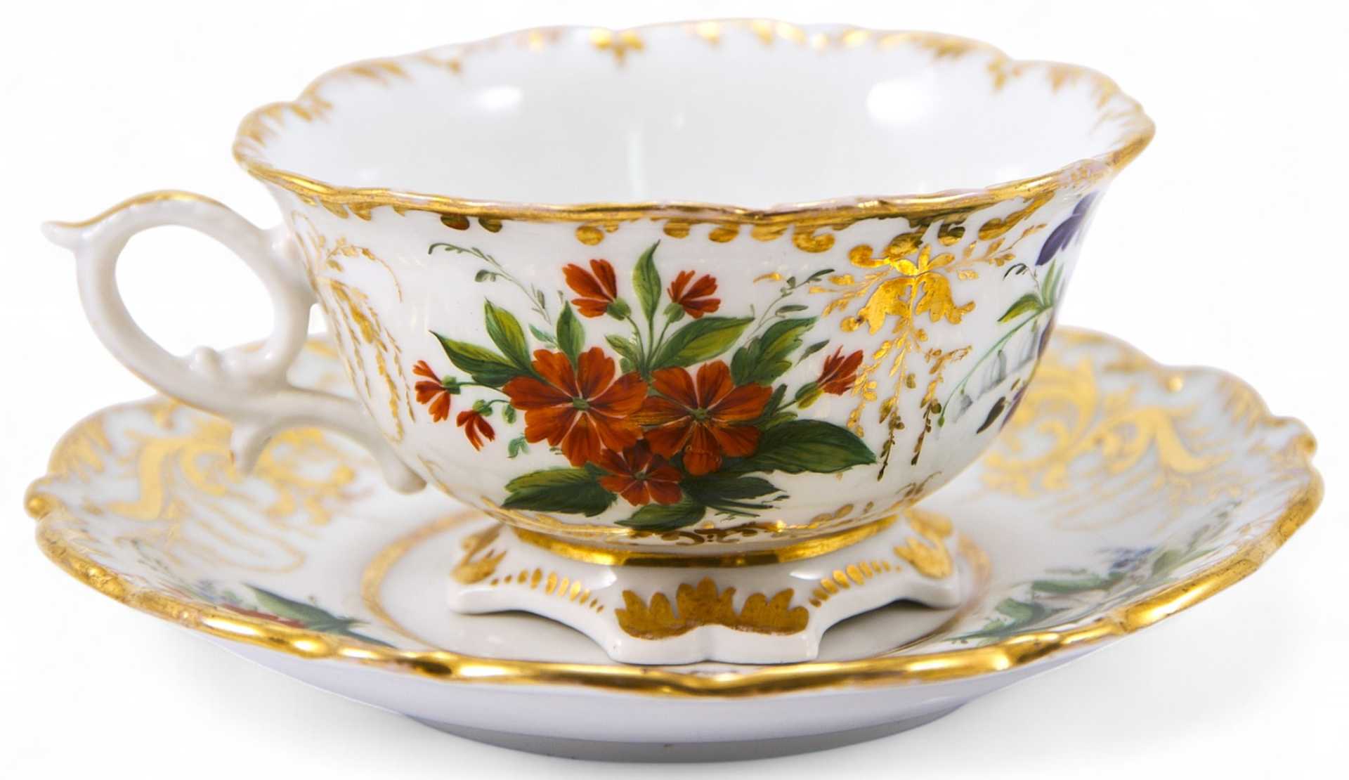 Представлена чайная пара, форма которой характерна для середины XIX в., когда форма чашки на толстой подставке и eč декоративное оформление сочетают в себе стили бидермейера и нео-рококо. В росписи использованы изображения фиалок, лилий, гвоздик и маргариток - это традиционные символы невинности, чистоты, победы и любви Уровень