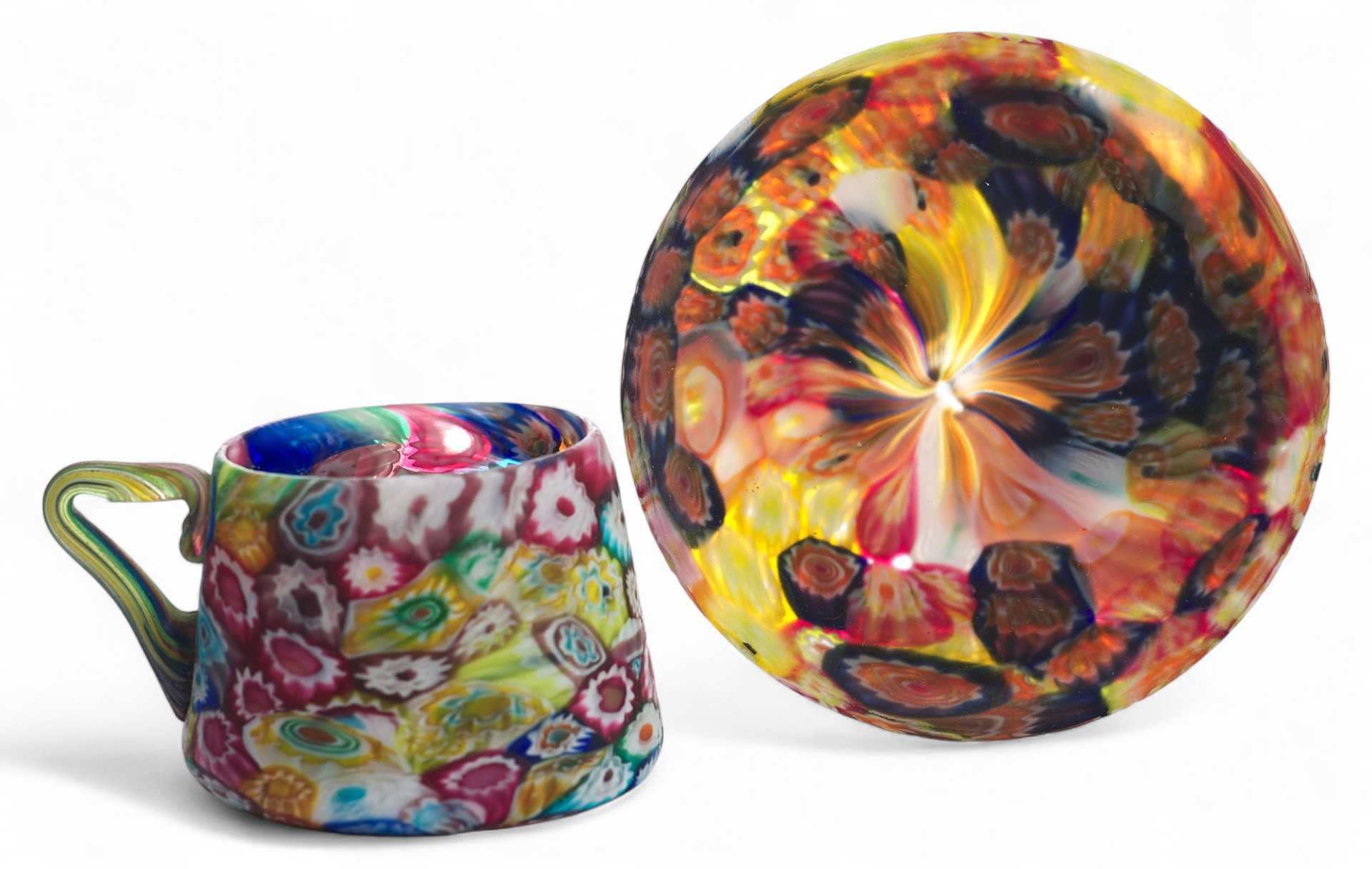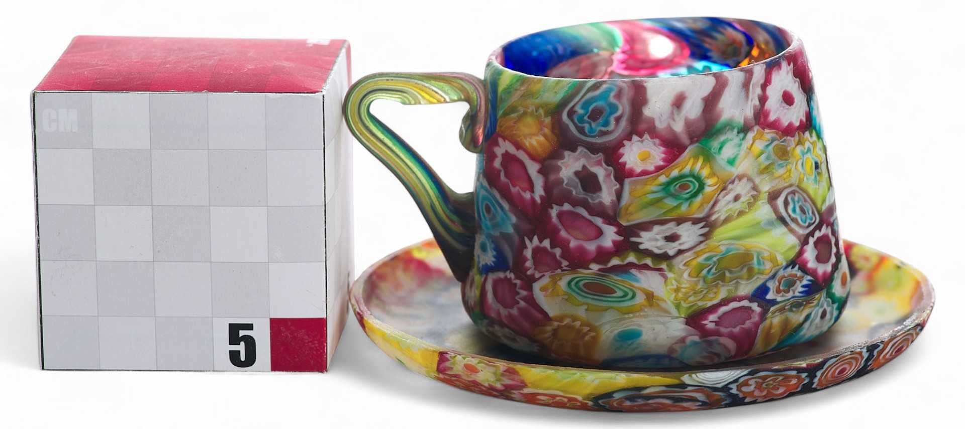 Представленная на экспертизу чайная пара сделана из цветного мозаичного муранского стекла, в традиционной для муранской продукции технике mílie fiori (милле фиори). Милле фиори делают путём введения в толщу стекла скрученных