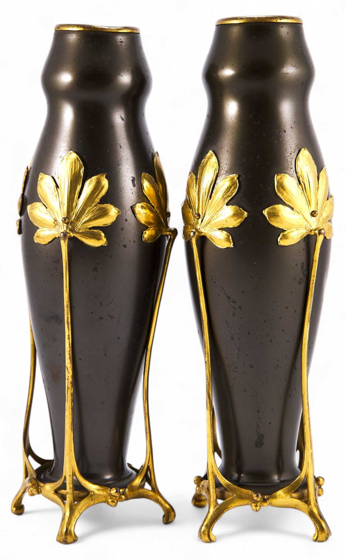 Представленные парные вазы выполнены из шпиатра в стилистике интернационального модерна, покрыты темно-коричневой глянцевой патиной и украшены золоченым накладками, переходящими в фигурные основания. Тулова ваз обтекаемой формы, они эффектно контрастируют с декором как по цветовой гамме, так и по фактуре (накладки рельефные, выполнены на растительные мотивы).