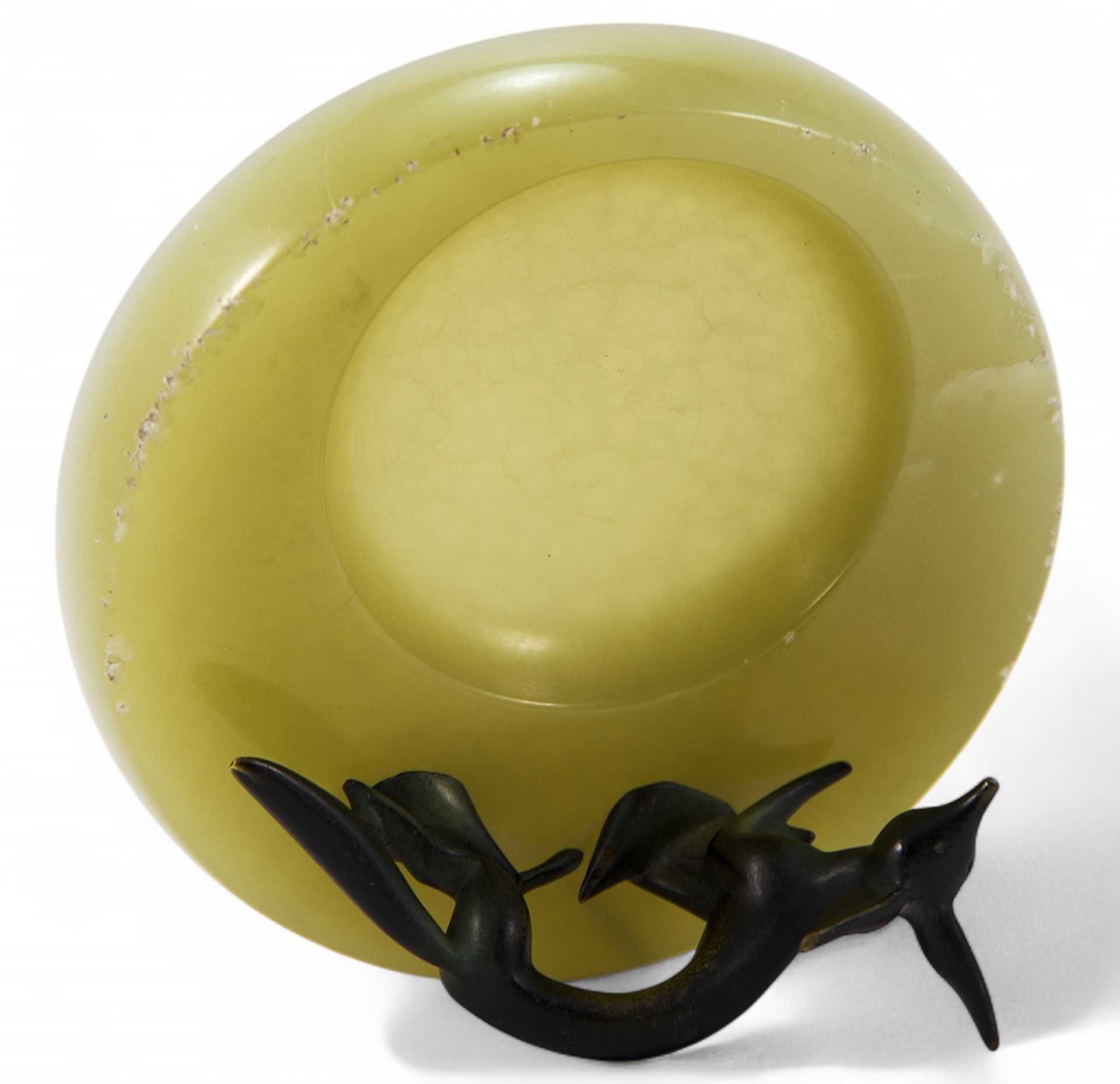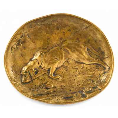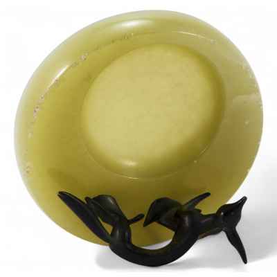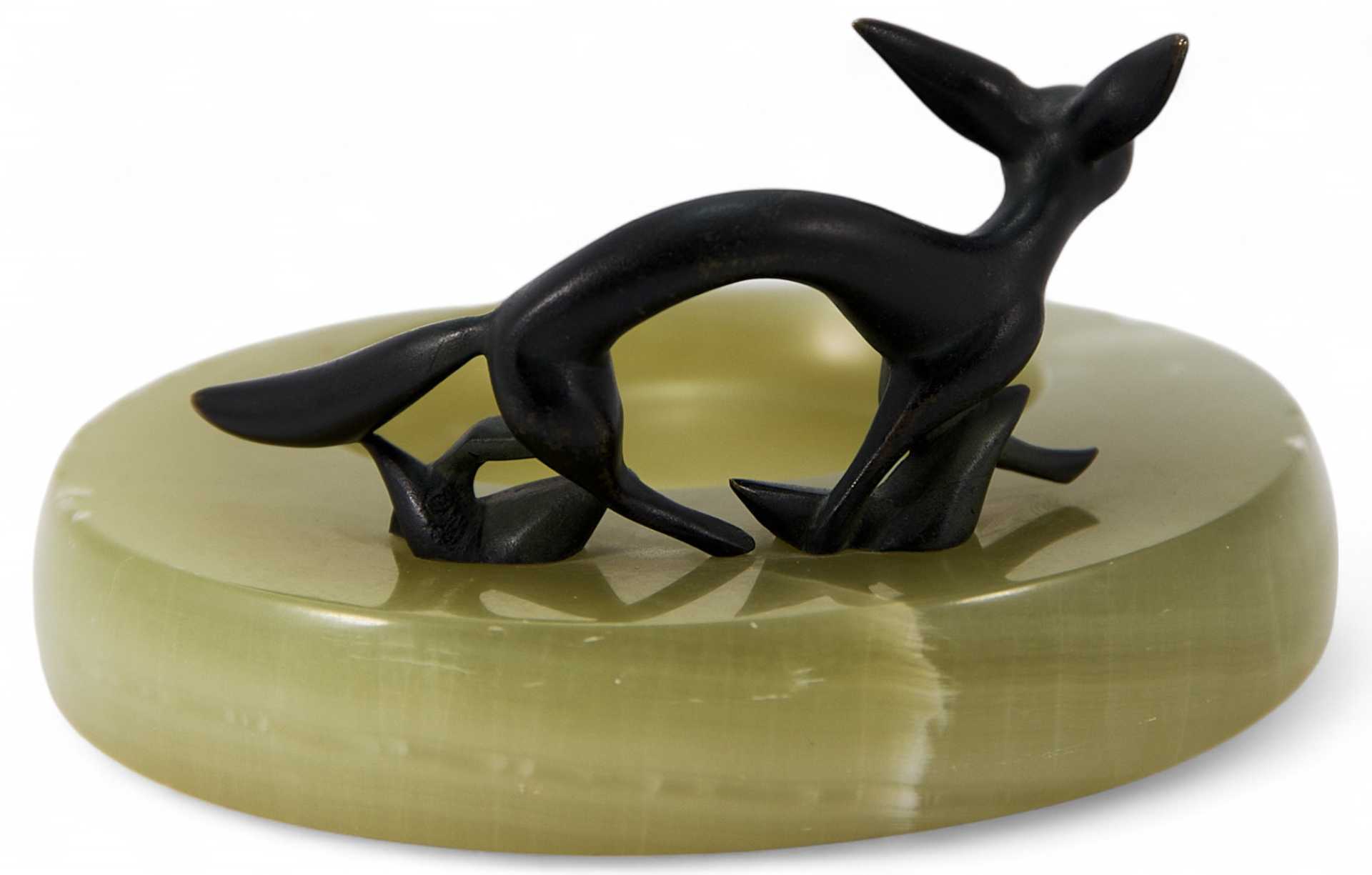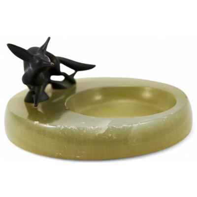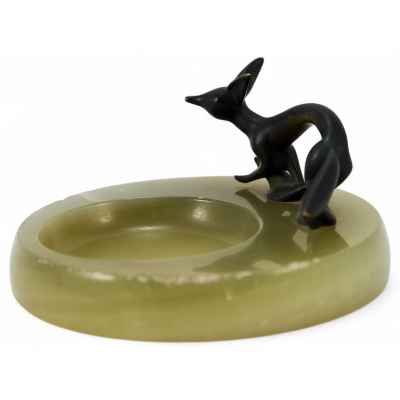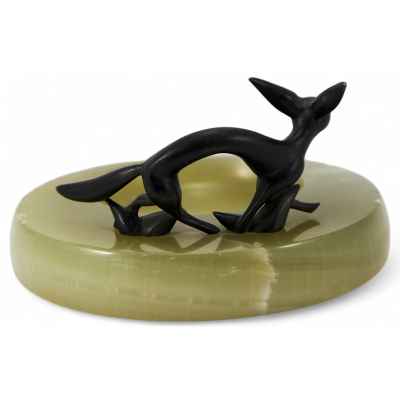 Плоская вазочка из оникса с фигуркой лисы, выполненной из бронзы. Лиса изображена в движении, как будто она готовится к