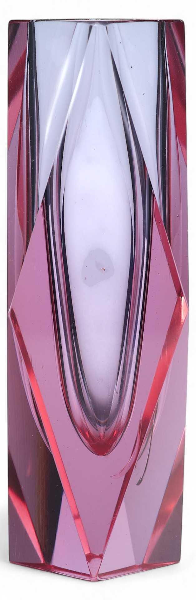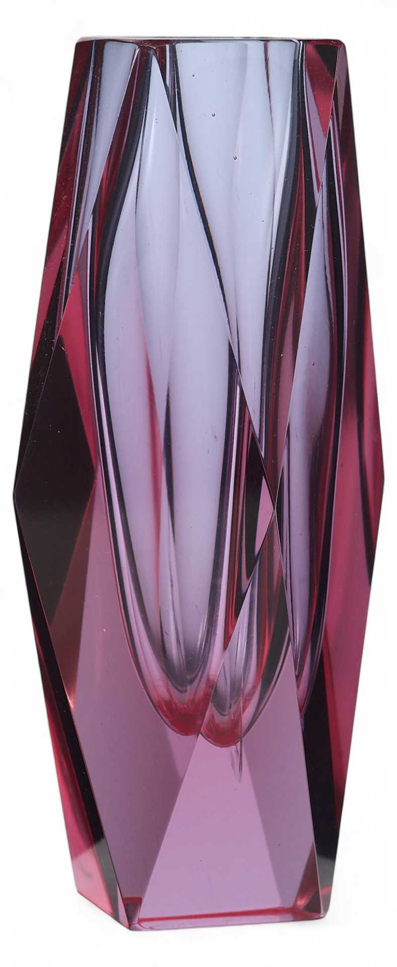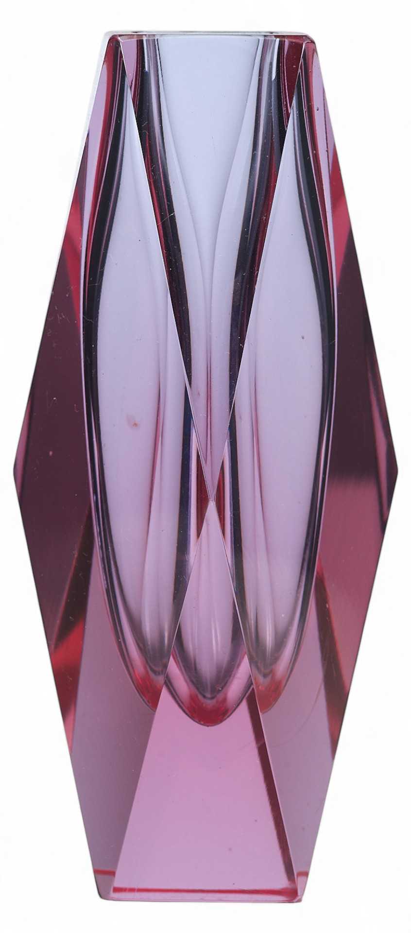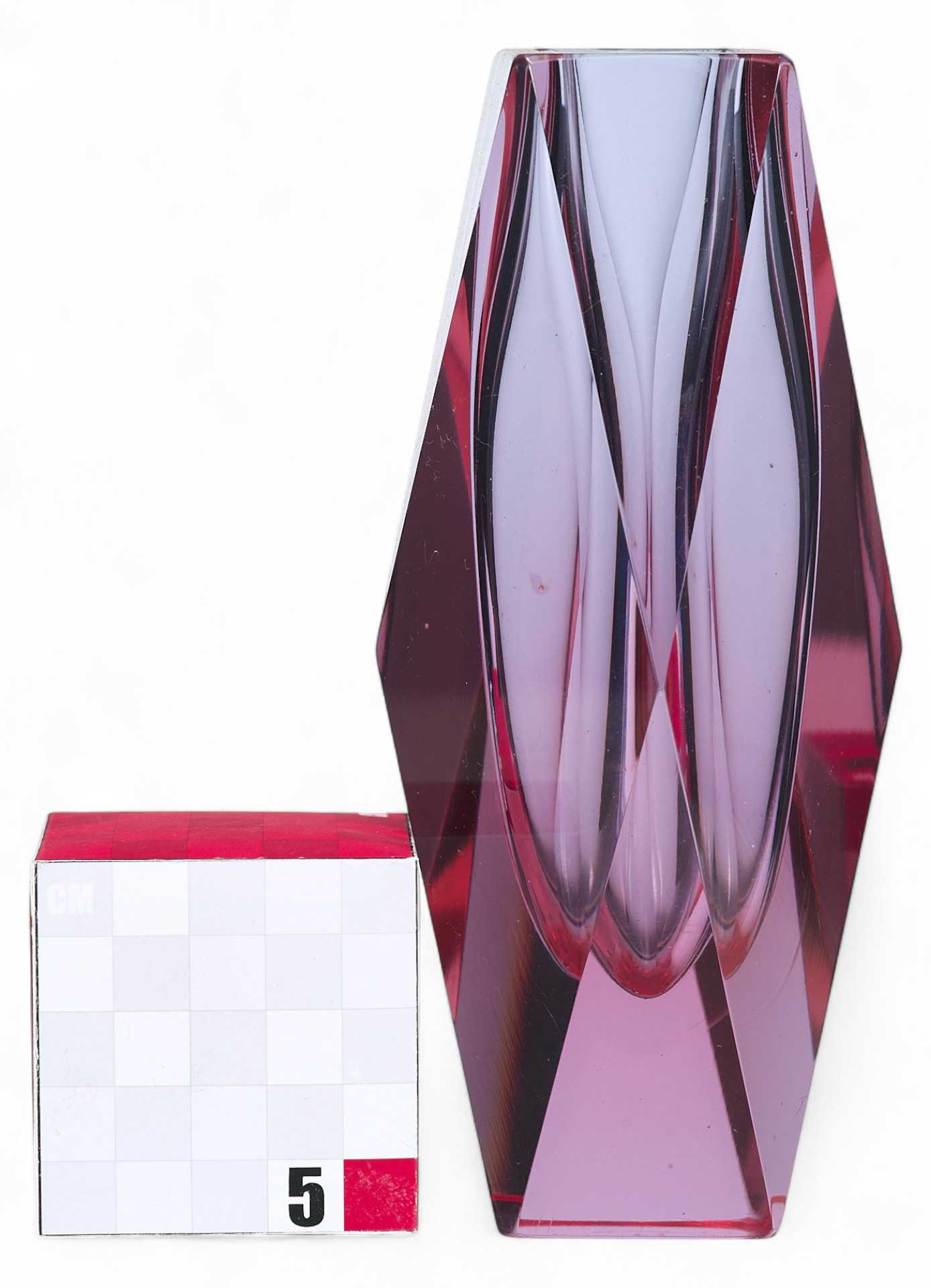 Ваза из цветного стекла бордового цвета. Поверхность вазы огранена. Огранка значительно усиливает явления преломления, отражения и дисперсии света, которые вызывают игру и блеск ограненного стекла. Так. в результате огранки ваза превращается в сверкающий самоцвет. Толщина и качество обработки стекла позволяют предположить, что ваза изготовлена в Мурано. Стеклоделие, как организованный промысел, зародилось в Венеции в ѴШ веке. В 1291 году городской совет решил вынести мастерские по производству украшений на остров Мурано, чтобы уберечь секреты мастеров от конкурентов и избавиться от пожаров, которые могли быть вызваны раскаленными горнами мастеров. Самым удобным местом для этого была признана группа островков в Венецианском заливе, объединенных в остров Мурано, он и стал идеальным местом для производства стекла с точки зрения контроля за ремесленниками и сохранением профессиональной тайны. С 1970-х годов муранское стекло по всему миру признается элитным товаром. Муранские стеклоделы смогли пережить немало исторических перипетий и экономических кризисов. Они сберегли большую часть старинных технологий, избежали и автоматизации производства в ходе промышленной революции. При этом современные стеклодувы широко используют и предметный дизайн, и авангардные формы.