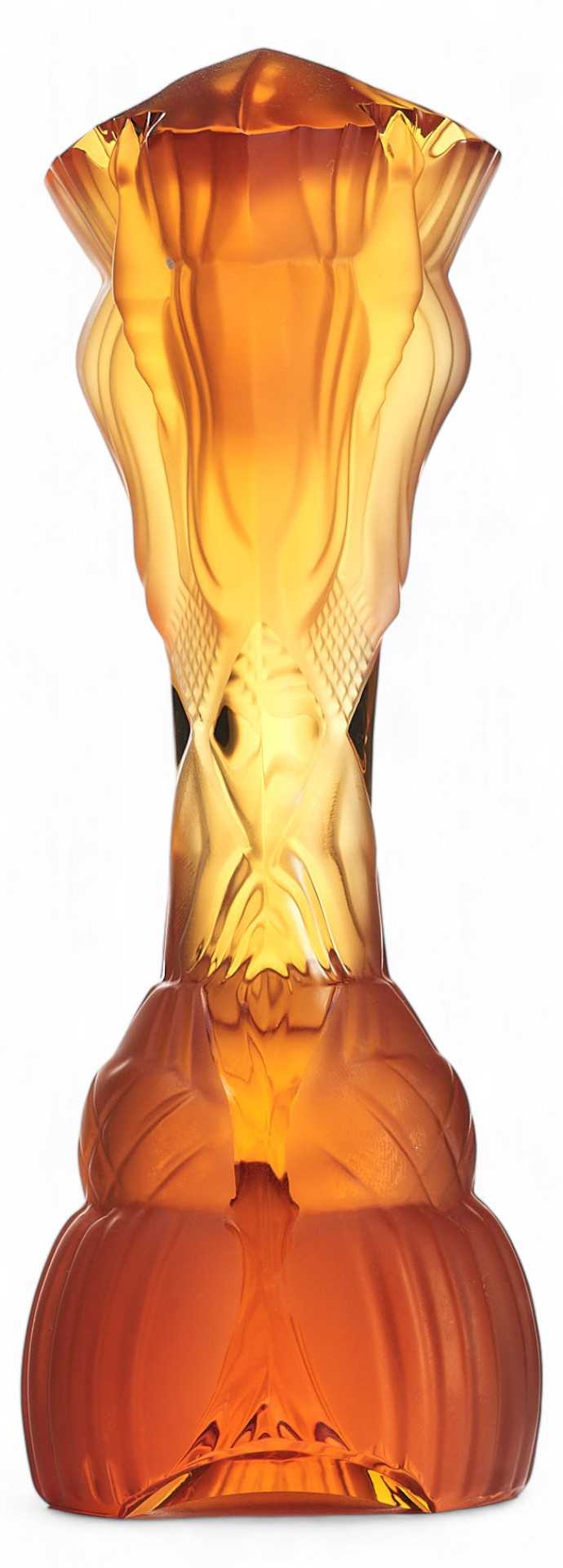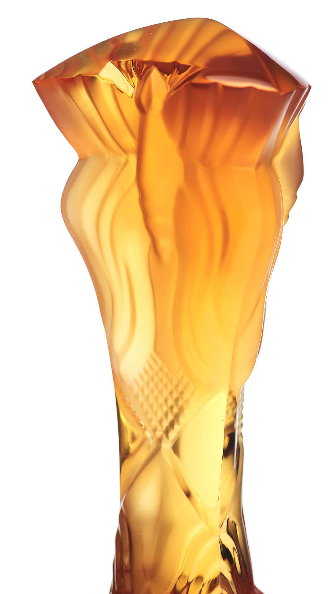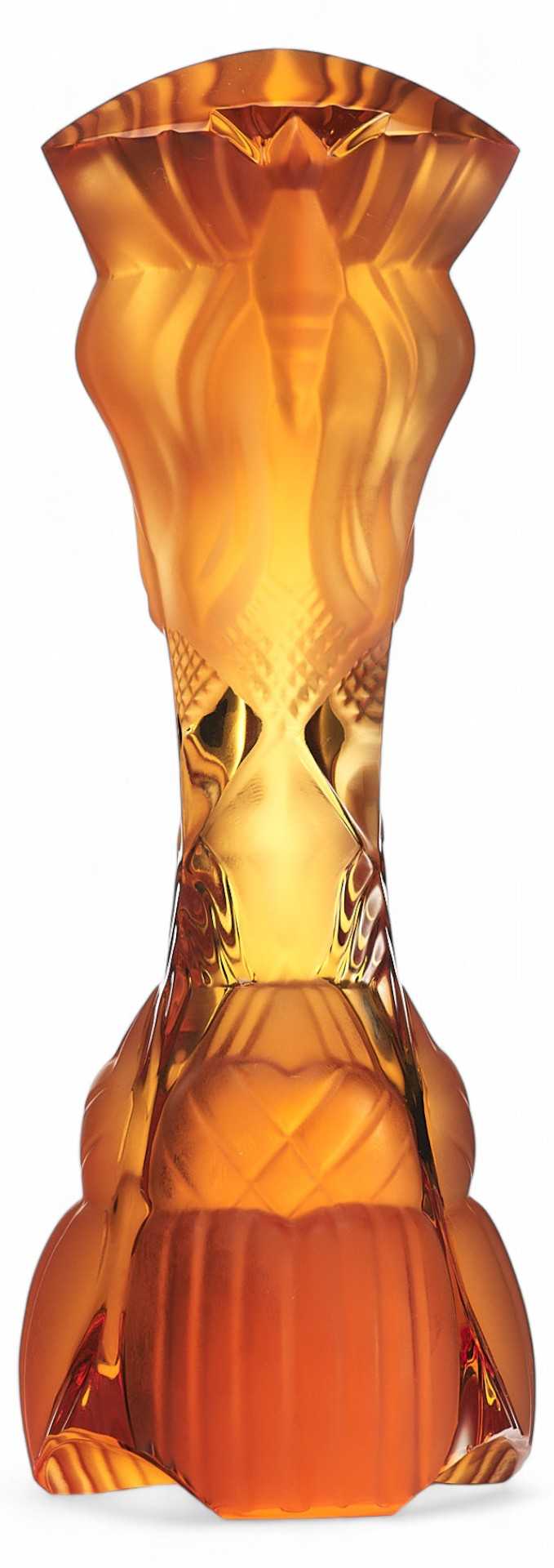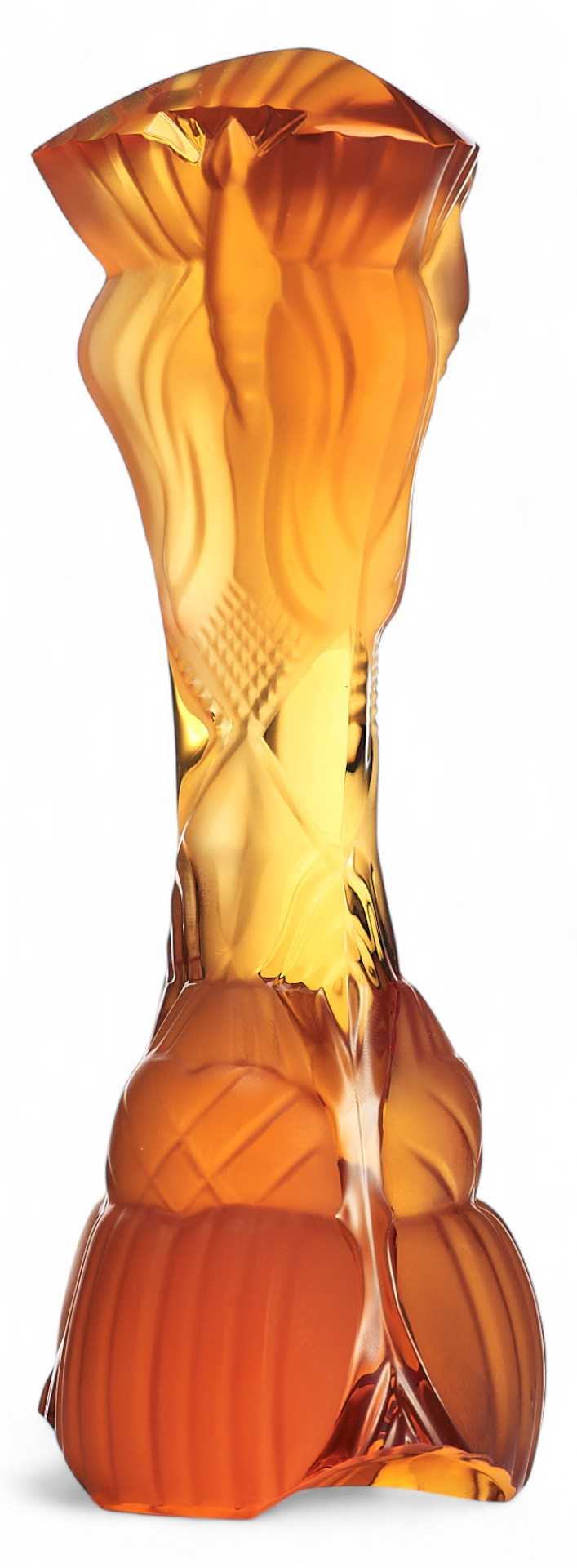 Скульптура из цветного хрусталя желто-красного цвета. У основания она расширена и украшена растительным орнаментом и изображением бабочки. В середине она заужена, а кверху, обретая причудливые формы, расширена. На скульптуре имеется надпись: “Crystal St Louis France”. Скульптура изготовлена на знаменитой французской фабрике Сен-Луи. Первая стекольная фабрика была открыта в 1586 году в районе Сен-Луи-ле-Бише. В 1767 году фабрике присвоили звание Verrerie Royale-Louis (королевская фабрика). Через пятнадцать лет Франсуа де Бофор создает особую формулу, по которой начинает производить хрусталь. После этого завод обрел новое имя - Christallerie Royale de Saint-Louis. С 1782 года фабрика стала лучшей в производстве стекла во всей континентальной Европе. В настоящее время ассортимент компании широк - это и посуда из хрусталя, вазы, люстры, подсвечники и пресс-папье. Все изделия делаются вручную. Цветовая палитра Сен Луи насчитывает 15 различных цветов.