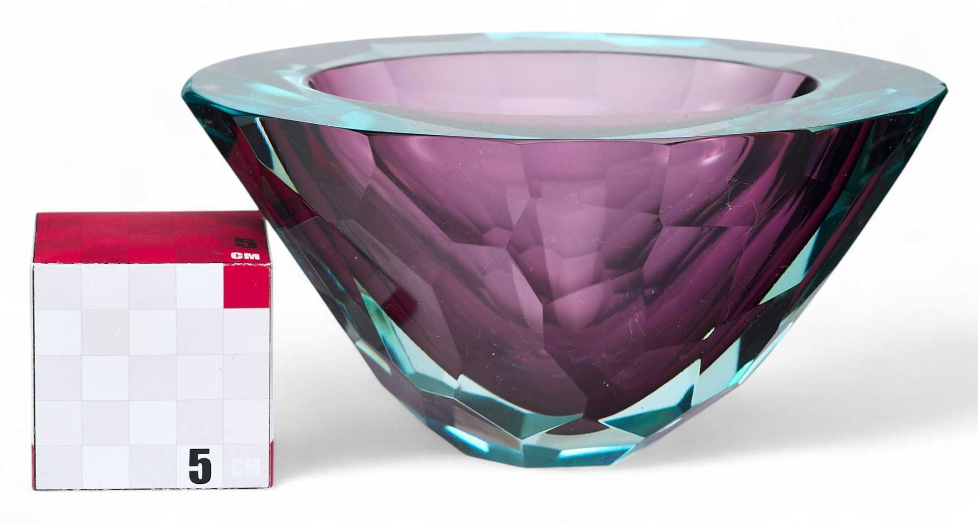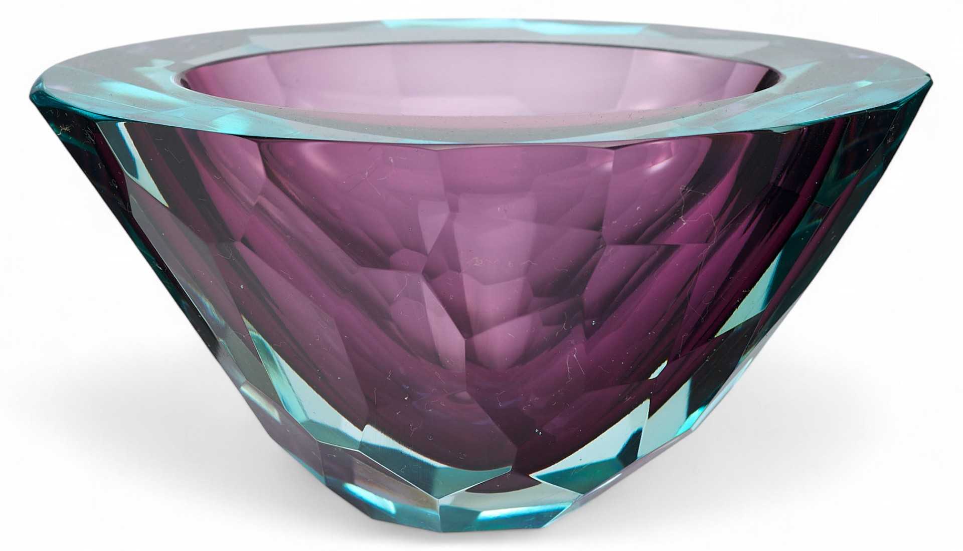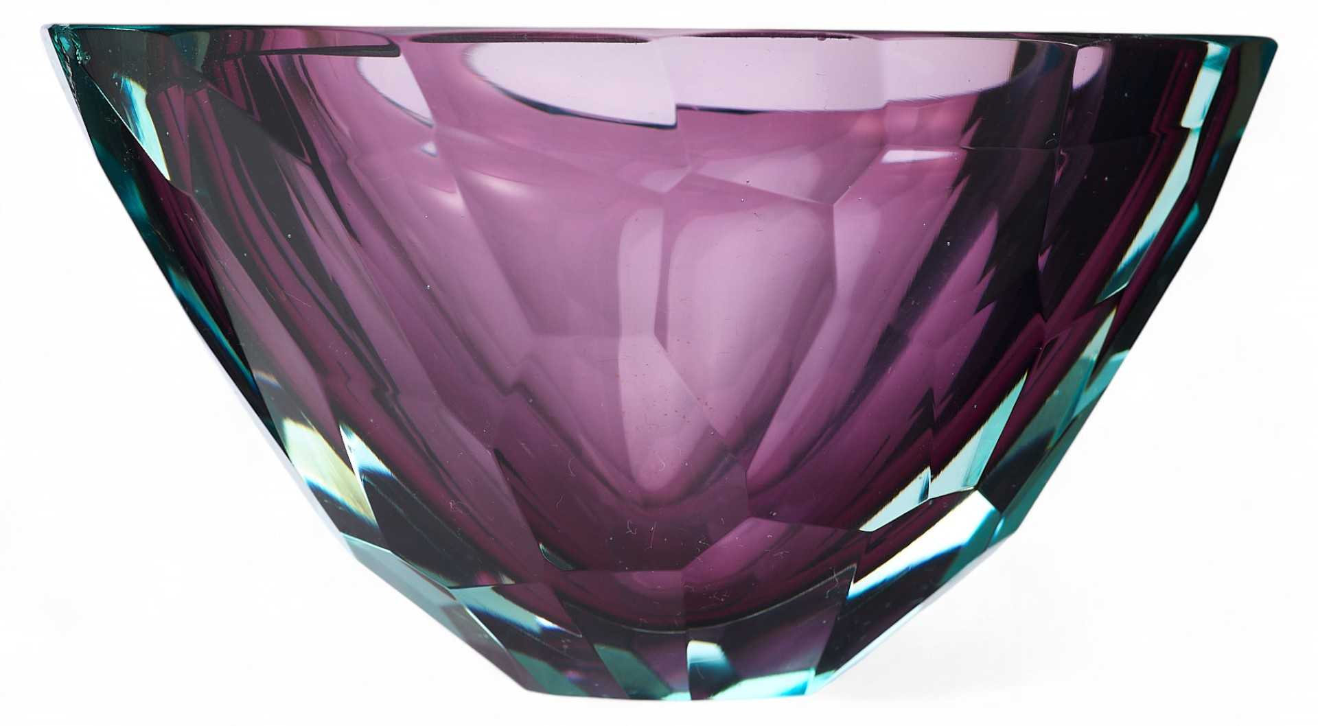 Ваза имеет открытую конструкцию, изготовлена из цветного ограненного стекла. Углубление в корпусе имеет овальную форму. Ваза обладает красивой бледно-фиолетовой, синей окраской, ярким блеском, лучепреломлением, светорассеянием.
