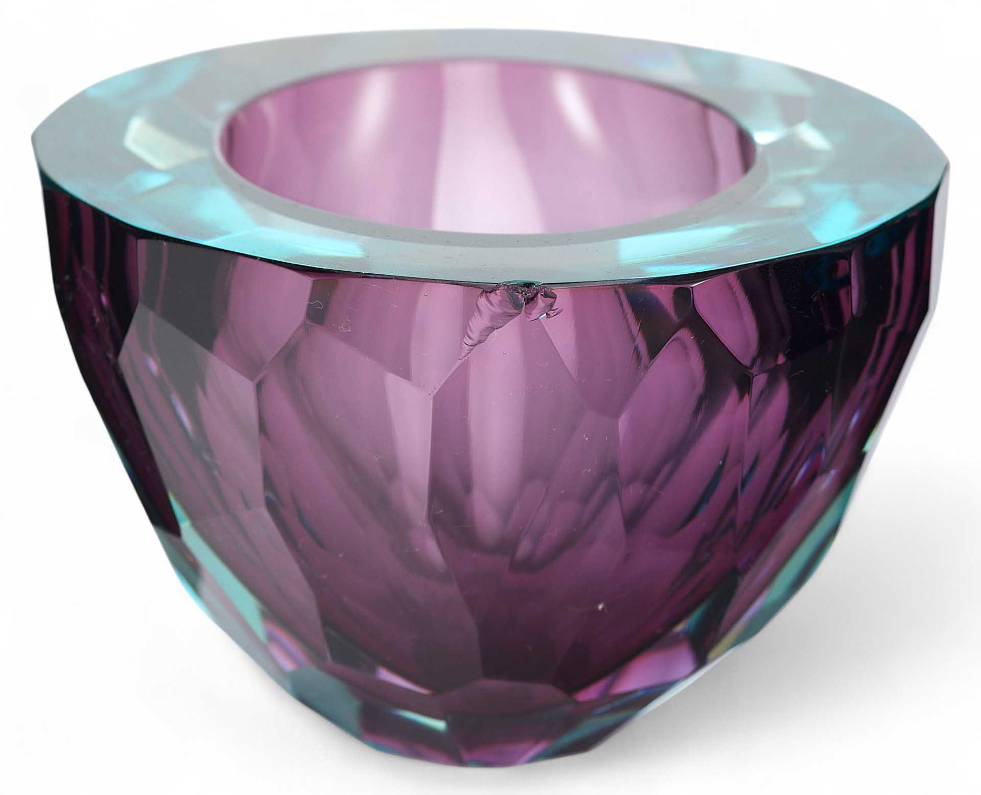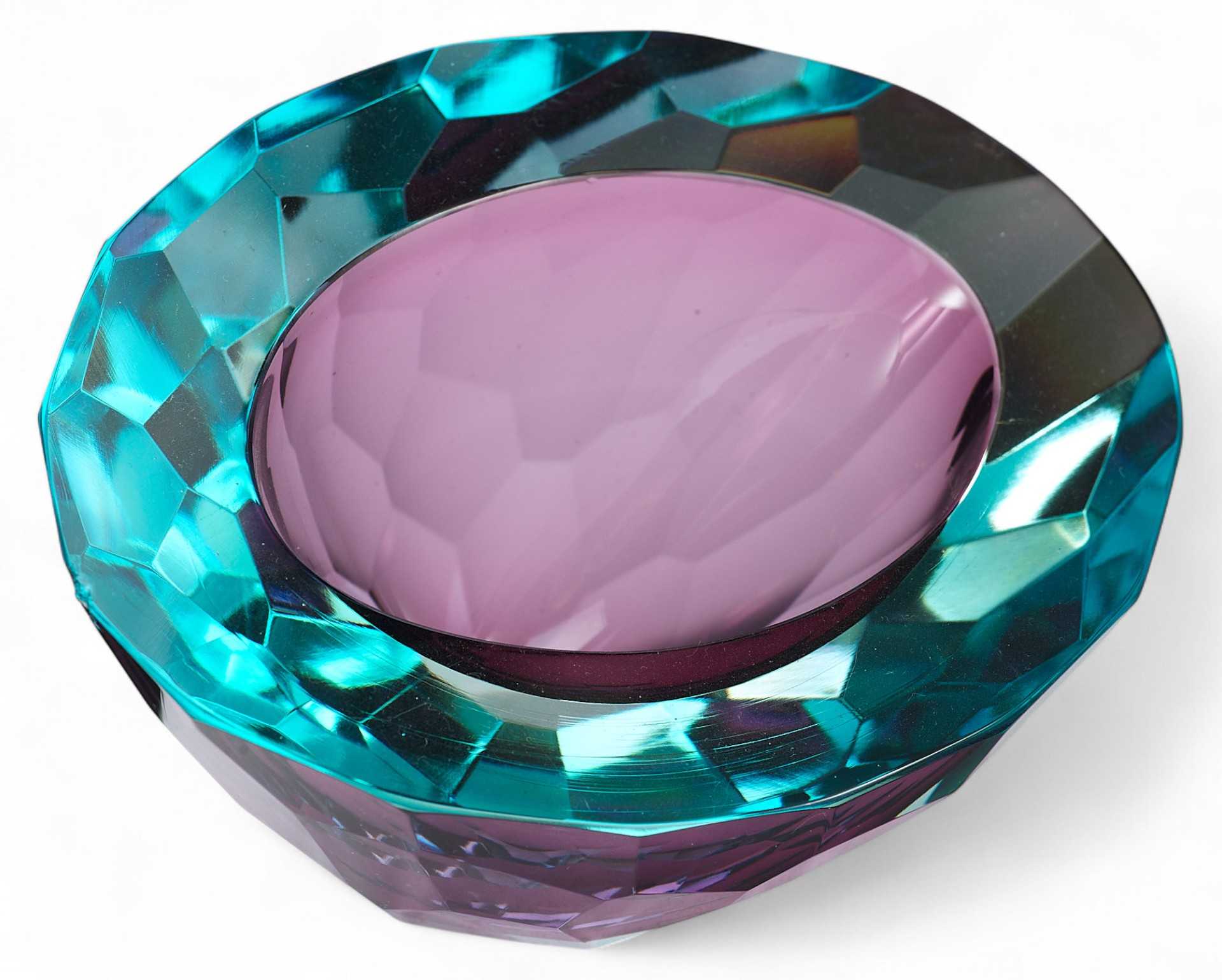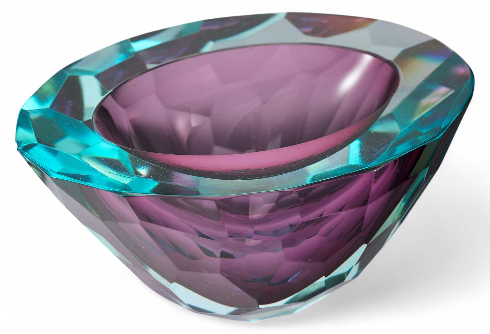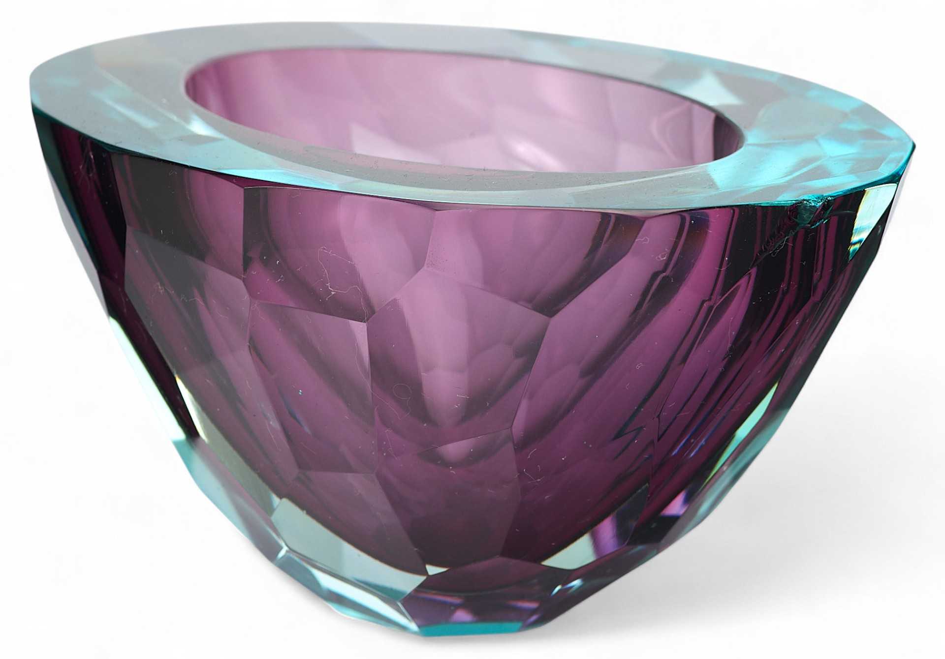 Ваза имеет открытую конструкцию, изготовлена из цветного ограненного стекла. Углубление в корпусе имеет овальную форму. Ваза обладает красивой бледно-фиолетовой, синей окраской, ярким блеском, лучепреломлением, светорассеянием.