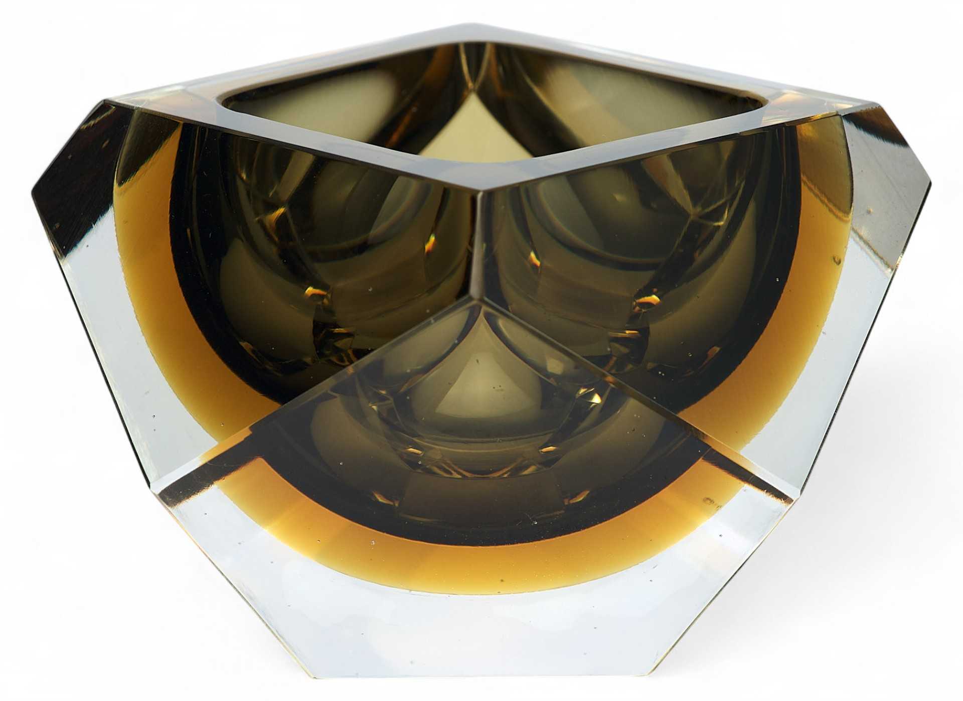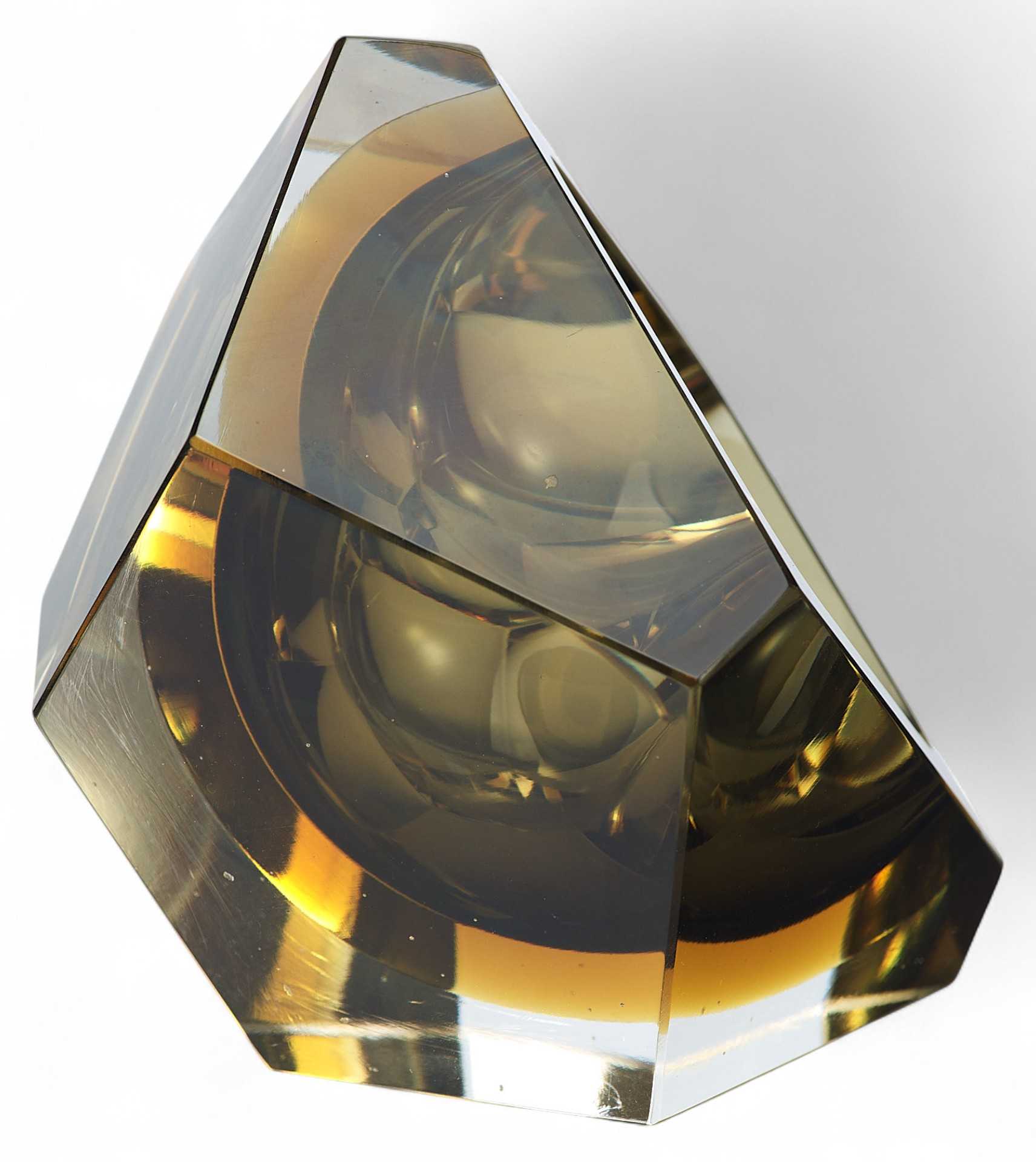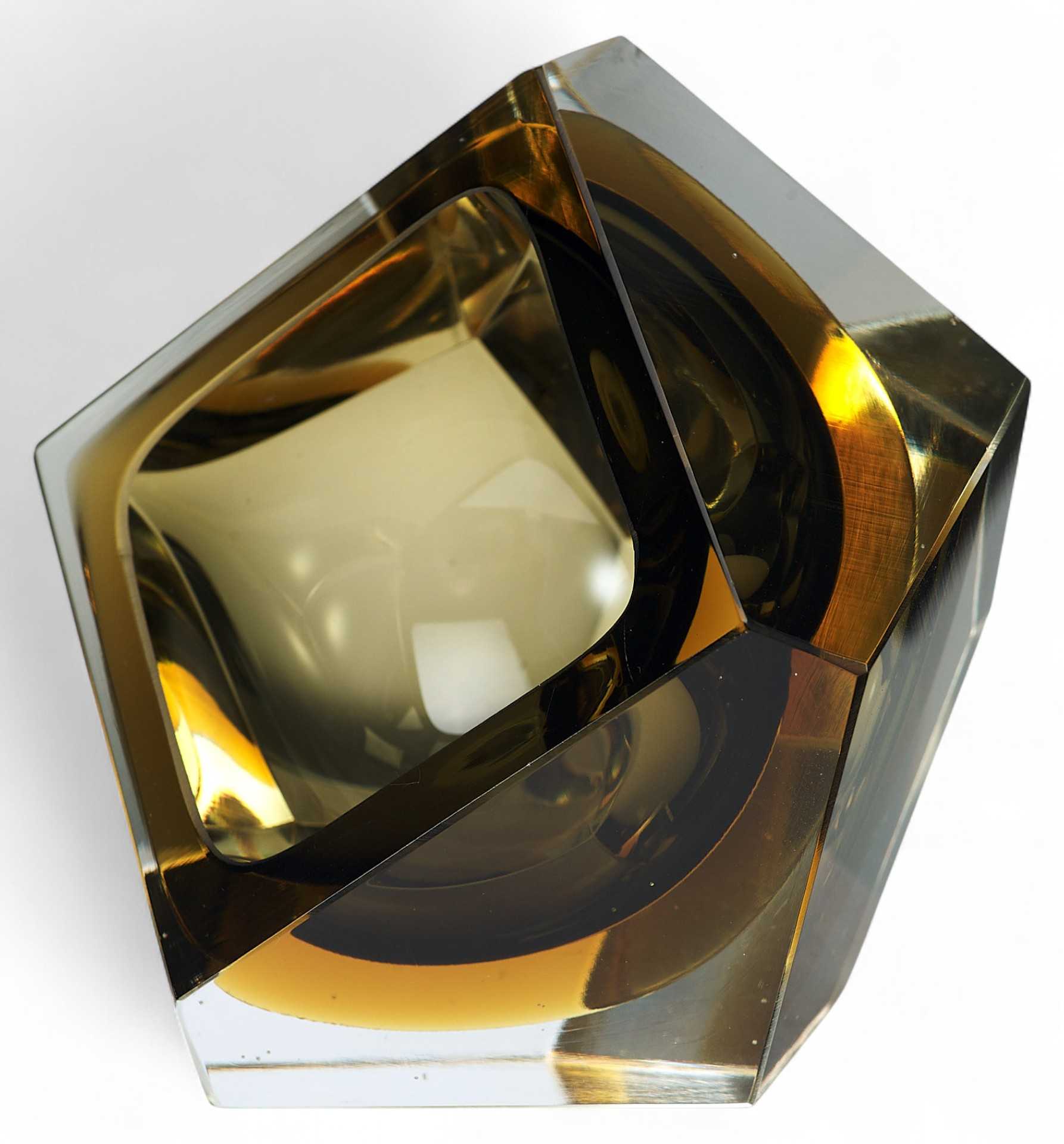 Ваза имеет открытую конструкцию, изготовлена из цветного стекла. Углубление в корпусе имеет квадратную форму. Тулово четырехгранной формы обладает зеленой и желтой окраской, ярким блеском, лучепреломлением, светорассеянием. Дно квадратное. Ваза изготовлена в стиле Ар Деко.