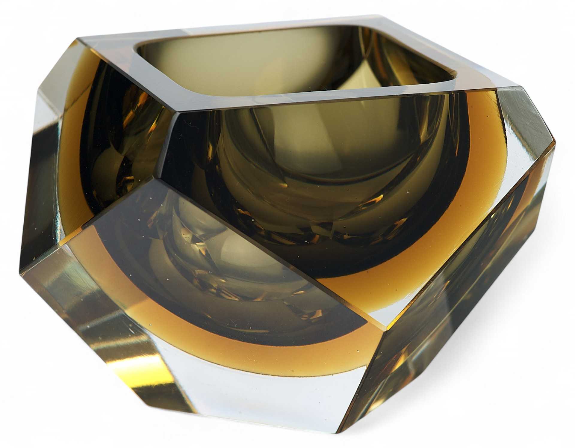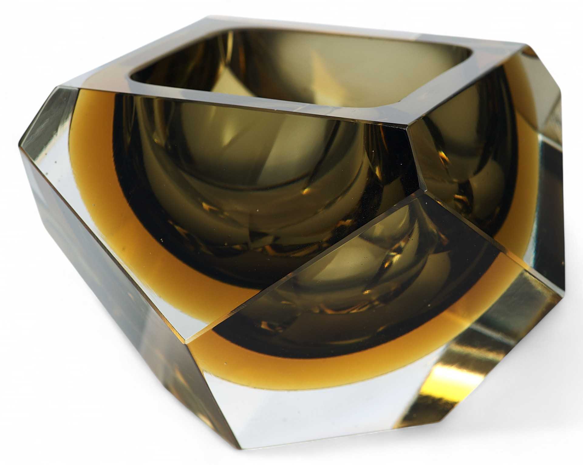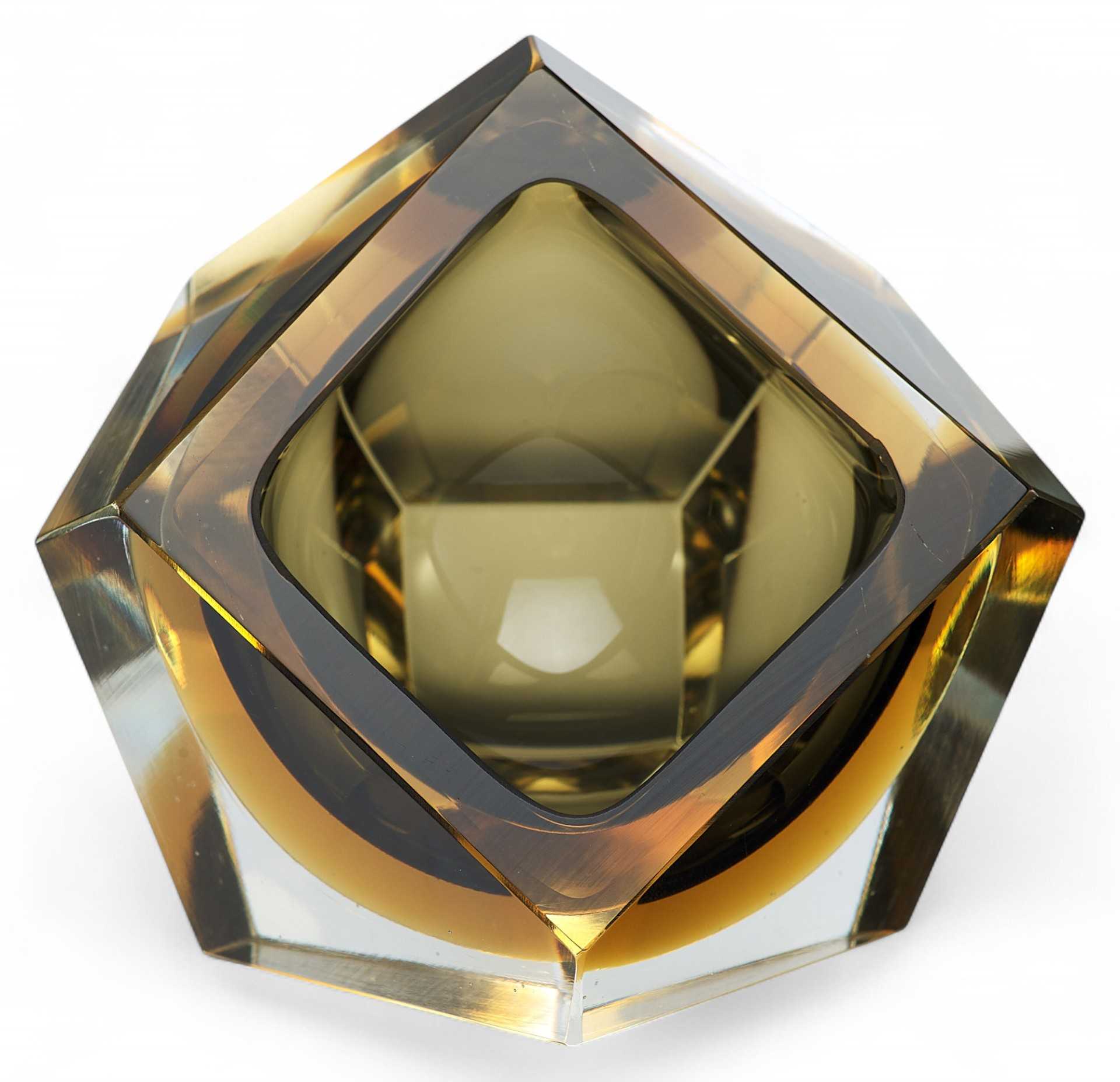 Ваза имеет открытую конструкцию, изготовлена из цветного стекла. Углубление в корпусе имеет квадратную форму. Тулово четырехгранной формы обладает зеленой и желтой окраской, ярким блеском, лучепреломлением, светорассеянием. Дно квадратное. Ваза изготовлена в стиле Ар Деко.