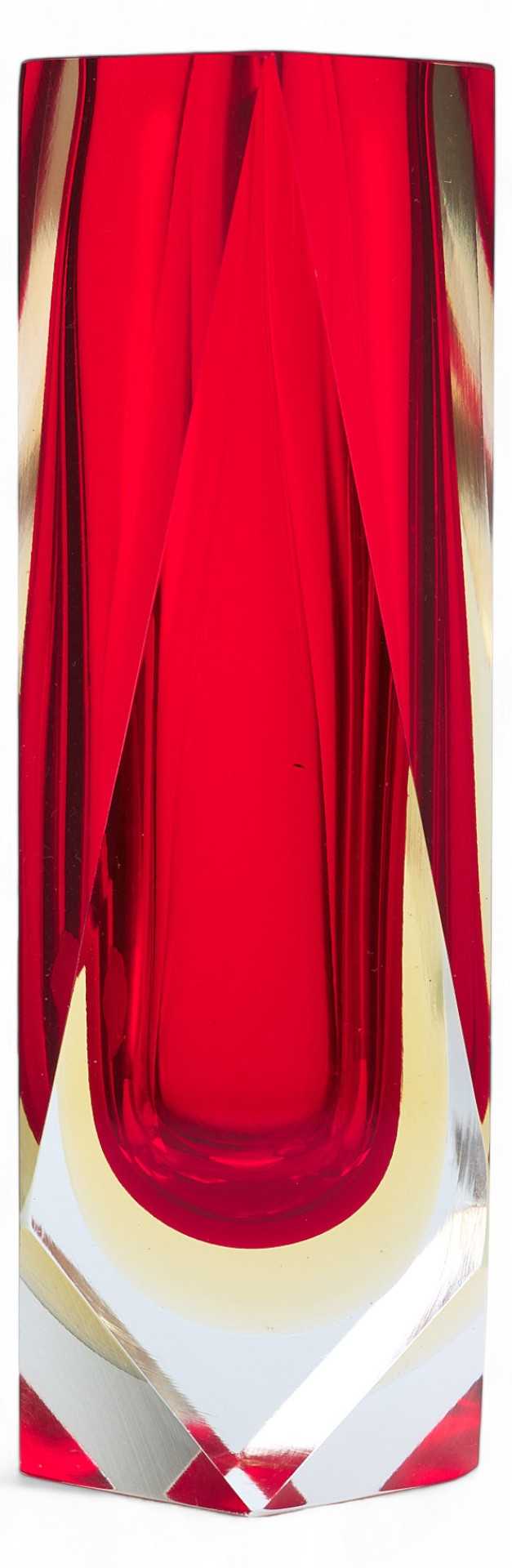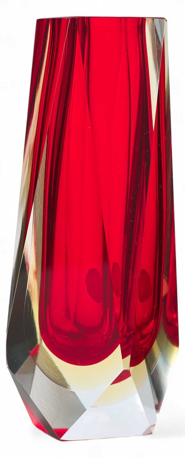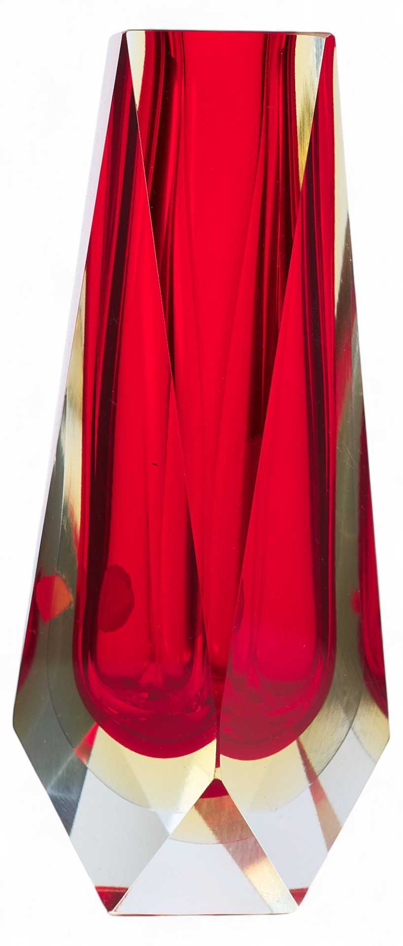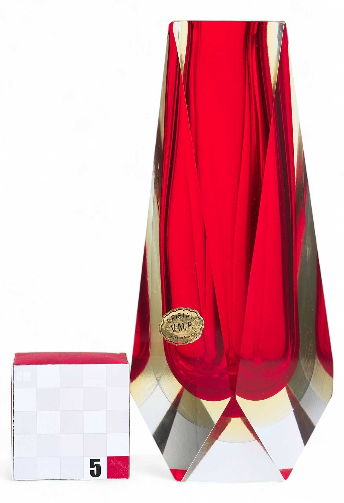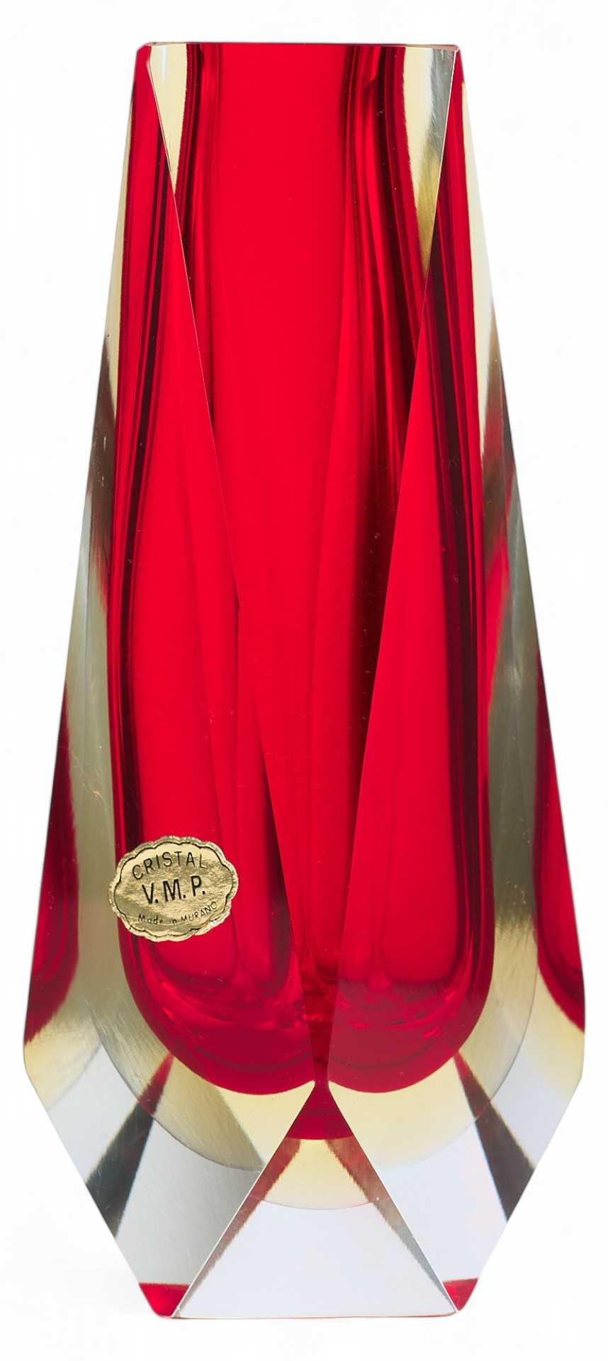 Великолепный образец студийного стекла от Murano Italy. Ваза выполнена в сочетании алого и бесцветного стекла. На предмете сохранилась наклейка производителя: «Cristal ѴМР Made in Murano».