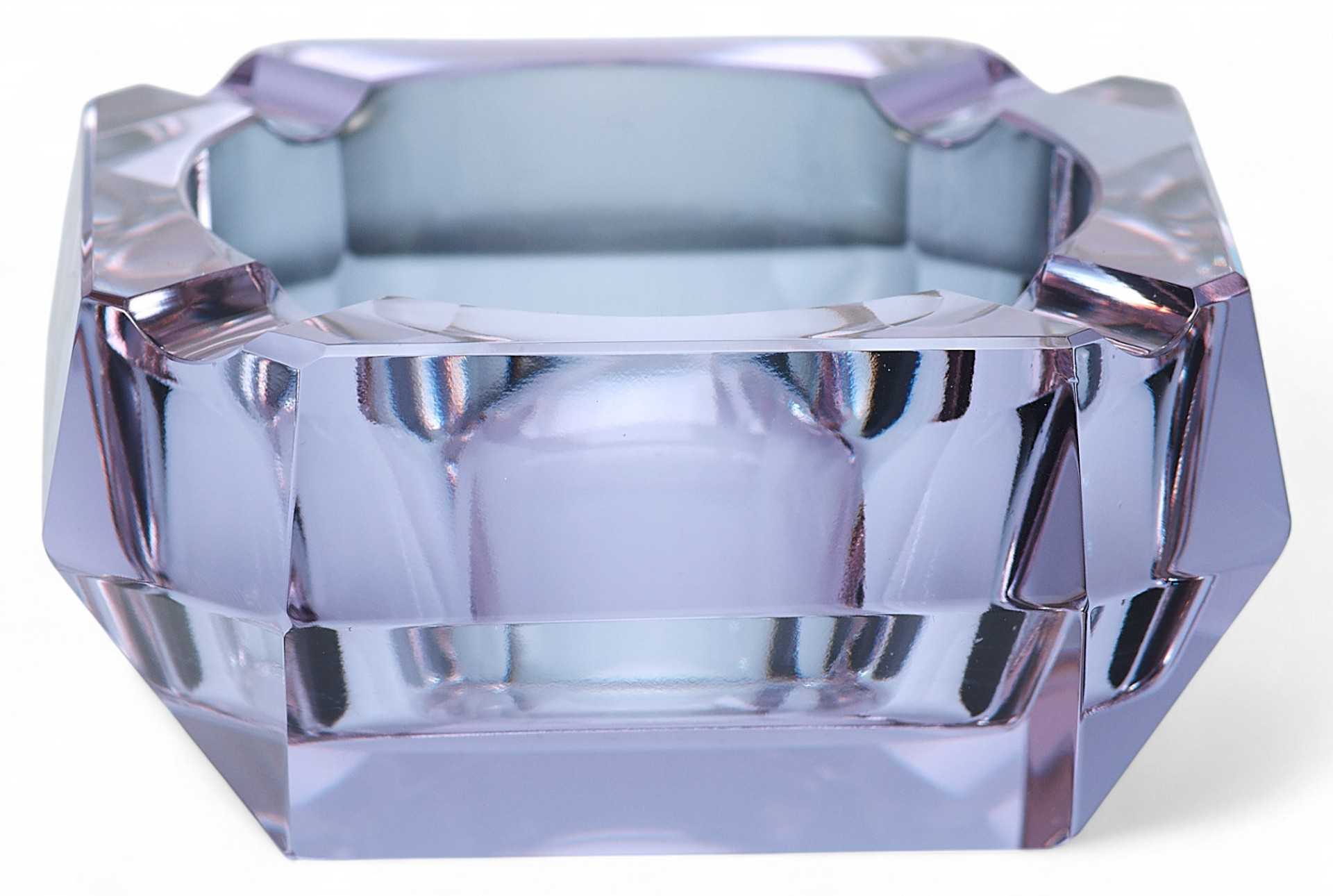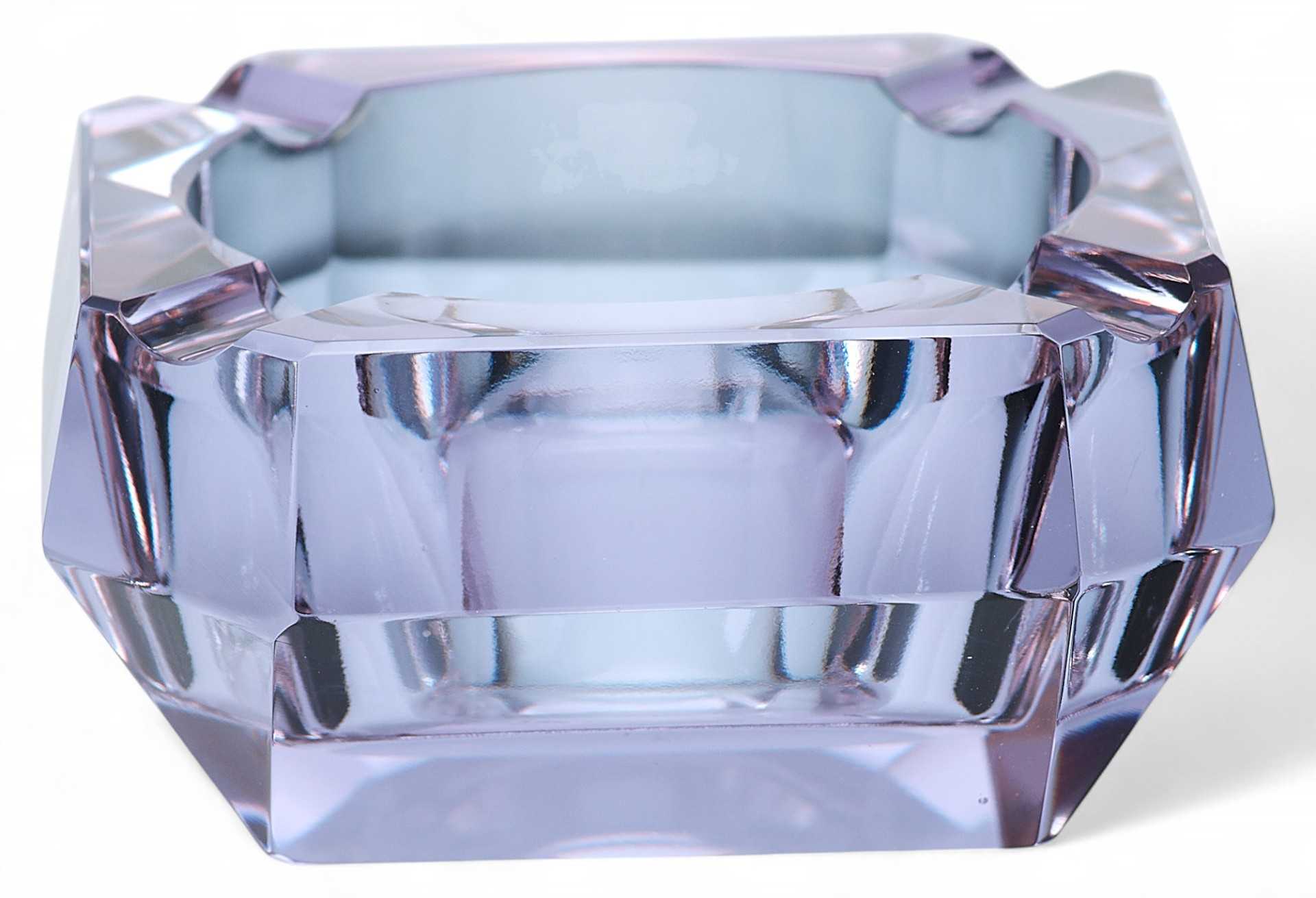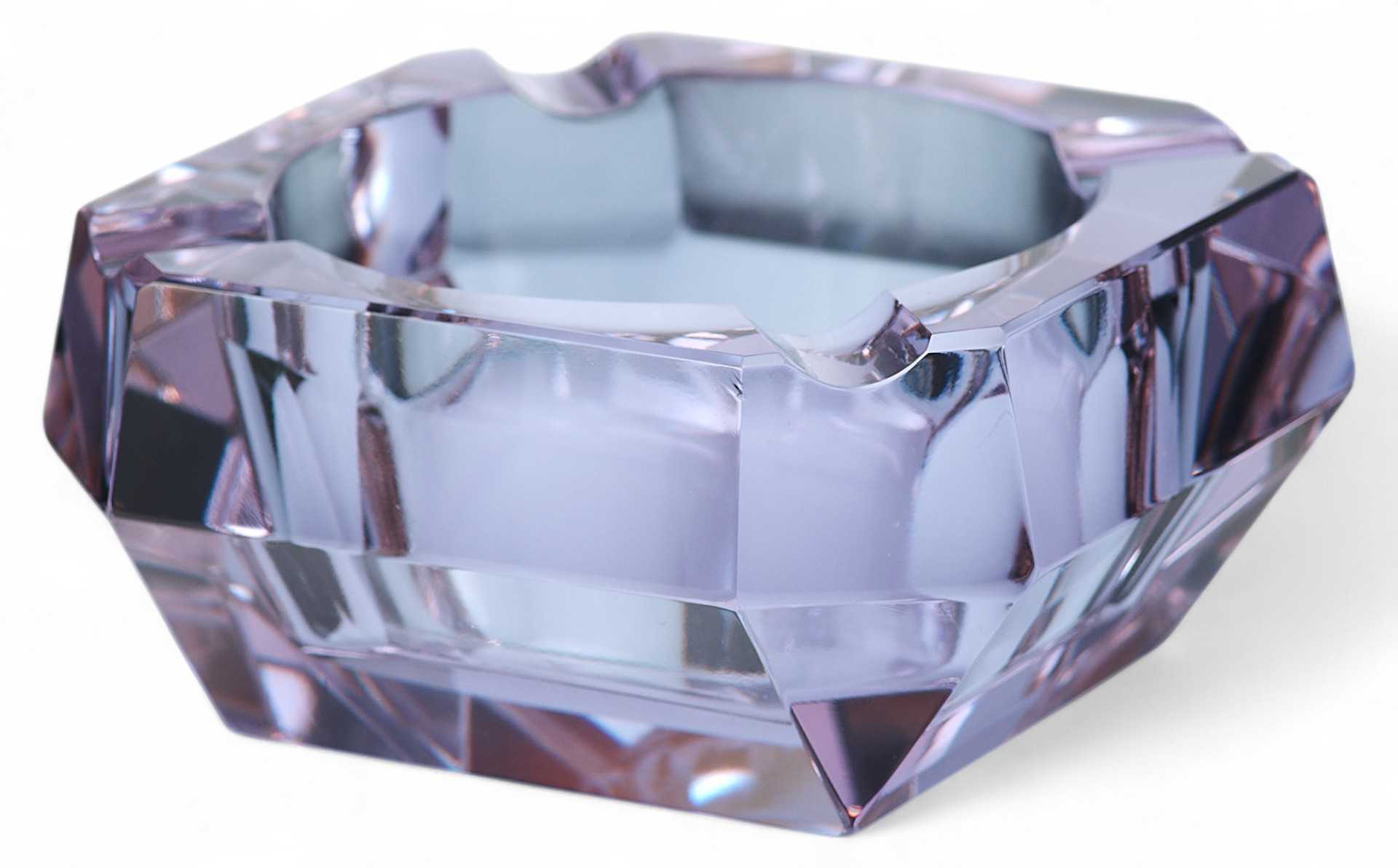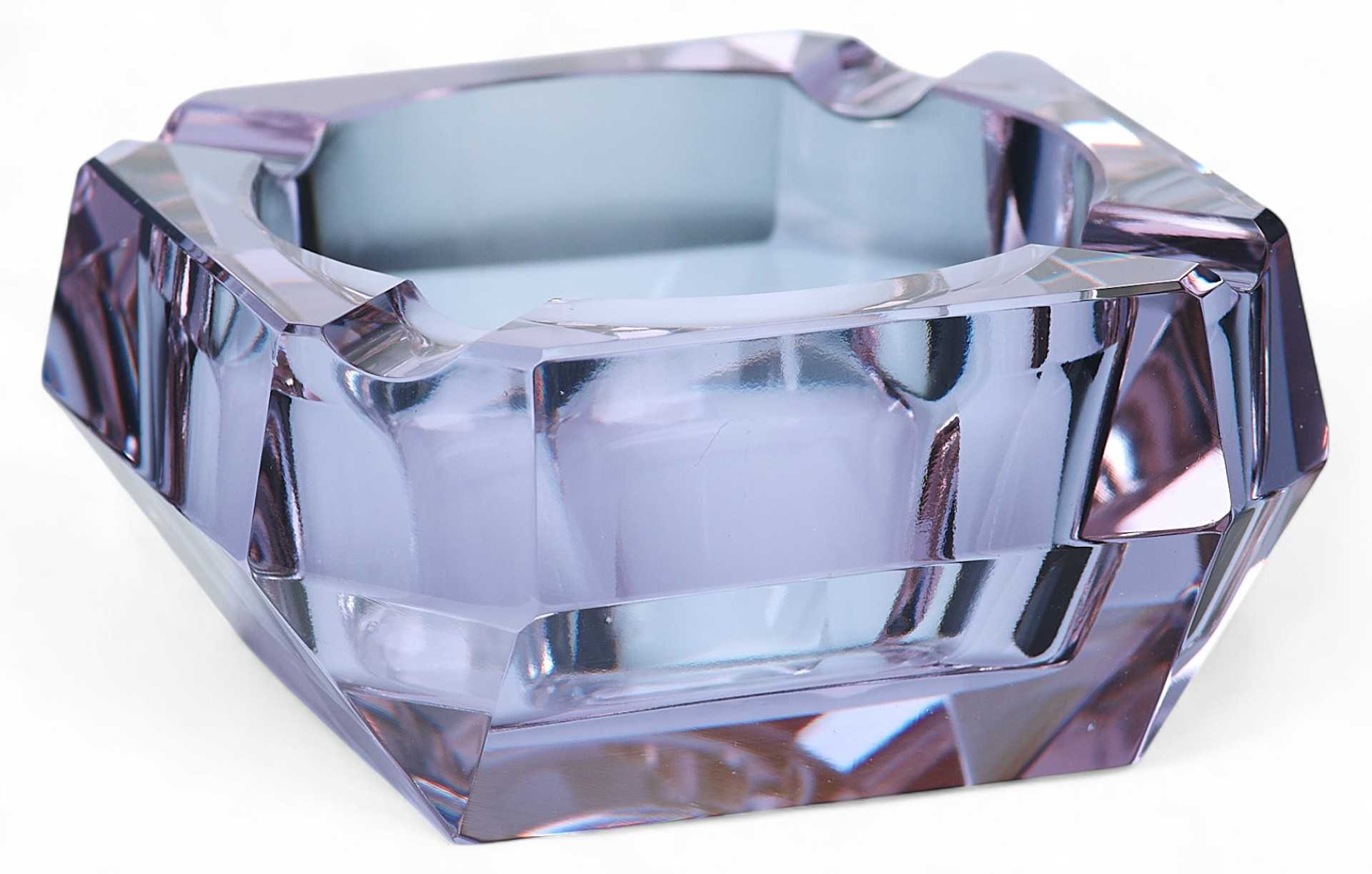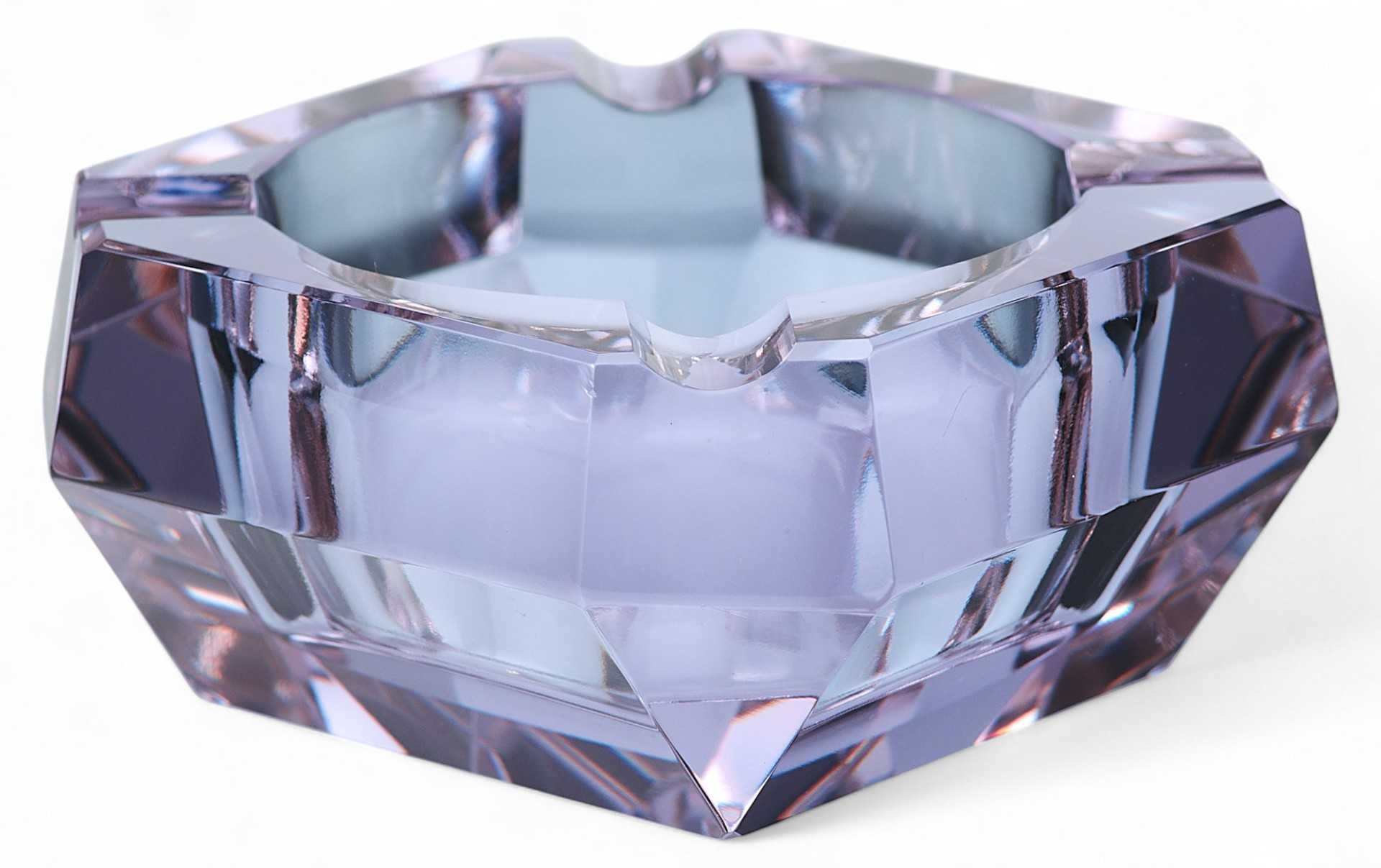 Пепельница-“хамелеон” (при изменении освещения меняет цвет с голубого до бледнорозового). Предмет имеет открытую конструкцию, изготовлен из цветного ограненного стекла.
