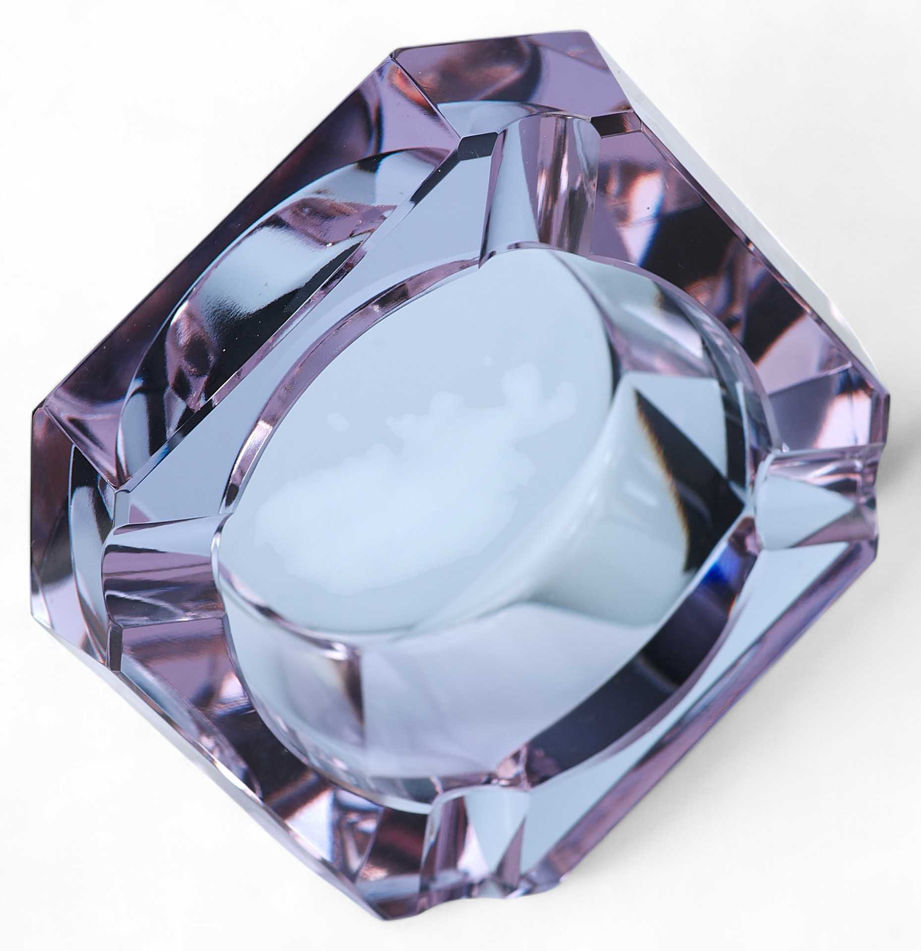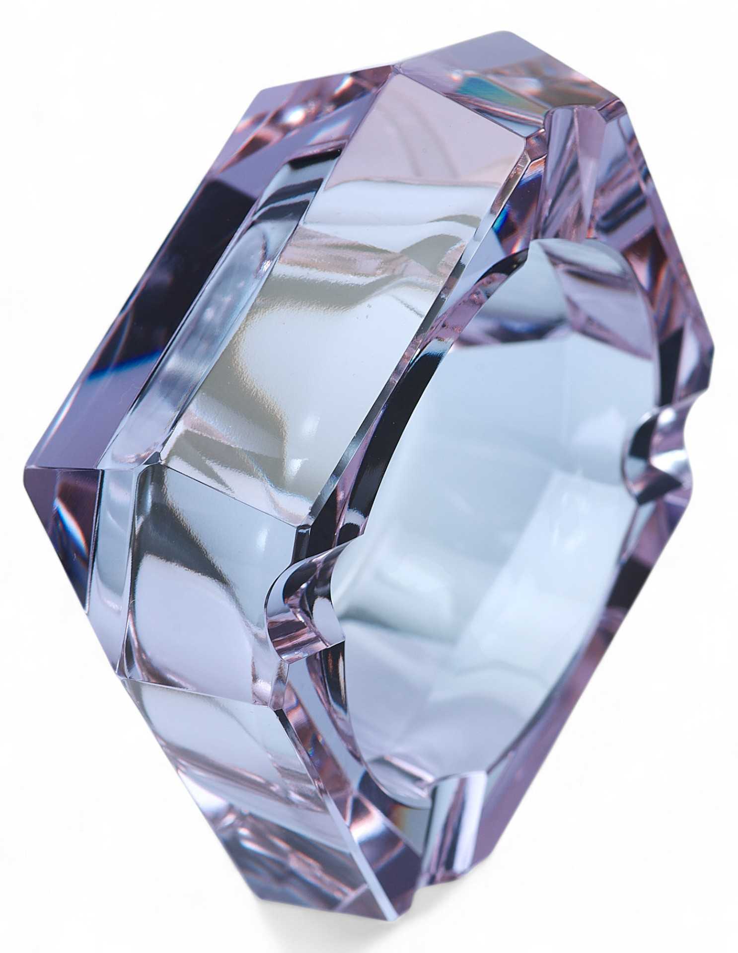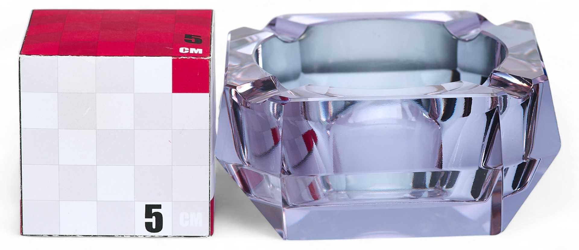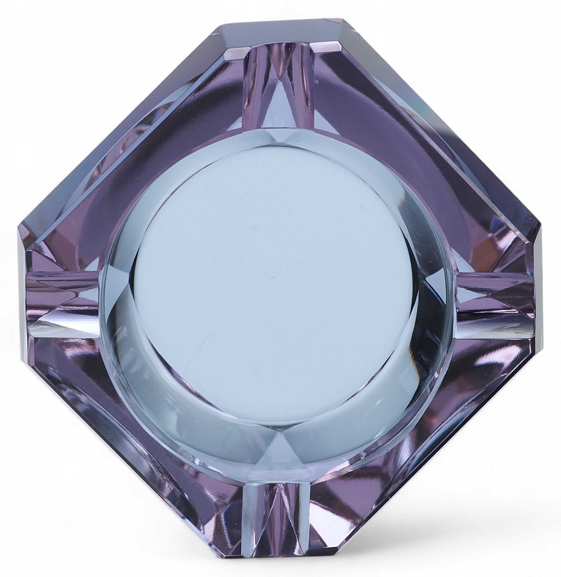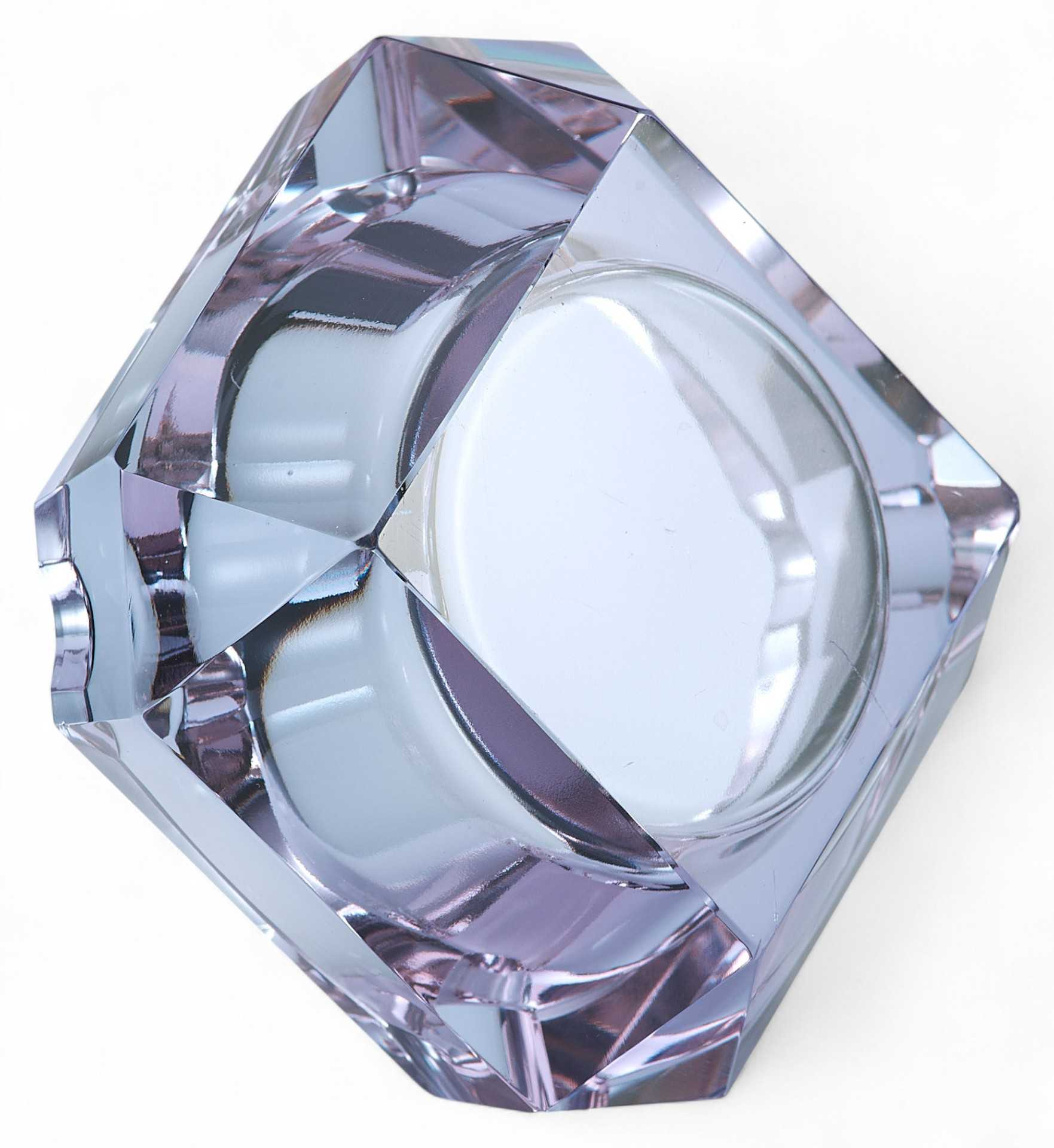 Пепельница-“хамелеон” (при изменении освещения меняет цвет с голубого до бледнорозового). Предмет имеет открытую конструкцию, изготовлен из цветного ограненного стекла.