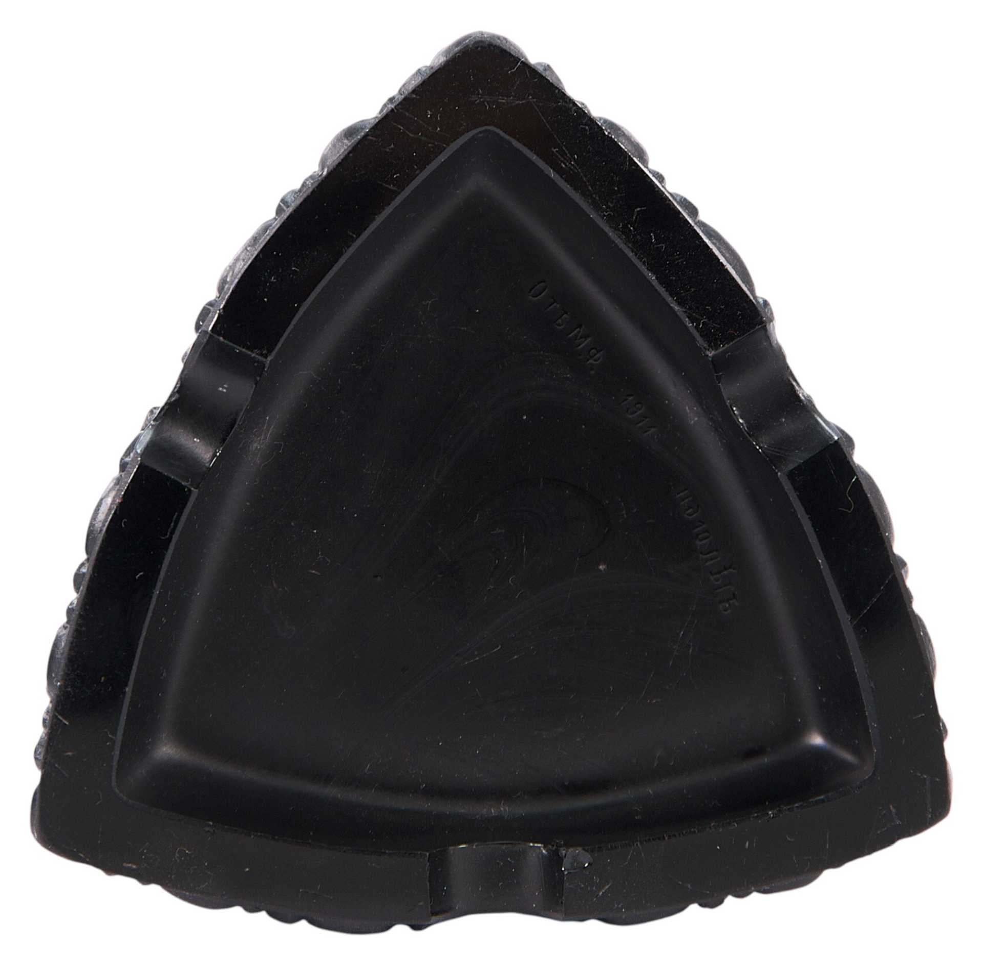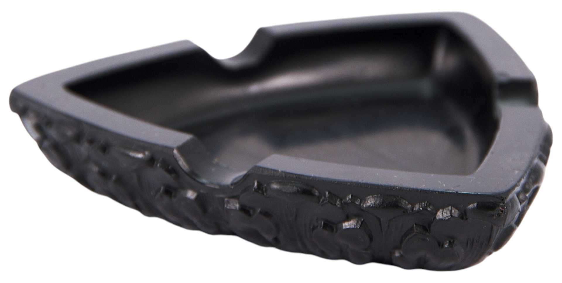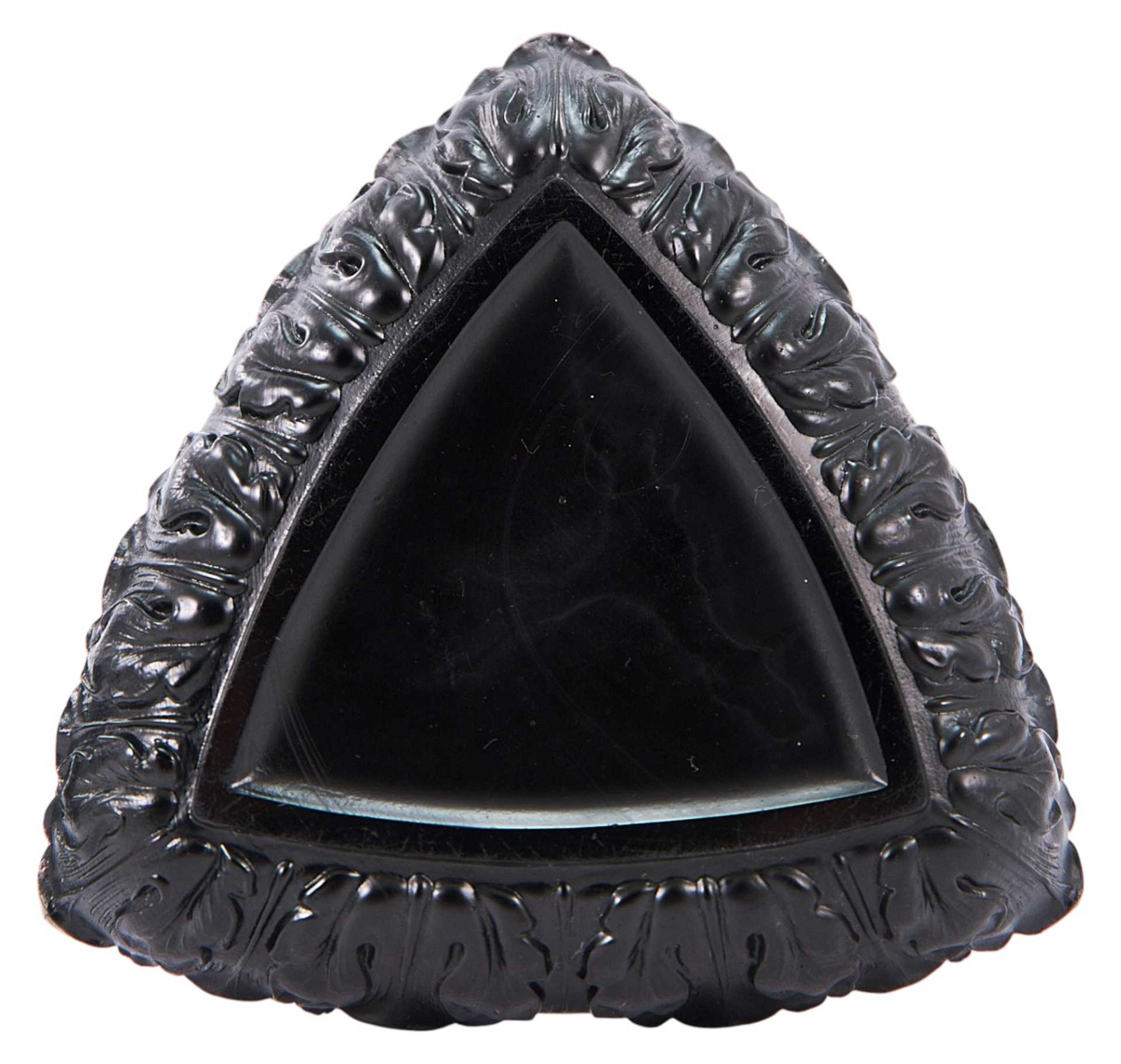 Пепельница из темного прессованного стекла. Предмет имеет треугольную форму с невысокими бортиками, на каждом из которых полукруглая выемка для стряхивания пепла. С внешней стороны бортики украшены стилизованными листьями (пальметты).