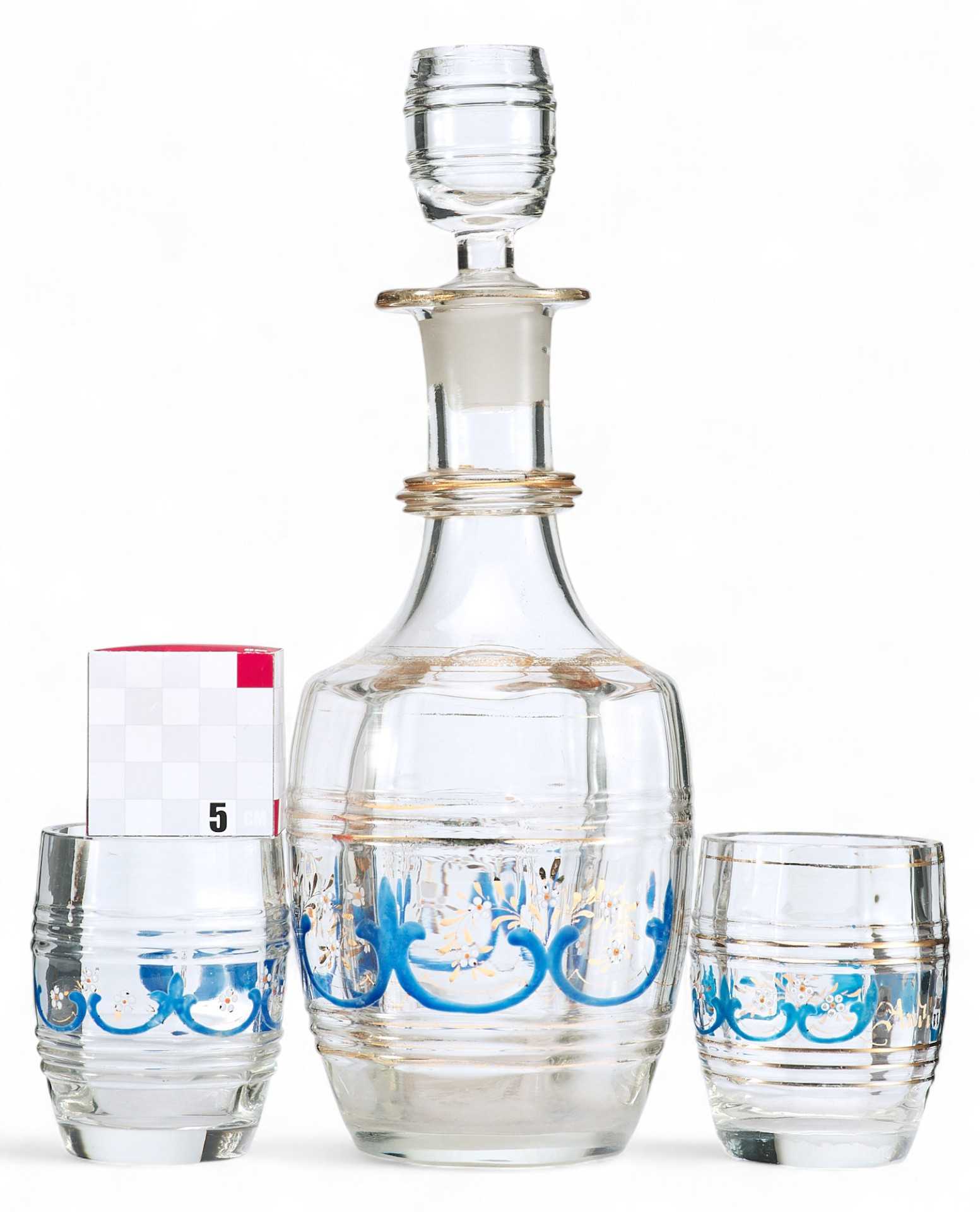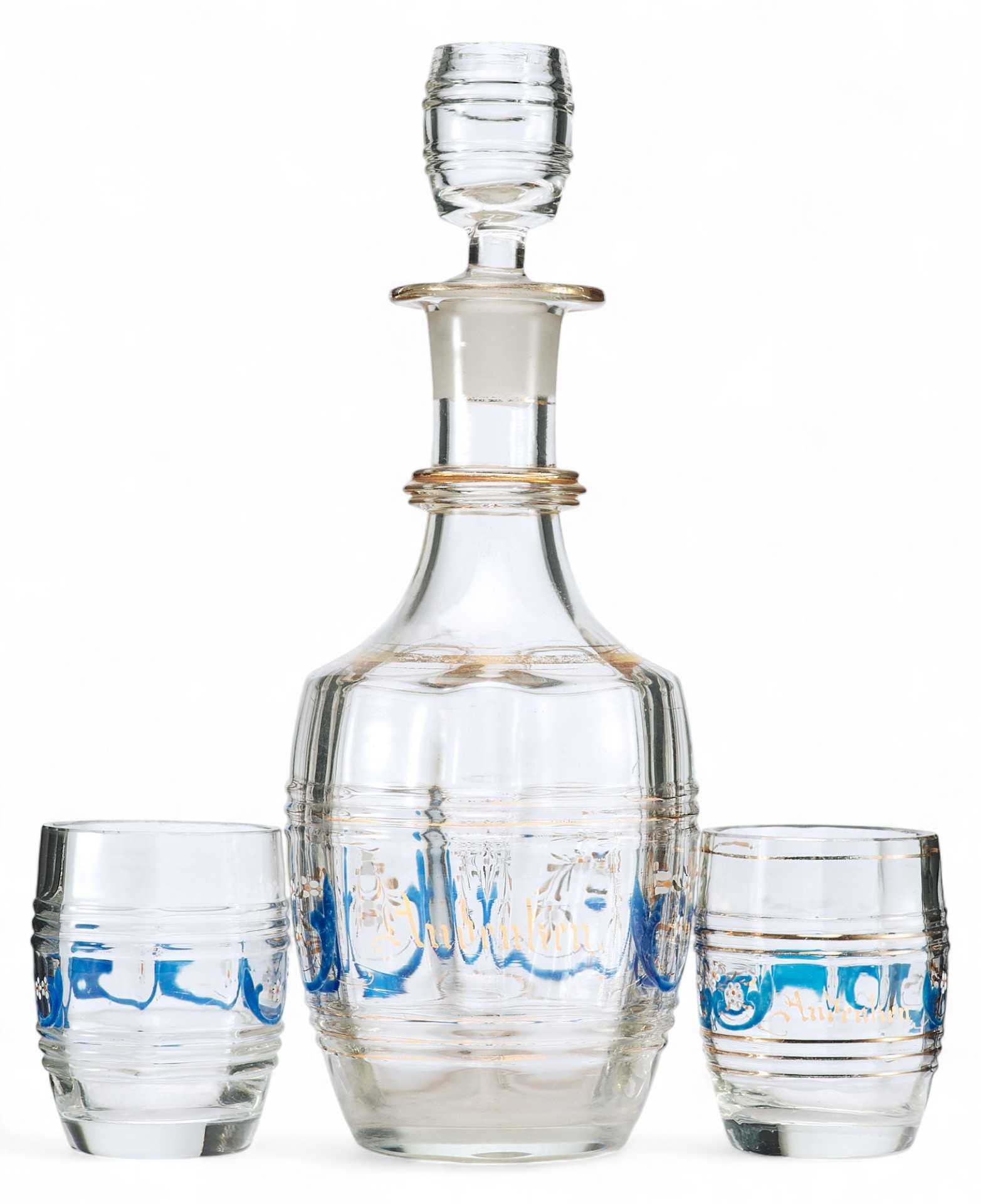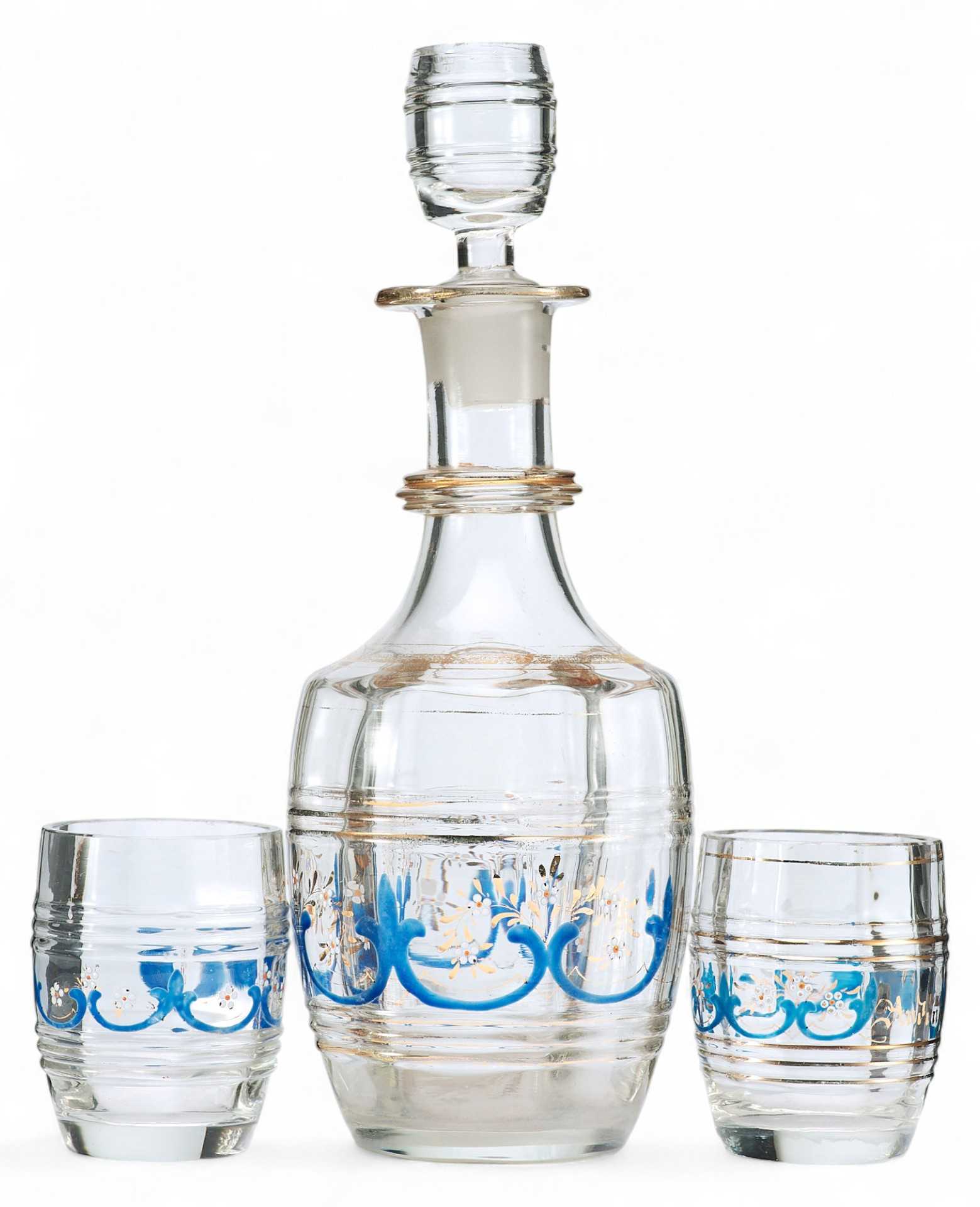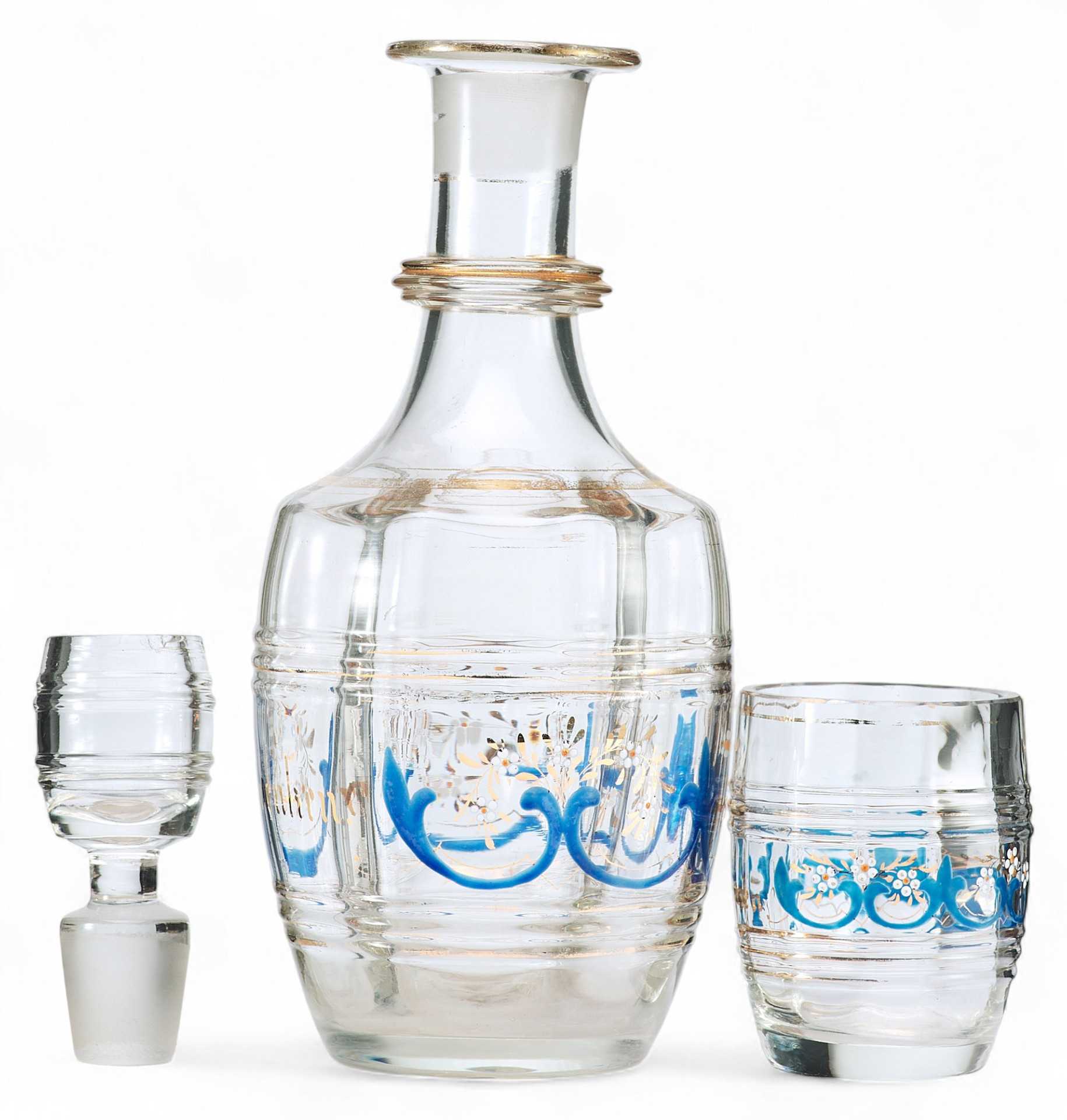 Набор для бара состоит из графина и двух стаканов. Графин прозрачного стекла оригинальной формы с несколькими выступами на горлышке и пробкой в виде стопки украшен легким цветочным эмалевым узором и золочением. Стаканы выдержаны в едином стиле с графином; формой стилизованны под деревянный бочонок. На предметах присутствует надпись готическими буквами, сделанная позолотой: «ЯиТепЧеп». Набор отличается нарядностью и изящностью исполнения. Подобные предметы стоили дорого и были в большинстве своем подарочными, что поддерживало высокую