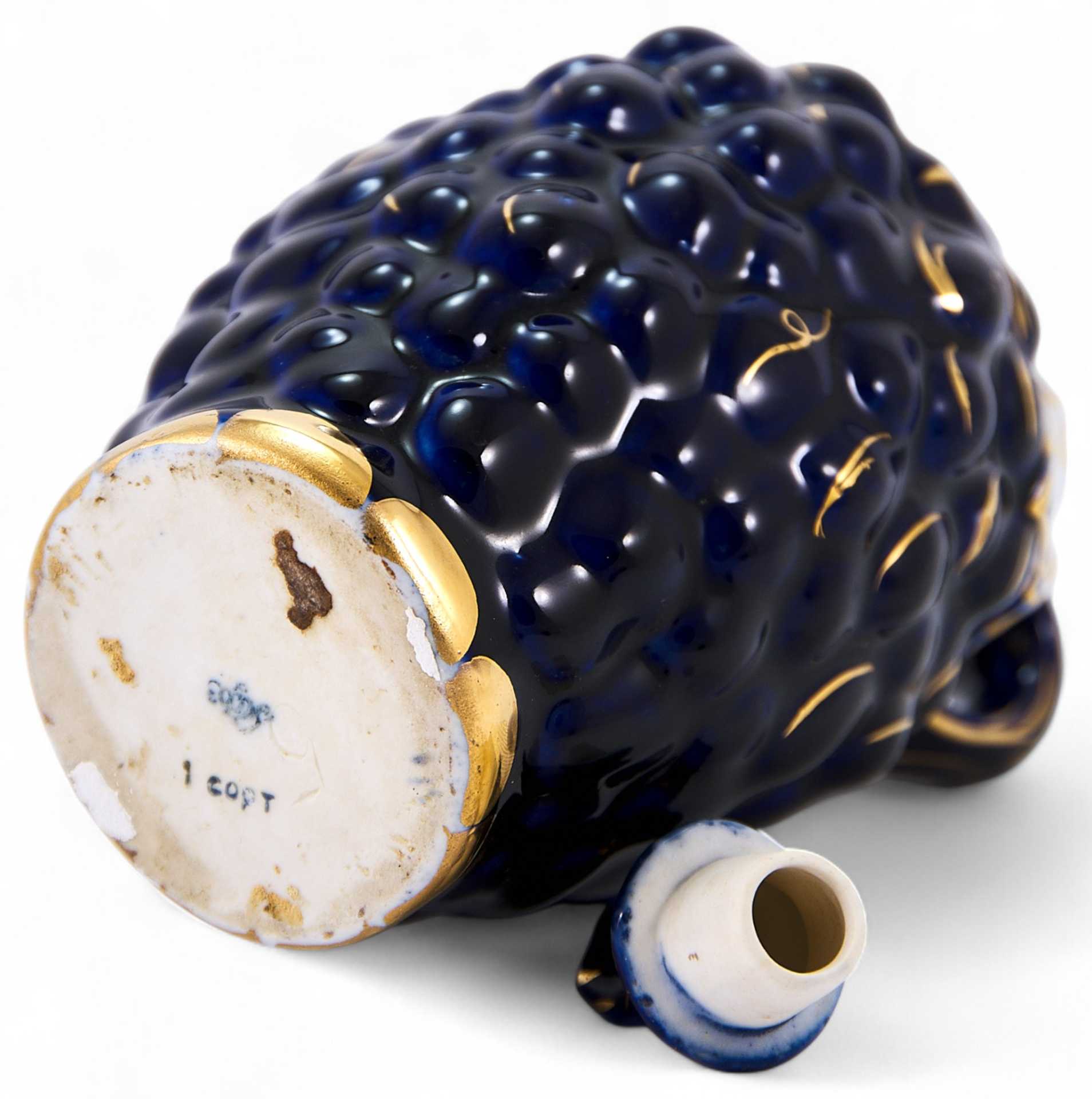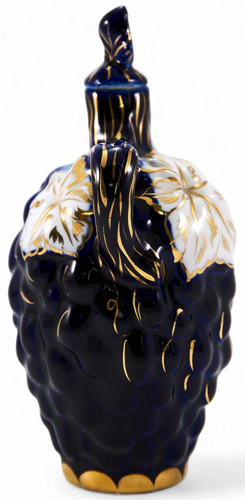 Тонирован насыщенным кобальтовым цветом, украшен золочением и белыми просветами в форме листьев. Предмет выполнен на хорошем техническом уровне.