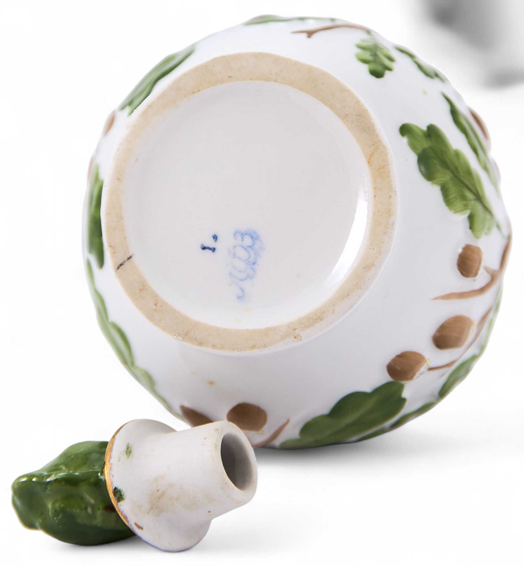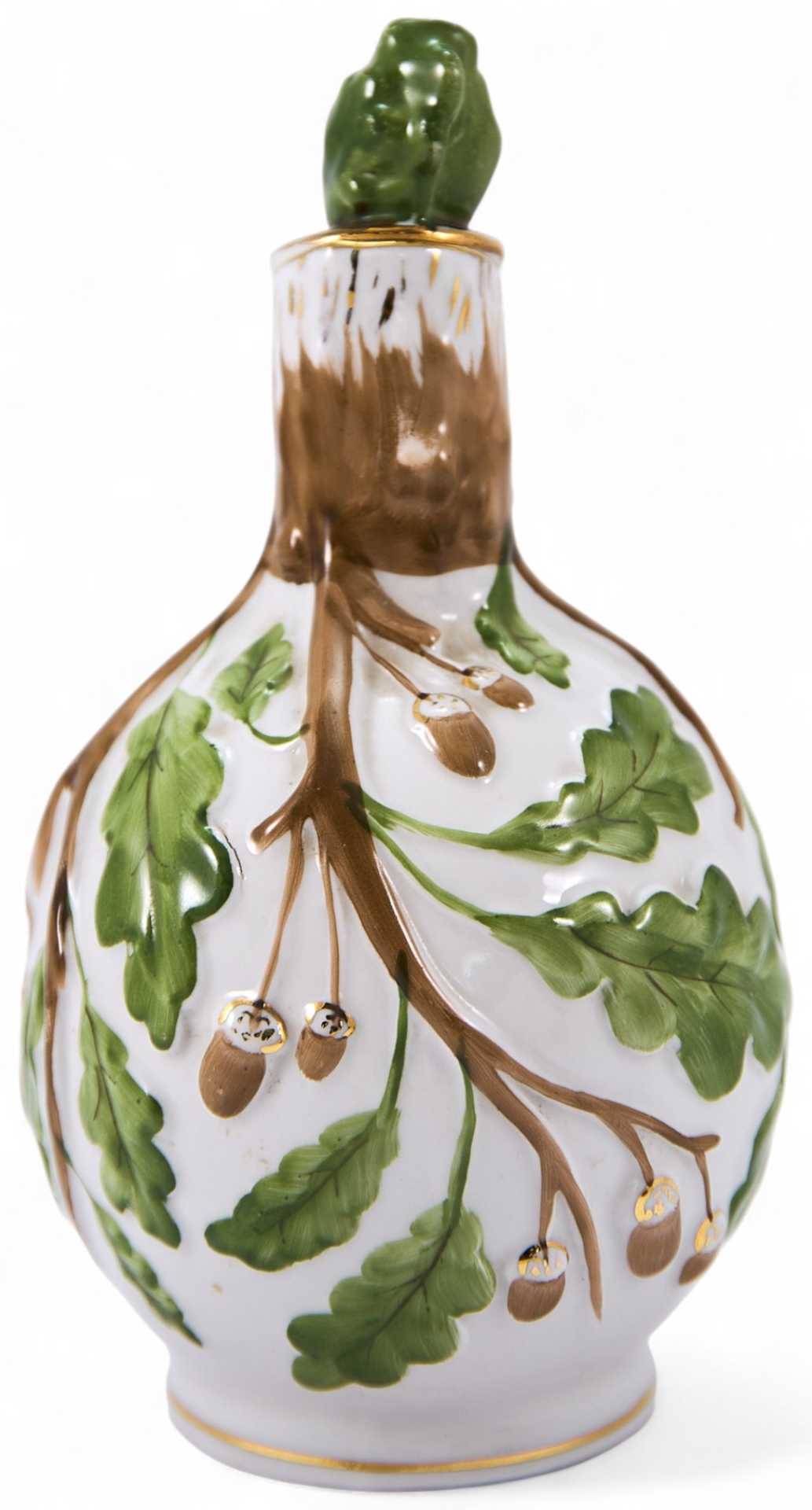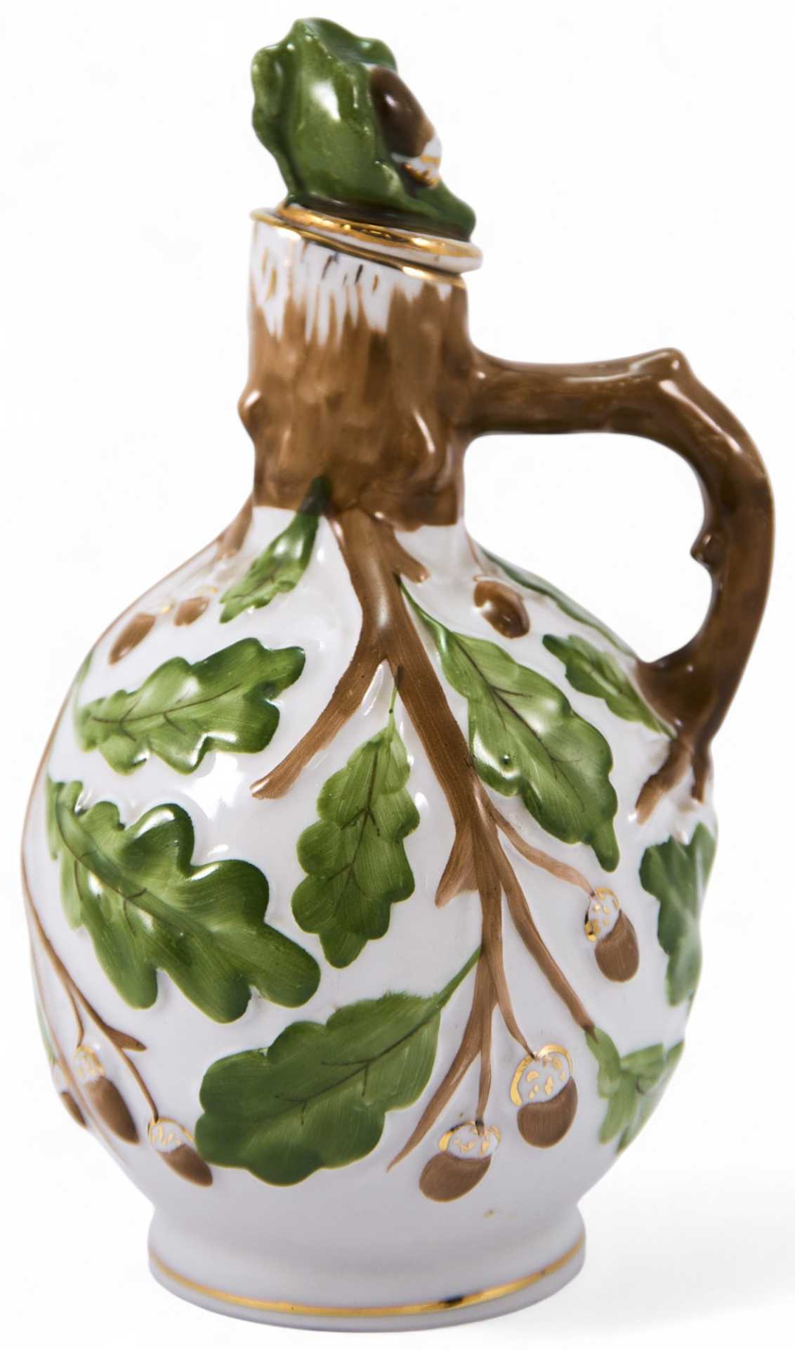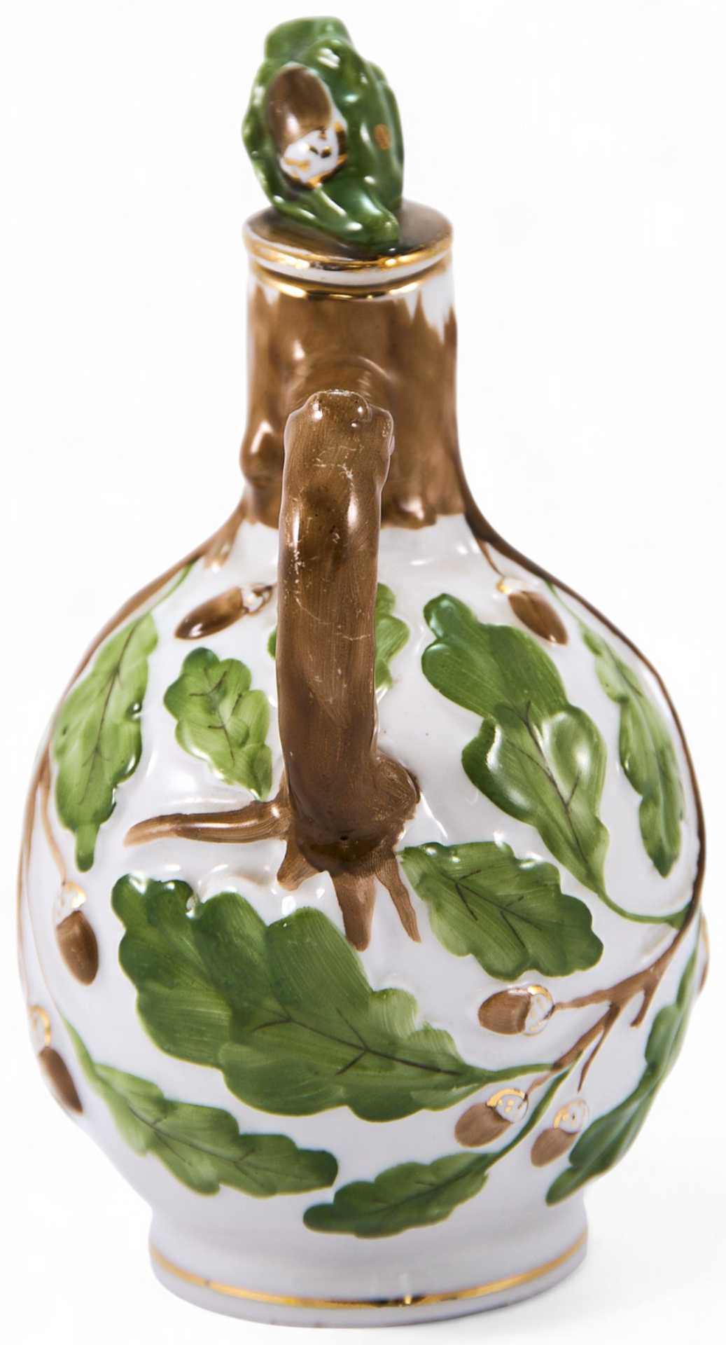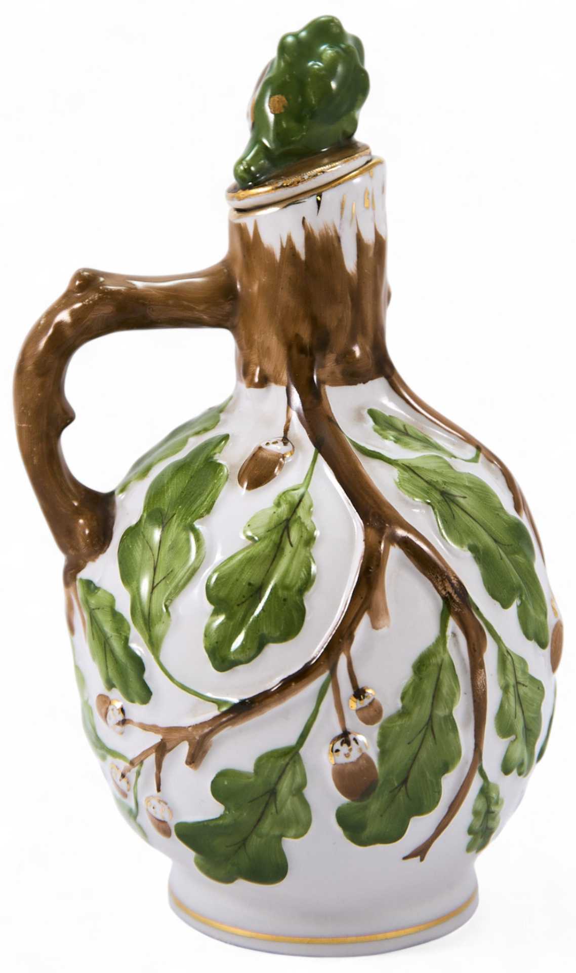 На дне кувшина присутствует марка Ленинградского фарфорового завода «ЛФЗ» (синяя, печатная, подглазурная), ставившаяся с 1930-х гг. (по настоящее время). Кувшин для вина классической формы (с широким округлым туловом и узким горлышком) украшен стилизованными рельефными изображениями дубовых ветвей и листьев. Ручка выполнена в форме