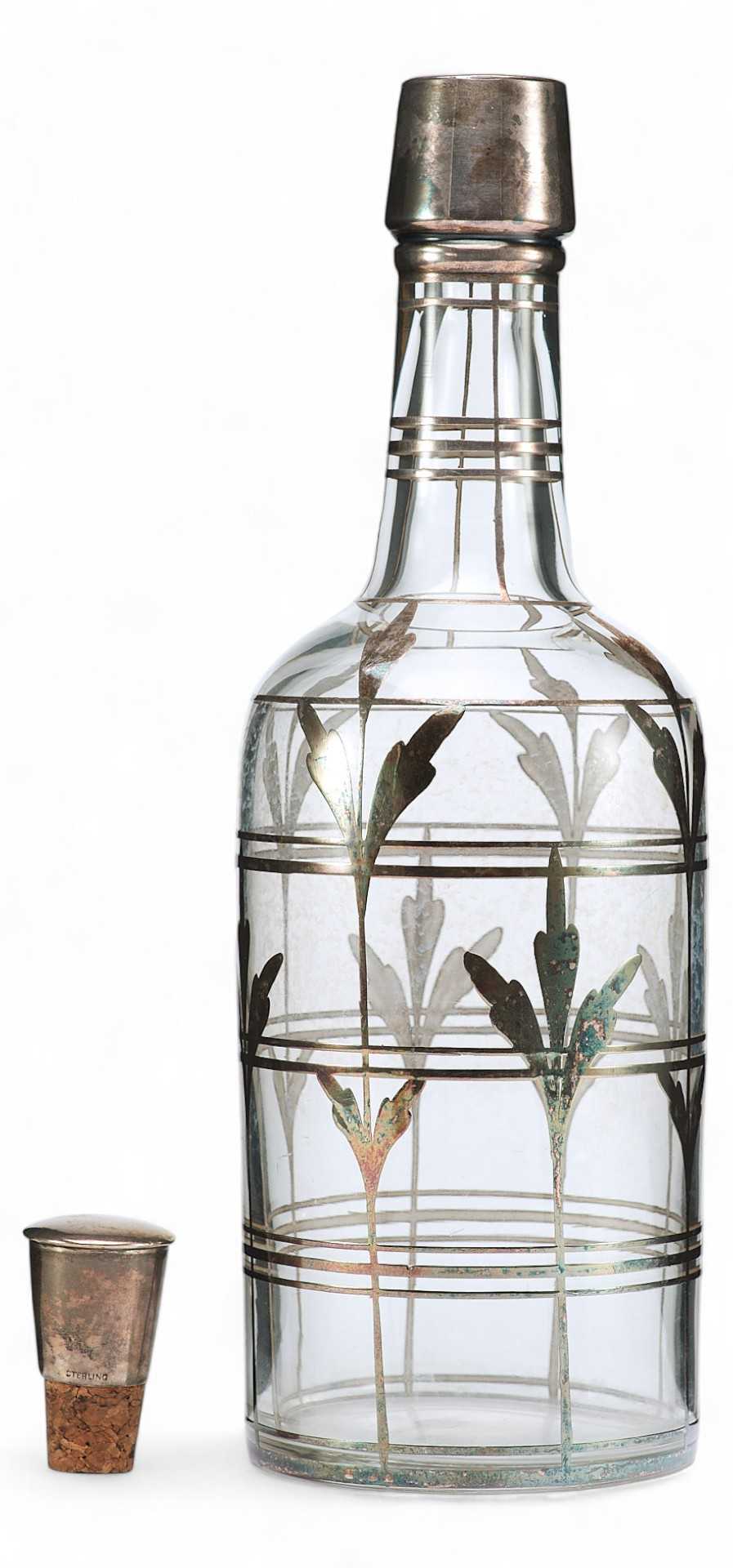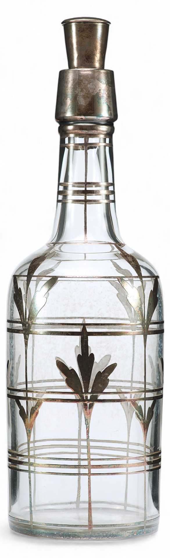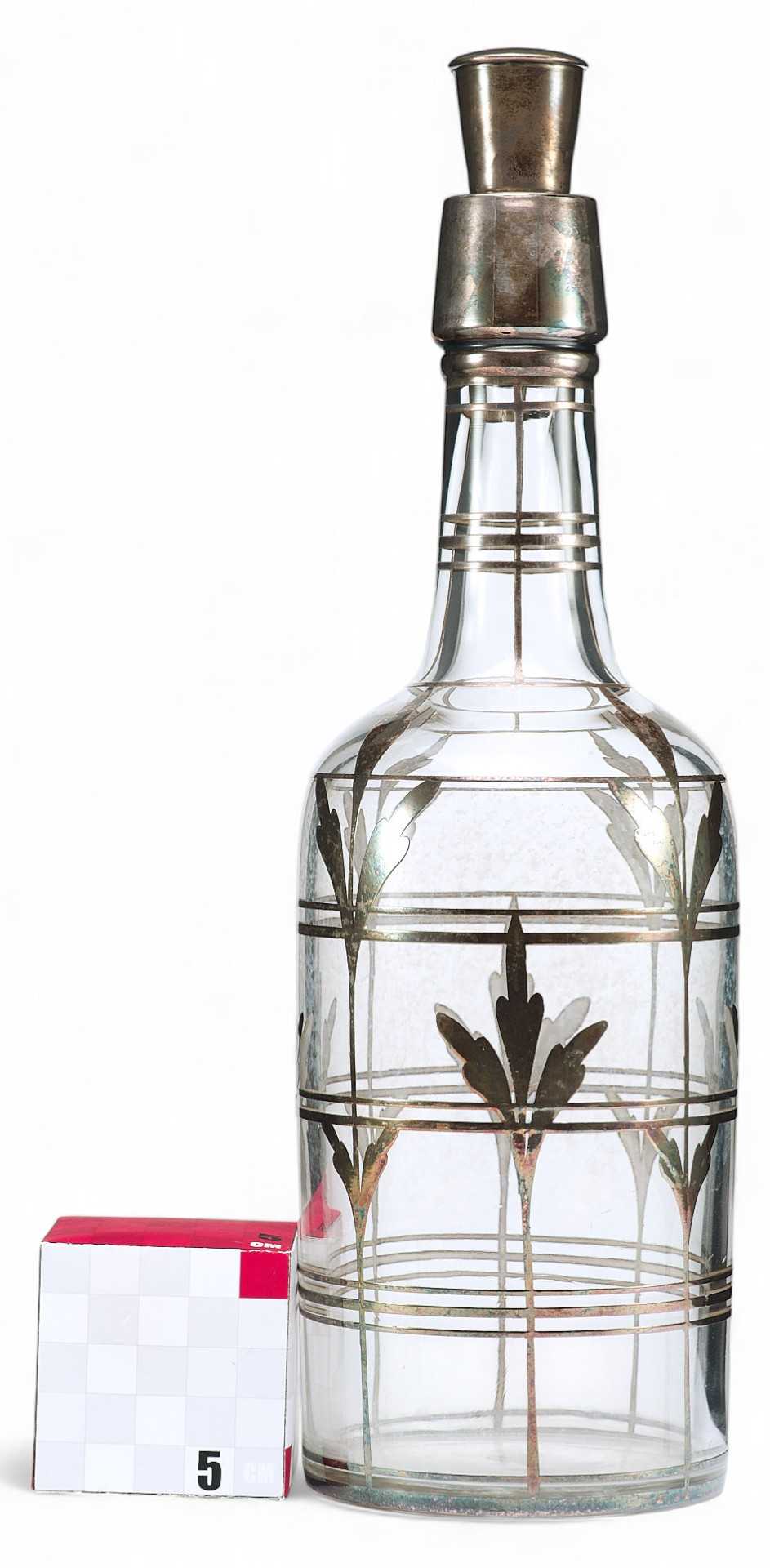 Клеймо соответствует стандарту 925 пробы серебра. Тулово графина декорировано тонкими вертикальными и горизонтальными полосами, которые создают рисунок сетки, поверх неё изображены стилизованные листья удлиненной формы. По своим художественным и стилистическим признакам и качеству обработки материала графин для алкогольных напитков относится к продукции богемских стекольных мастерских. Богемия — историческая область Чехии, в которой около четырех столетий назад появилось производство стеклянной посуды. Сначала местные стеклодувы использовали венецианское стекло, но оно не подходило для резьбы из-за своей непрочности. В итоге мастерами было создано стекло большей плотности и устойчивости.