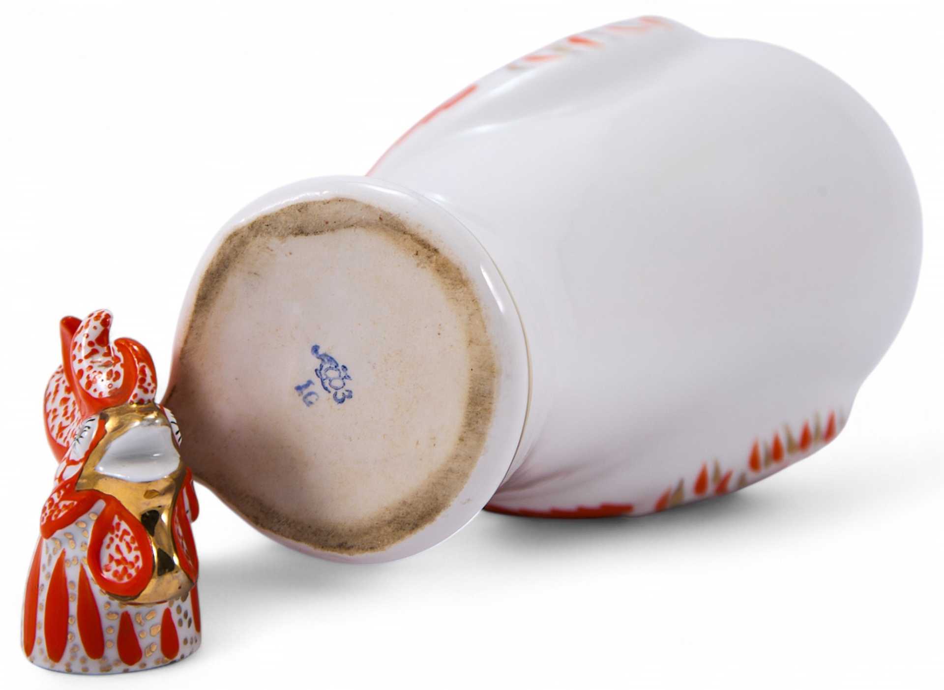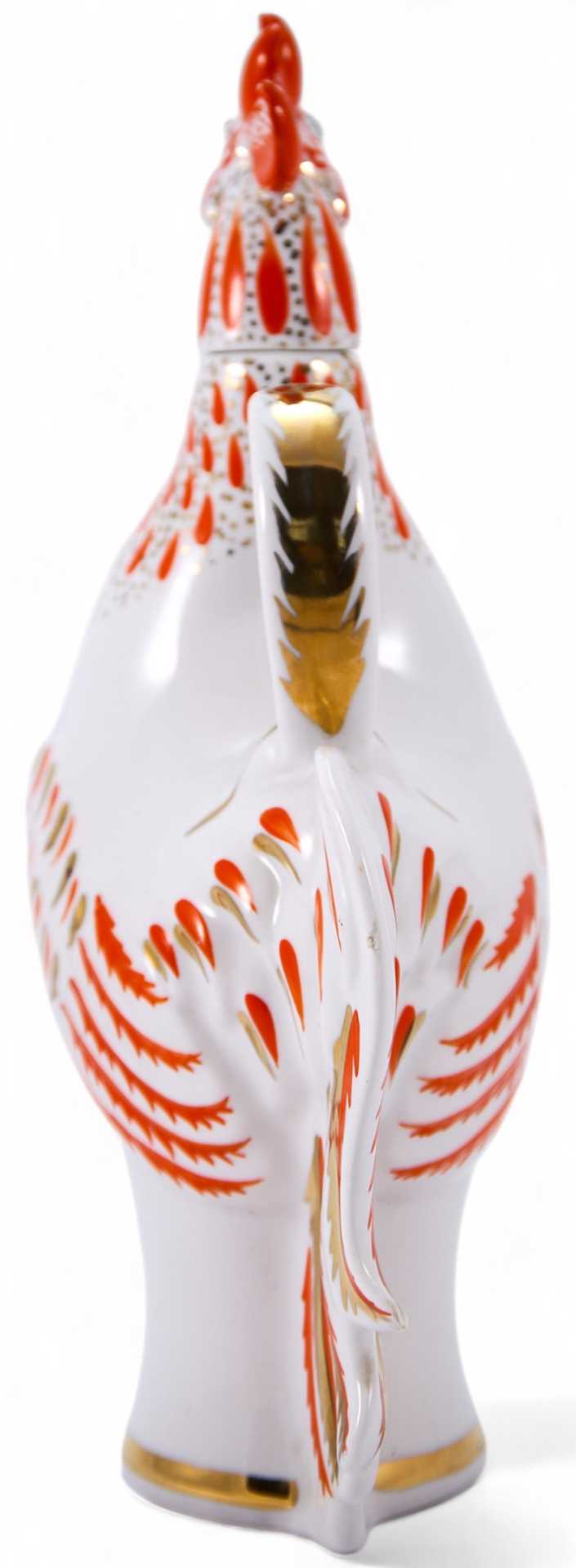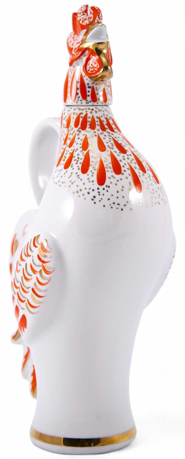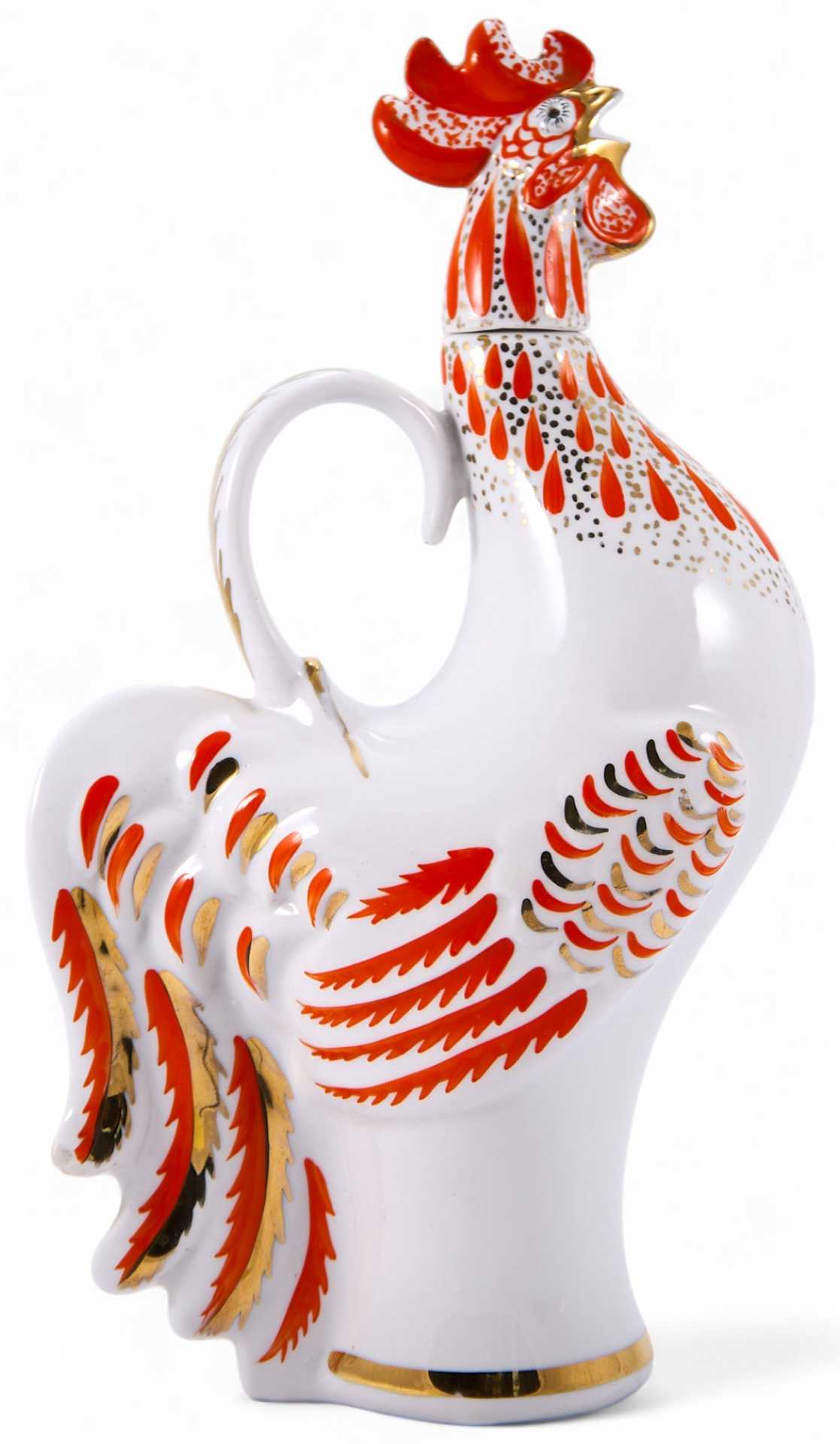представляет собой типичного сказочного, лубочно расписанного петушка. Яркий контраст красного и белого, обильный золоченый декор придают кувшину нарочитую декоративность. Предмет выполнен на хорошем техническом уровне.