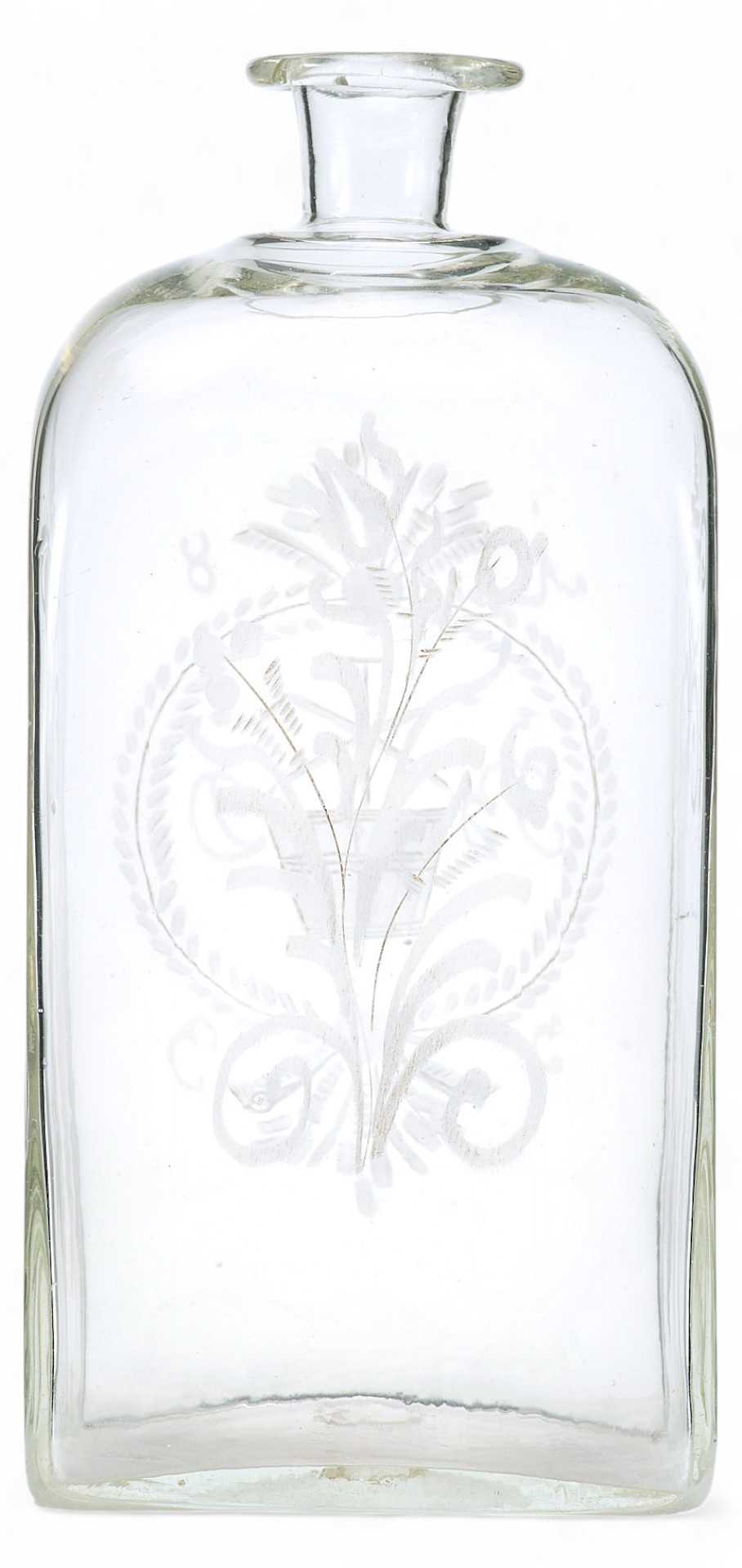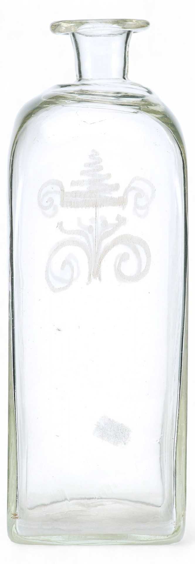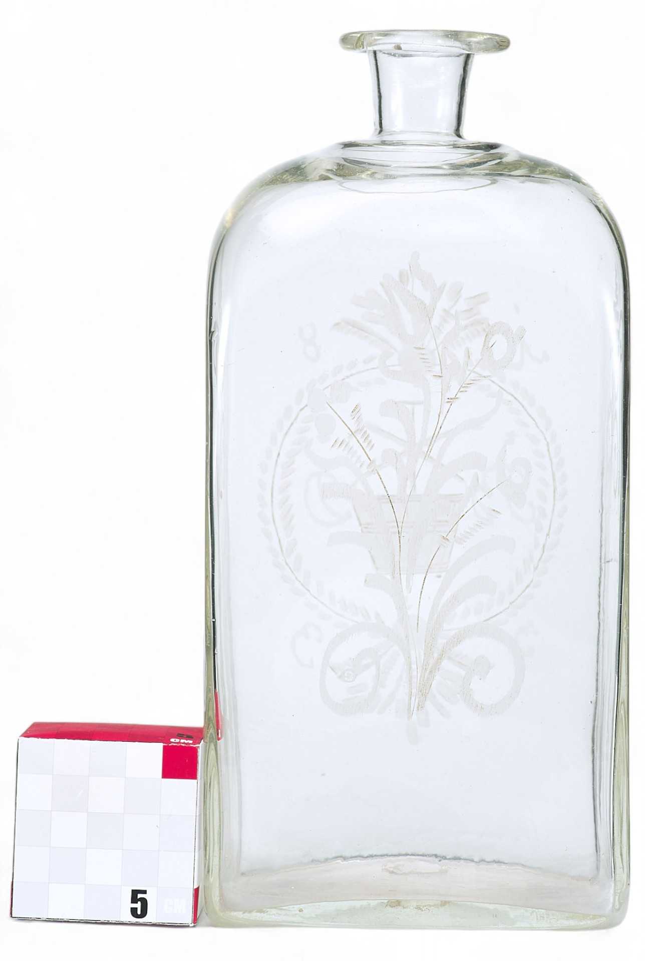 Тулово четырехгранное, горло цилиндрическое, узкое. На широкой грани изображена её обрамляет ветка с листьями и бутонами цветов в верхней и нижней части. Имеется монограмма “ВД” и дата “1833”. В середине XVII века в московском государстве назревает потребность в организации собственного стекольного производства. В высших слоях русского общества резко усиливается спрос на стекольные изделия, привезенные из Западной Европы. И если гутное стекло стало предметом быта достаточно широких демократических слоев городского населения, то в богатых домах московской знати все чаще встречаются “виницейские” зеркала из стекла, бисер и стеклянные чаши. В конце XVII — начале ХѴШ вв появляются первые отечественные предприятия. В этот период на них работают иностранные мастера, приглашенные из Богемии, Силезии, Саксонии. Русские граверы, работавшие поначалу' под руководством иностранных мастеров, успешно овладевали техникой резьбы по стеклу, постепенно вырабатывая свой собственный почерк. Они создали свой тип декора, отвечающий характеру национального художественного мышления. Наиболее популярными формами стекла были штофы, бутылки, бочонки-барилки, они почти без изменений существовали на протяжении всего ХѴПІ и даже XIX века. Штоф — сосуд для крепких спиртных напитков, ёмкостью в один штоф (1/10 ведра — 10 чарок = 1,2299 литра). Обычно штофы изготавливались из зелёного стекла и имели приземистую, четырёхгранную форму с коротким горлышком, которое закрывалось пробкой. Питейные заведения Российской империи включали категорию «штофных лавок», которые торговали спиртным в запечатанных бутылках-штофах.
