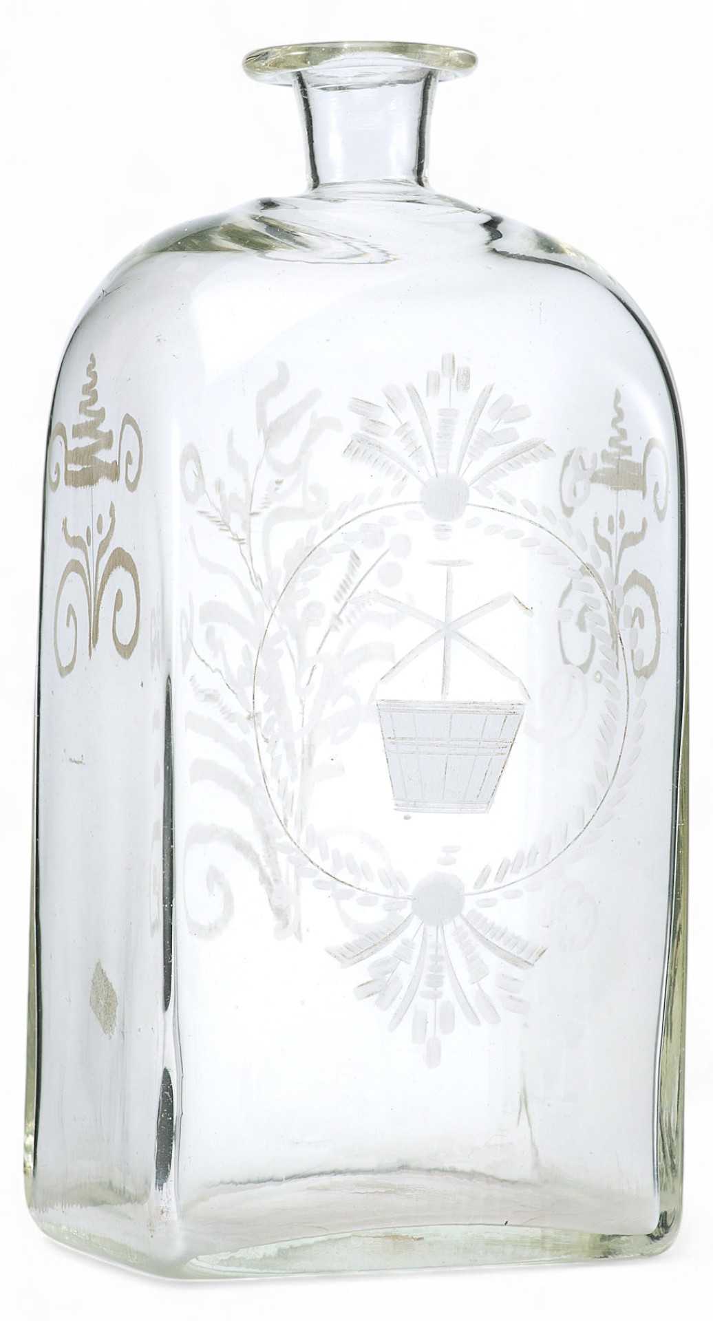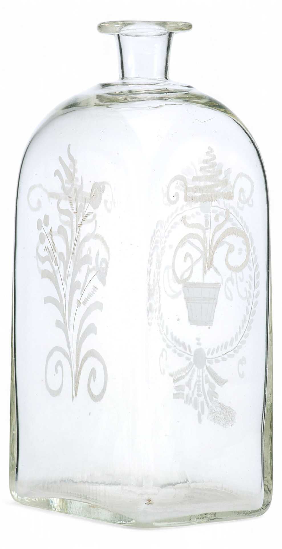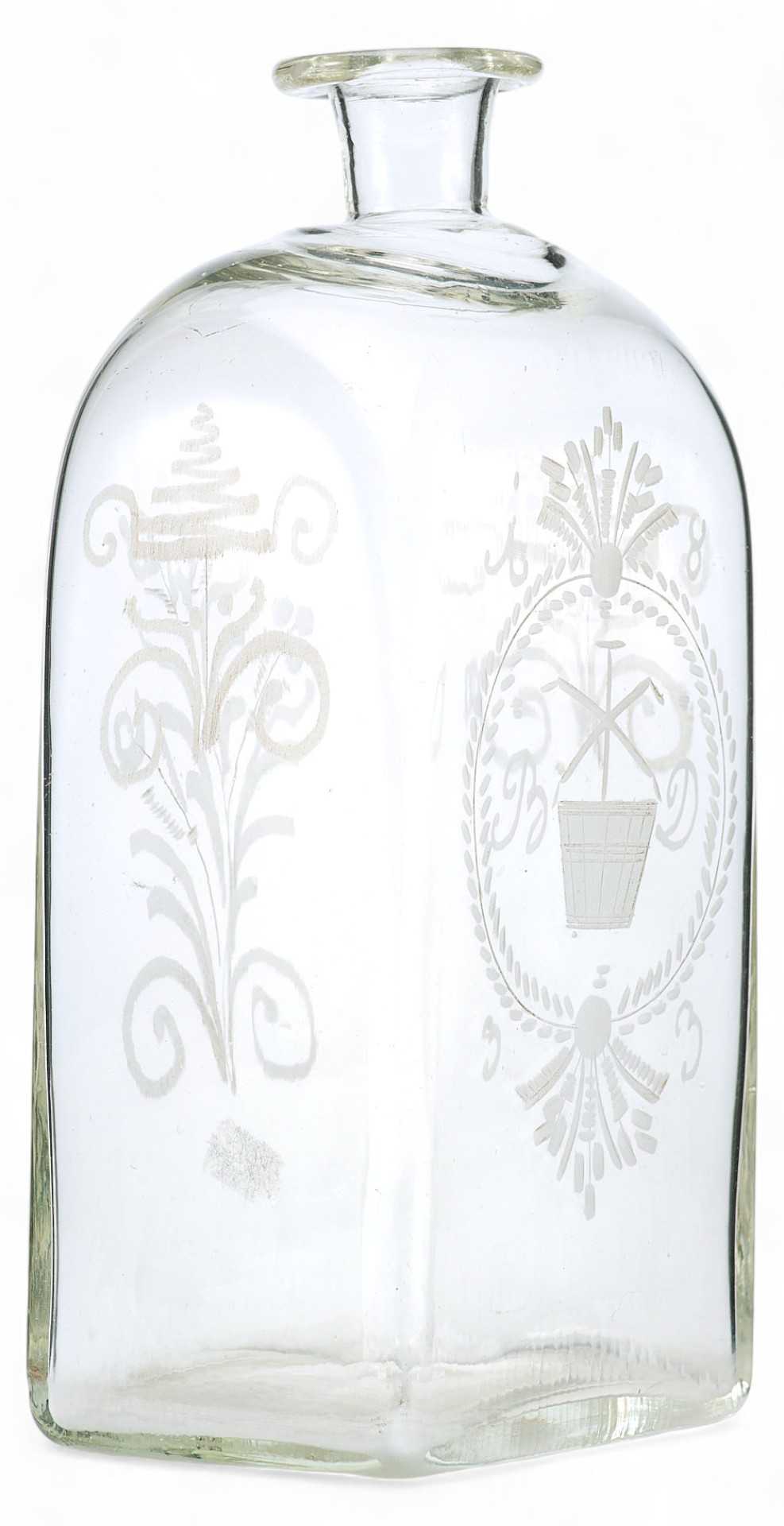 Тулово четырехгранное, горло цилиндрическое, узкое. На широкой грани изображена её обрамляет ветка с листьями и бутонами цветов в верхней и нижней части. Имеется монограмма “ВД” и дата “1833”. В середине XVII века в московском государстве назревает потребность в организации собственного стекольного производства. В высших слоях русского общества резко усиливается спрос на стекольные изделия, привезенные из Западной Европы. И если гутное стекло стало предметом быта достаточно широких демократических слоев городского населения, то в богатых домах московской знати все чаще встречаются “виницейские” зеркала из стекла, бисер и стеклянные чаши. В конце XVII — начале ХѴШ вв появляются первые отечественные предприятия. В этот период на них работают иностранные мастера, приглашенные из Богемии, Силезии, Саксонии. Русские граверы, работавшие поначалу' под руководством иностранных мастеров, успешно овладевали техникой резьбы по стеклу, постепенно вырабатывая свой собственный почерк. Они создали свой тип декора, отвечающий характеру национального художественного мышления. Наиболее популярными формами стекла были штофы, бутылки, бочонки-барилки, они почти без изменений существовали на протяжении всего ХѴПІ и даже XIX века. Штоф — сосуд для крепких спиртных напитков, ёмкостью в один штоф (1/10 ведра — 10 чарок = 1,2299 литра). Обычно штофы изготавливались из зелёного стекла и имели приземистую, четырёхгранную форму с коротким горлышком, которое закрывалось пробкой. Питейные заведения Российской империи включали категорию «штофных лавок», которые торговали спиртным в запечатанных бутылках-штофах.