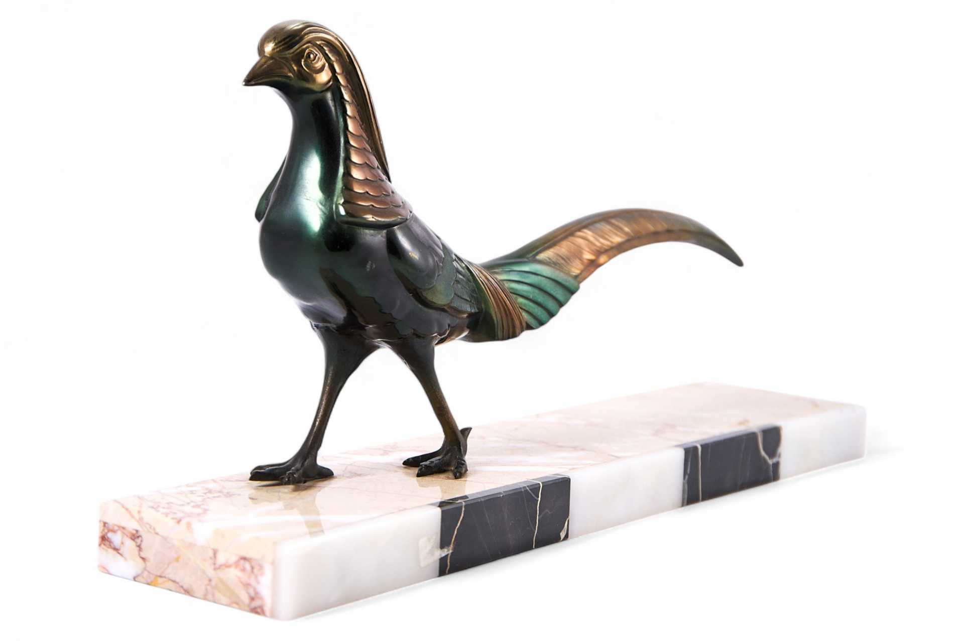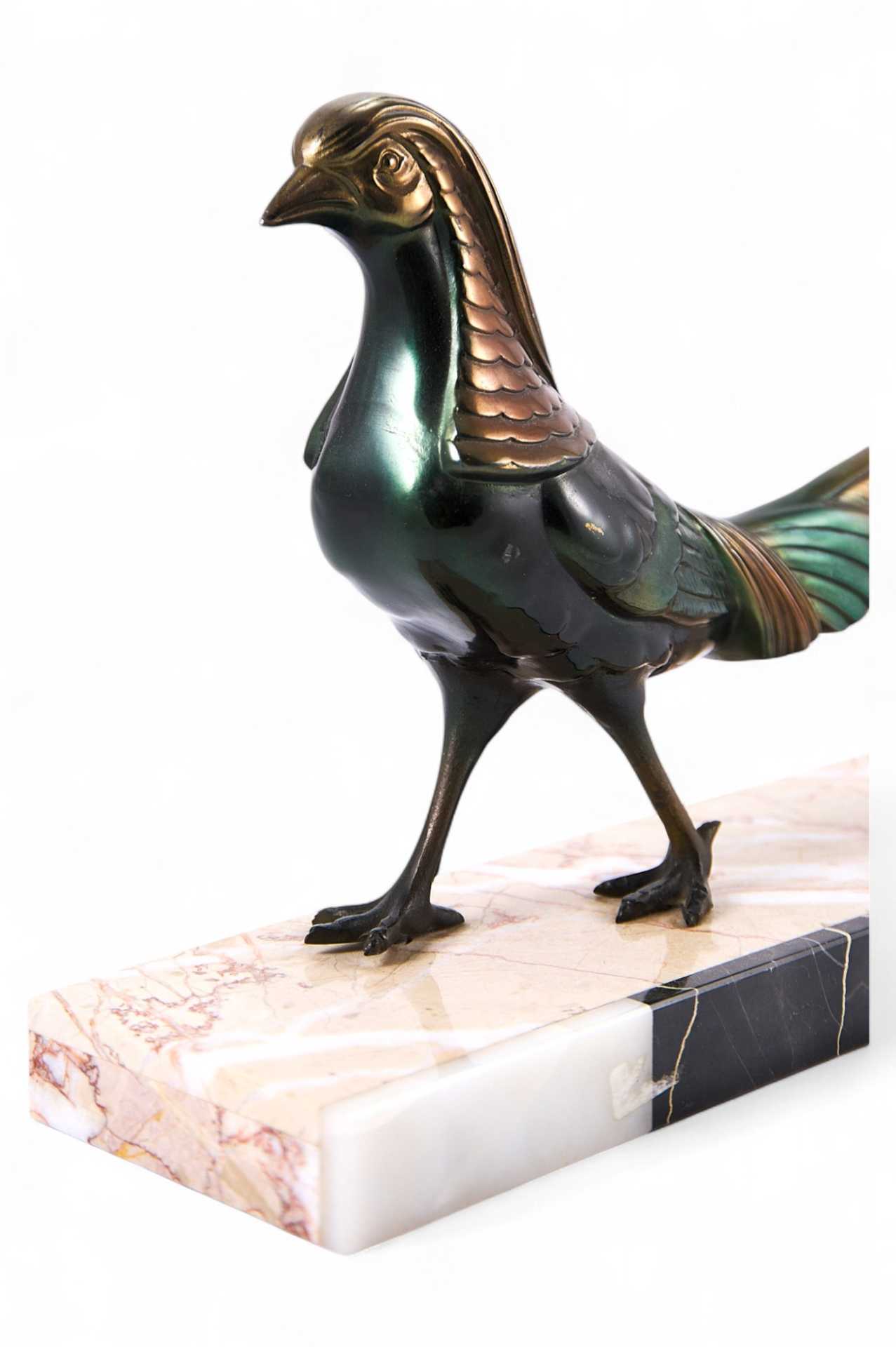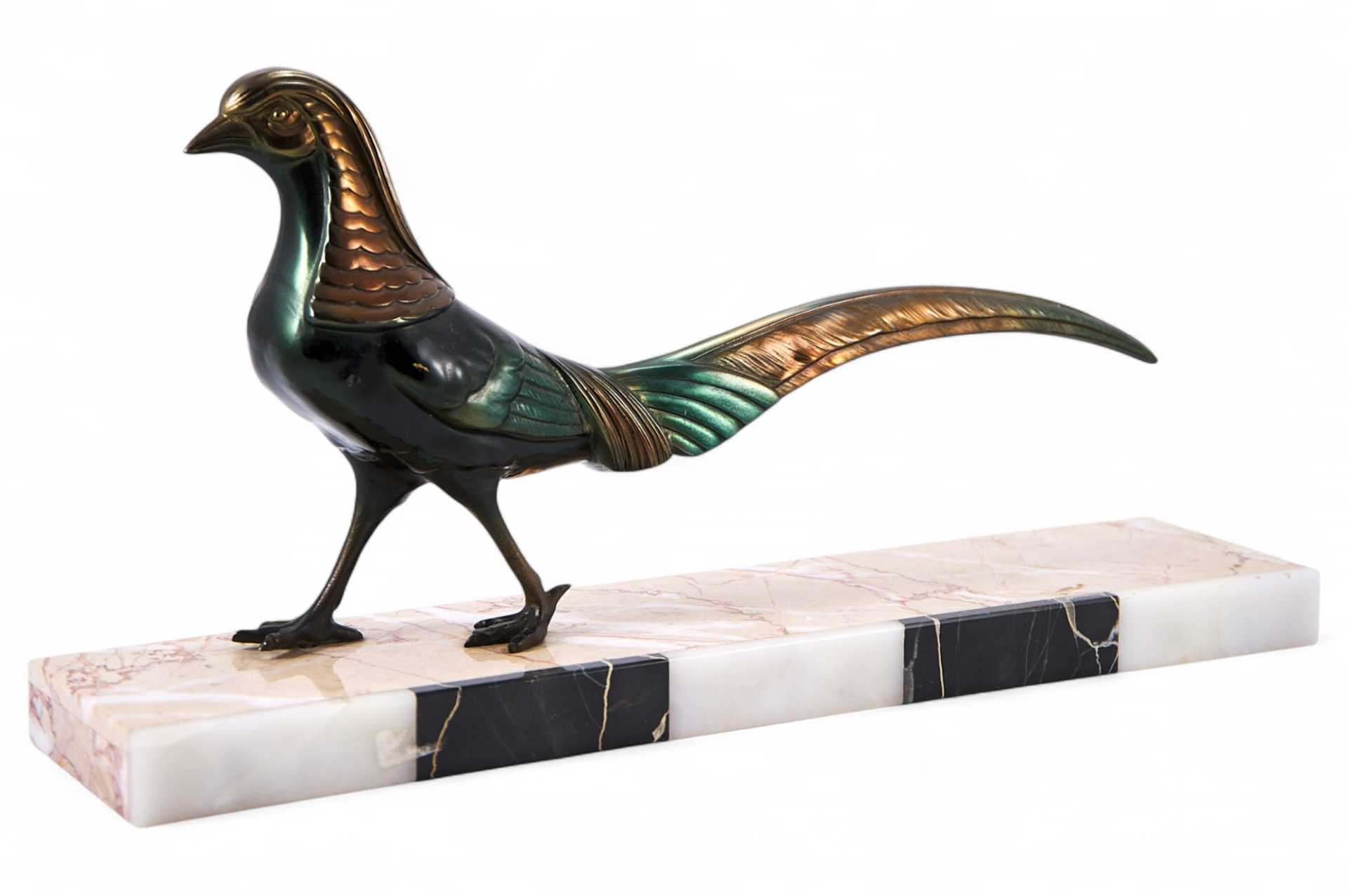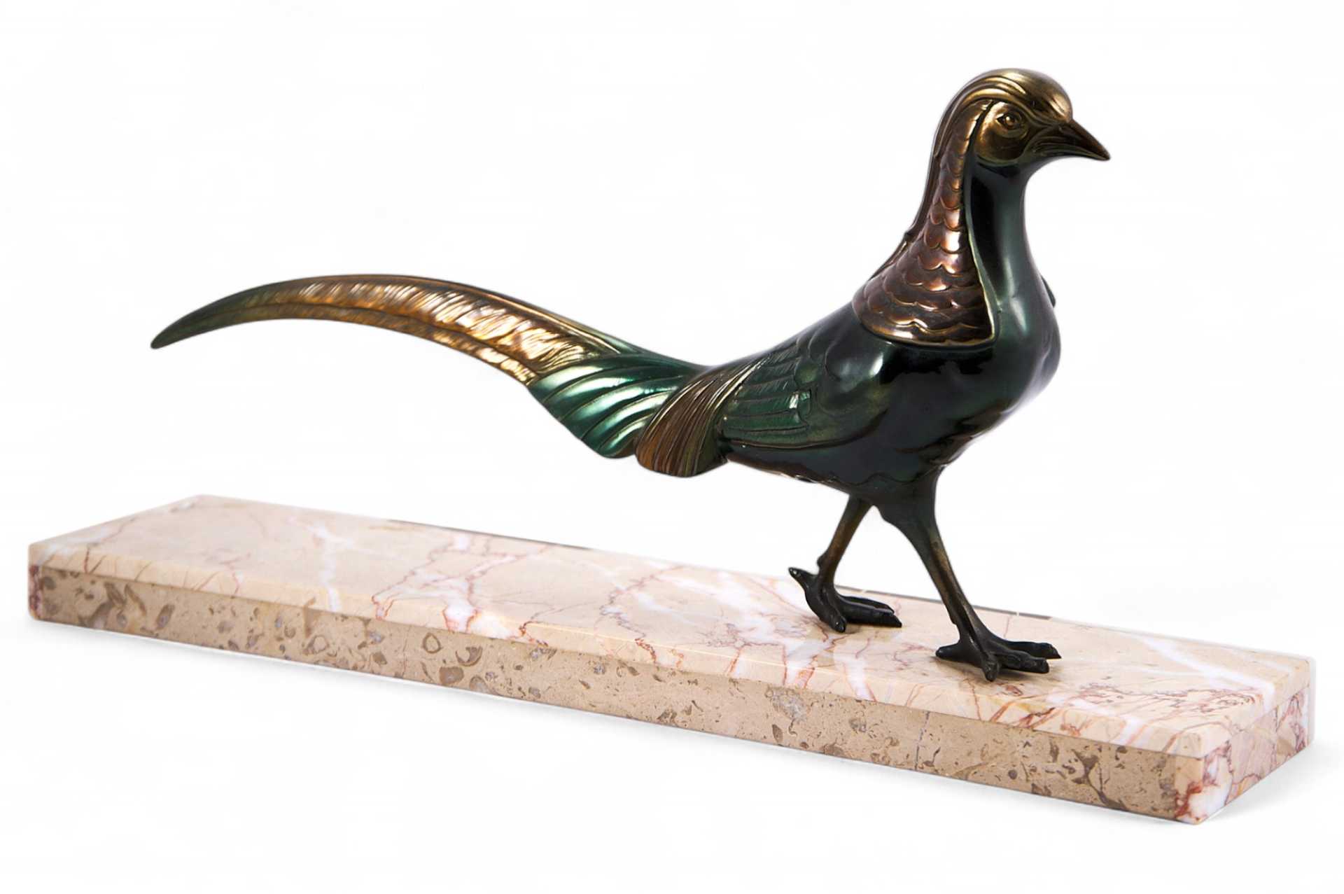Металлическая скульптура фазана, поверхность которой обработана цветным ирризирующим патинированием. Скульптура установлена на прямоугольном основании, изготовленном из разных пород мрамора.