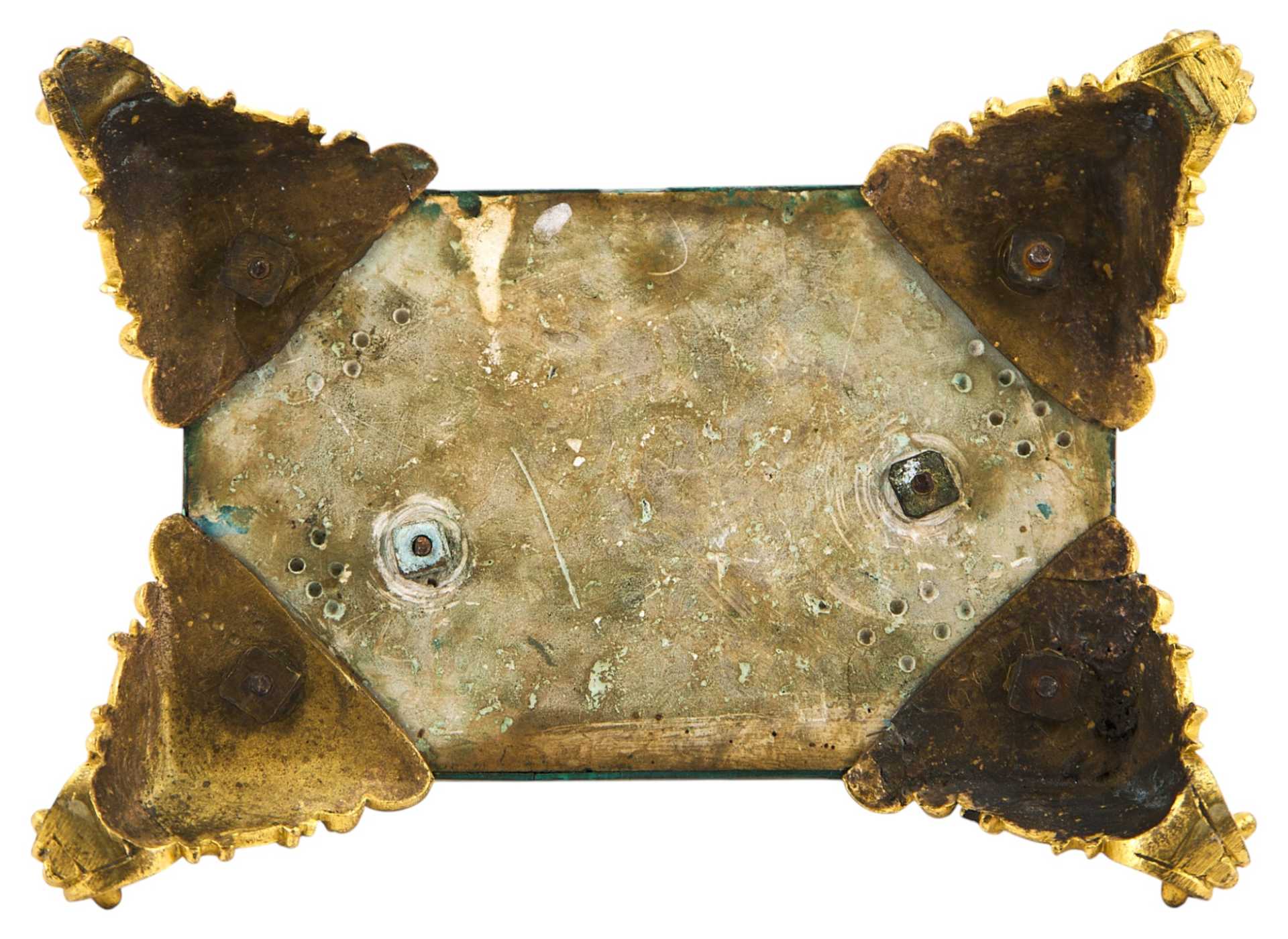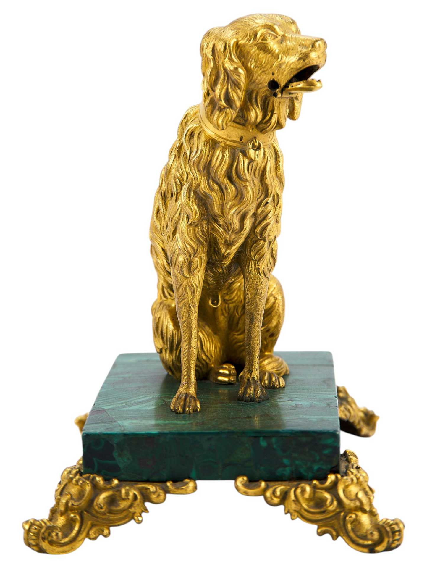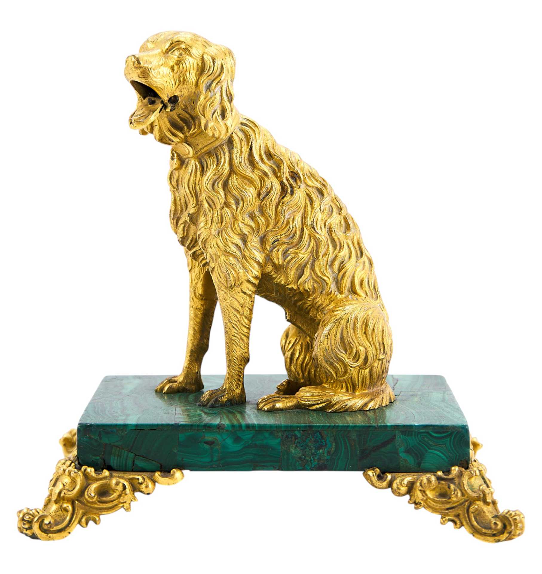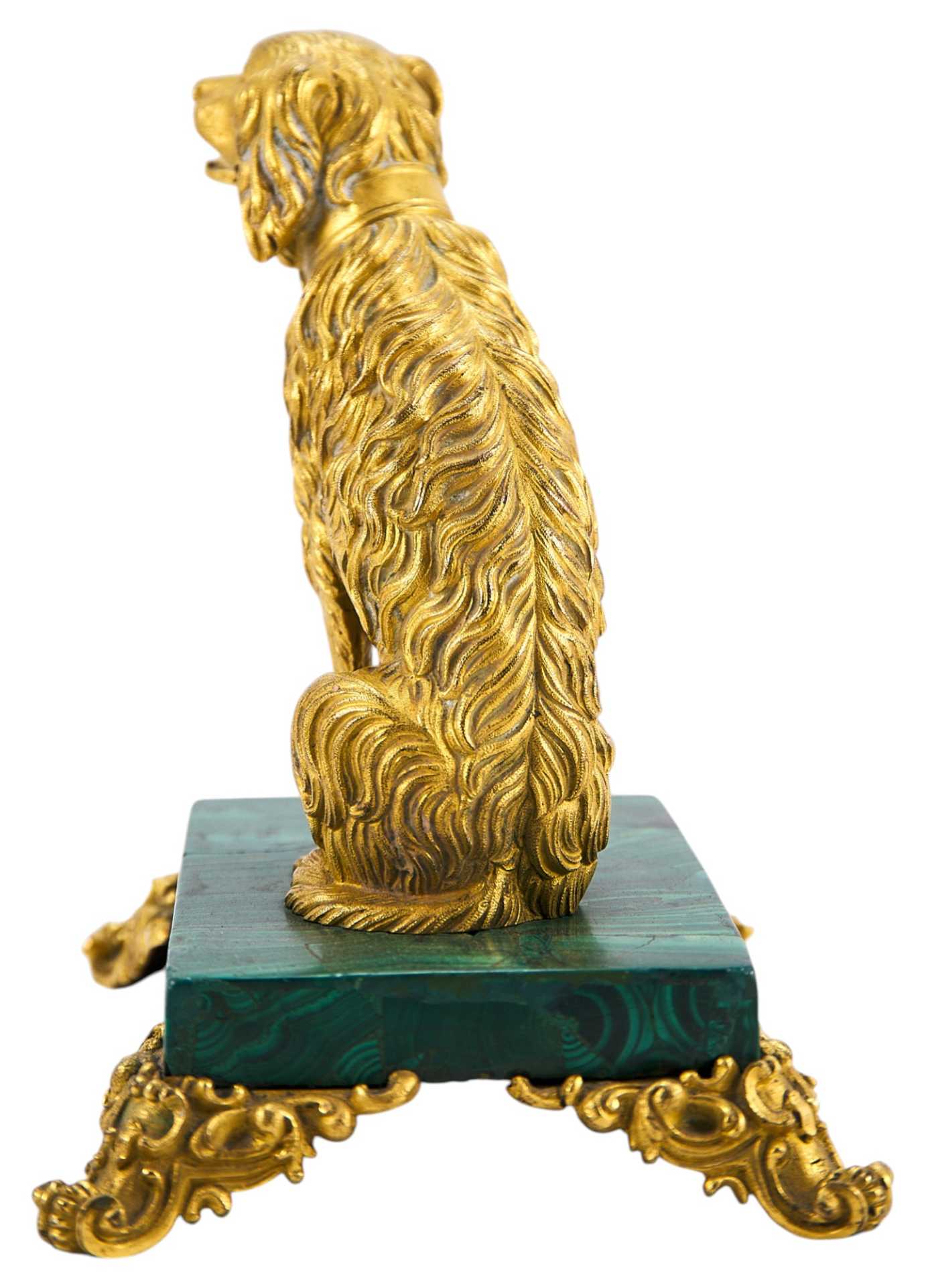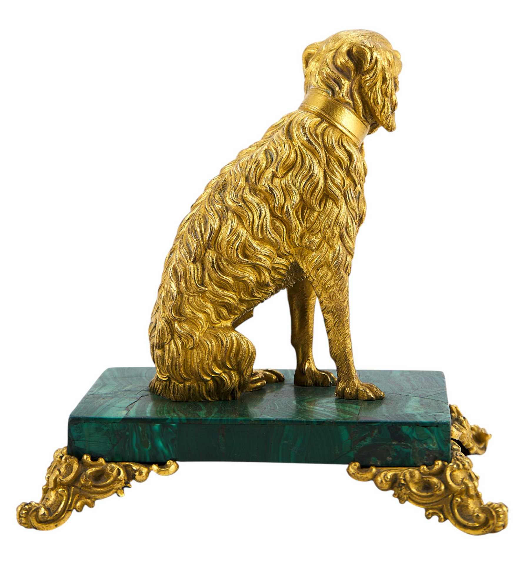 Скульптура представляет собой малахитовом постаменте. Фигура собаки реалистична, удачно передана волнистая шерсть животного, несмотря на то, что в целом образ немного примитивен. Композиция статична. Золоченый цвет и фактура шерсти собаки перекликаются с фигурными ножками, оформляющими малахитовую пластину. Предмет является прекрасным образцом органичного слияния различных материалов и техник. Кабинетная скульптура подобного рода пользовалась