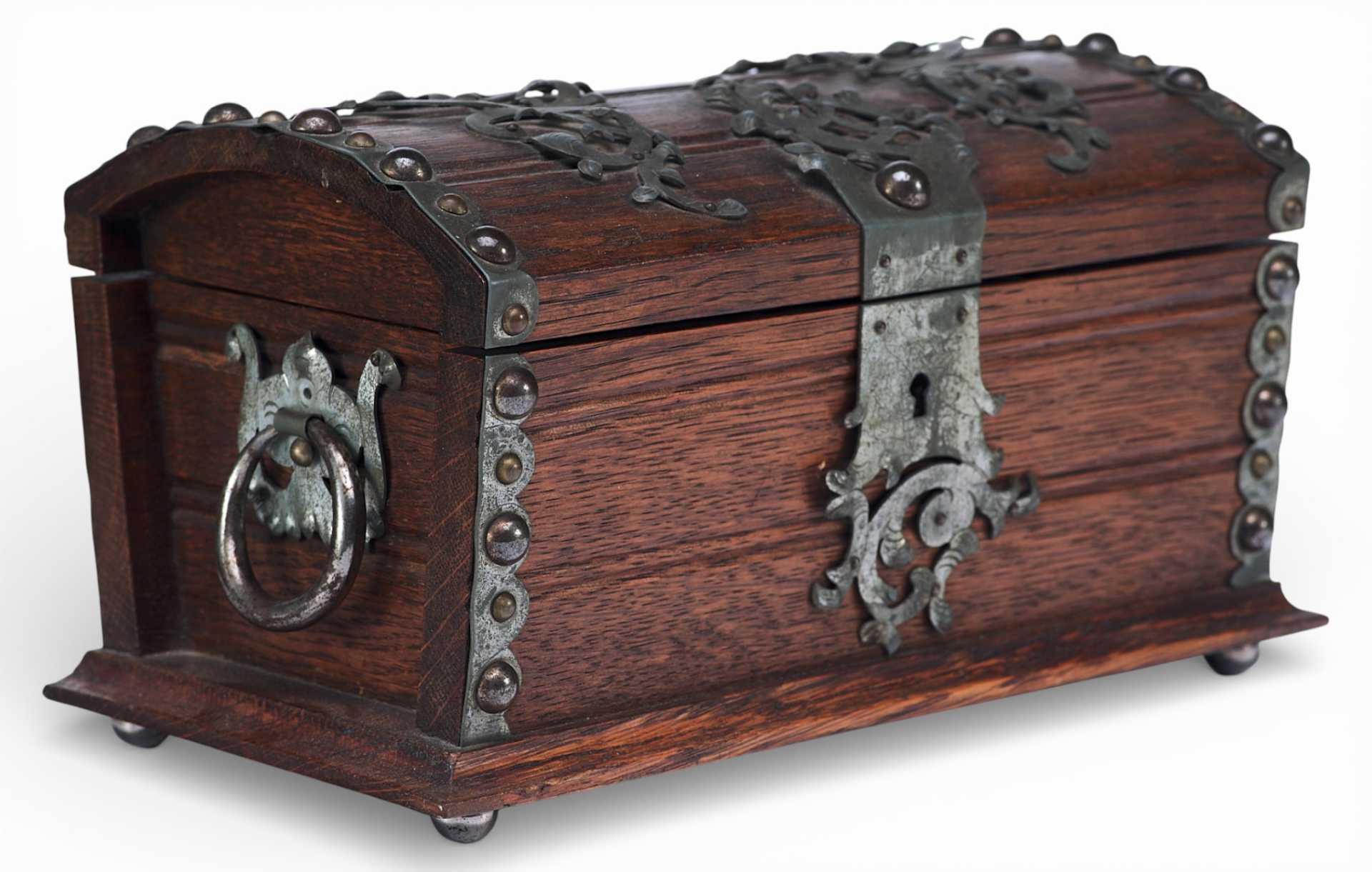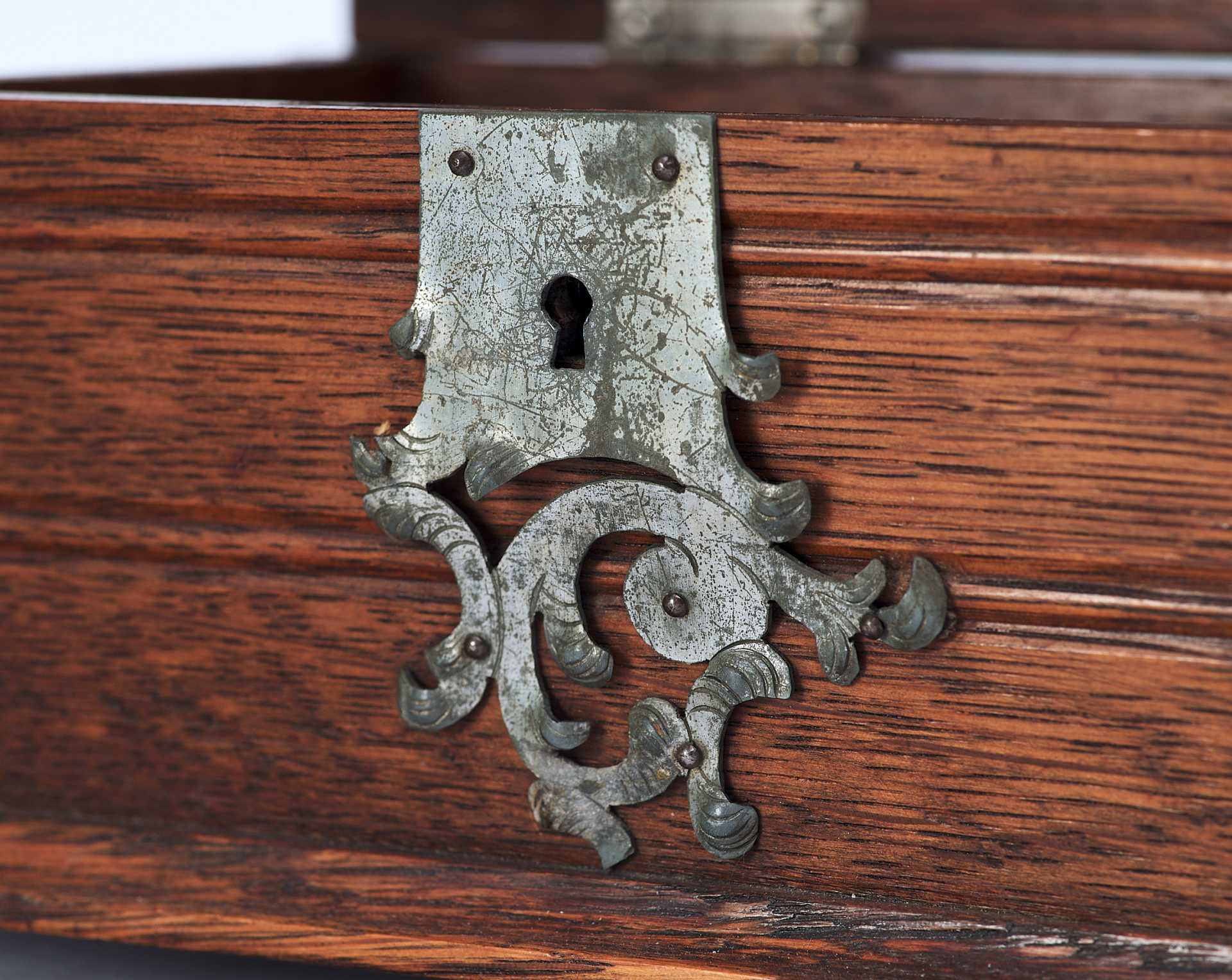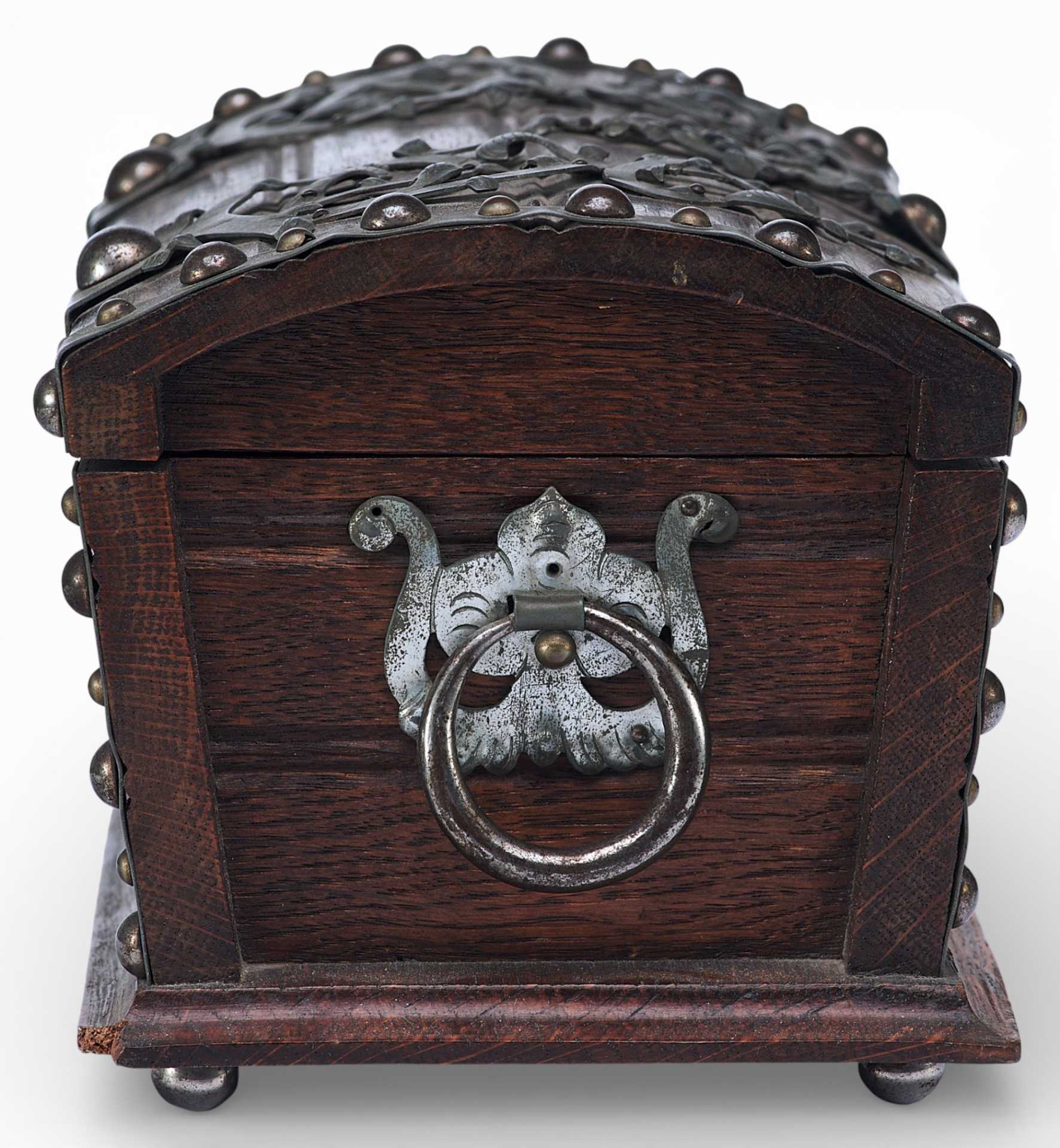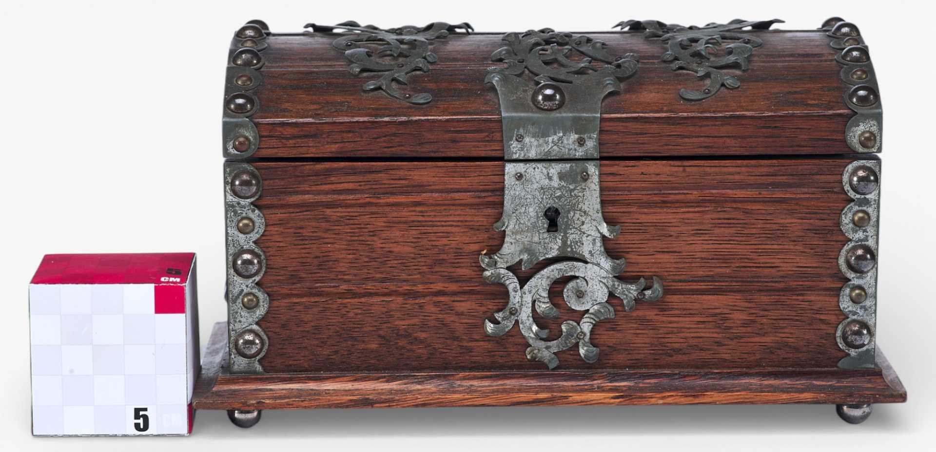 Представлен сундучок, украшенный жестяными накладками, и окованный по углам полосками металла. Художественное оформление и сочетание материалов сундучка сочетает в себе стилевые признаки мебели романского периода и орнаментальные элементы рококо. Такое сочетание стилевых элементов использовалось в дизайне предметов интерьера, украшенных в псевдоисторических стилях.