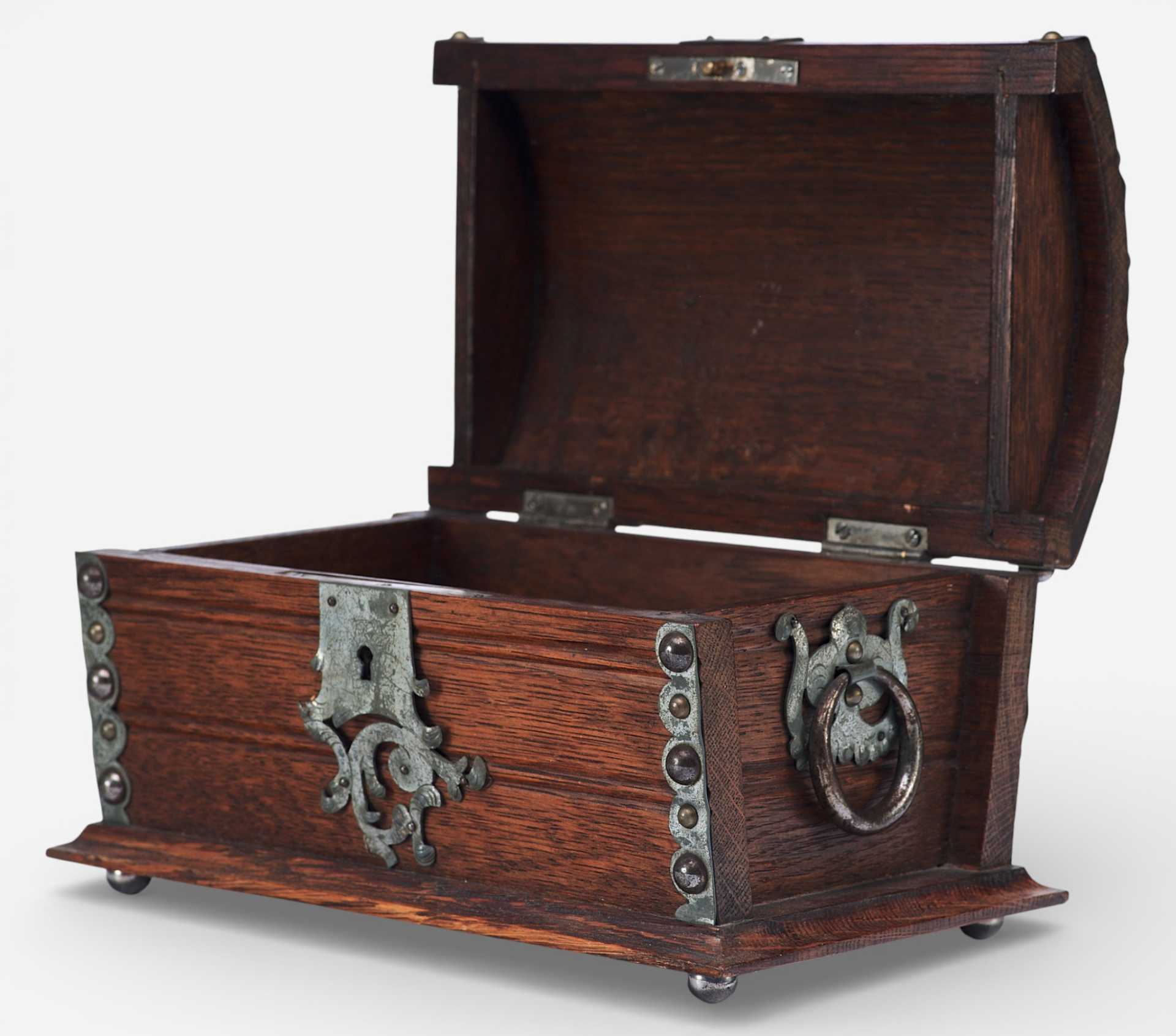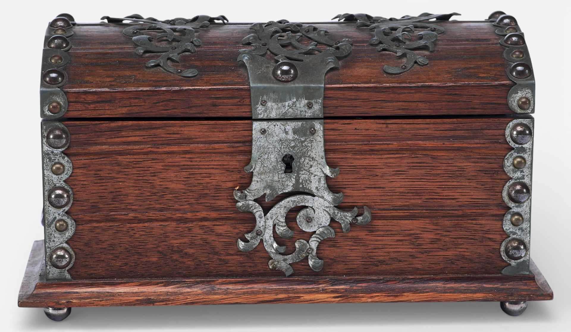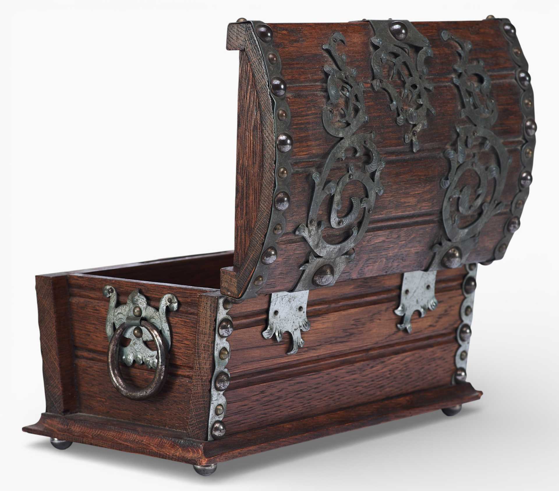Представлен сундучок, украшенный жестяными накладками, и окованный по углам полосками металла. Художественное оформление и сочетание материалов сундучка сочетает в себе стилевые признаки мебели романского периода и орнаментальные элементы рококо. Такое сочетание стилевых элементов использовалось в дизайне предметов интерьера, украшенных в псевдоисторических стилях.