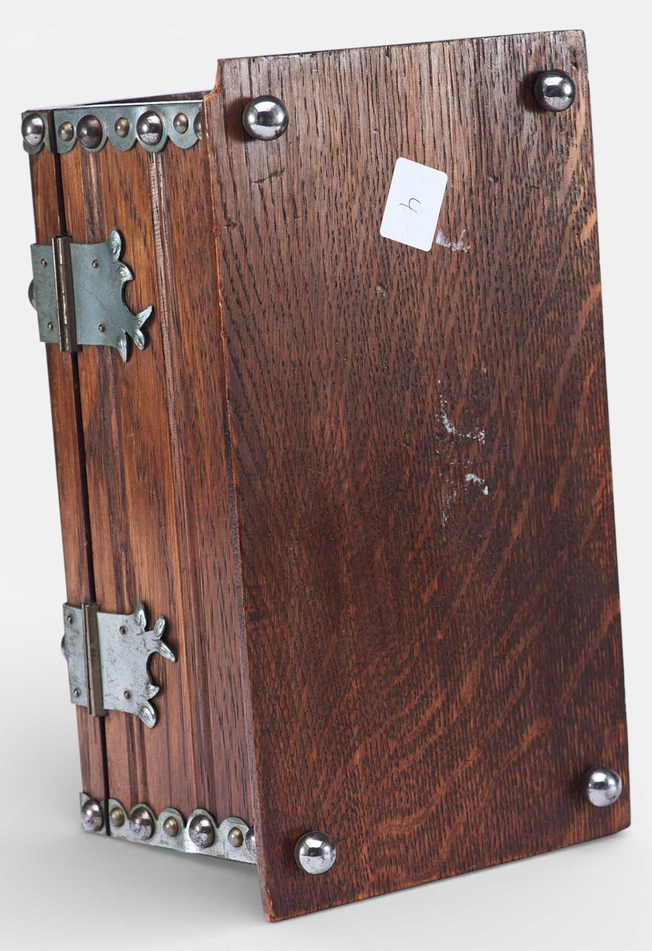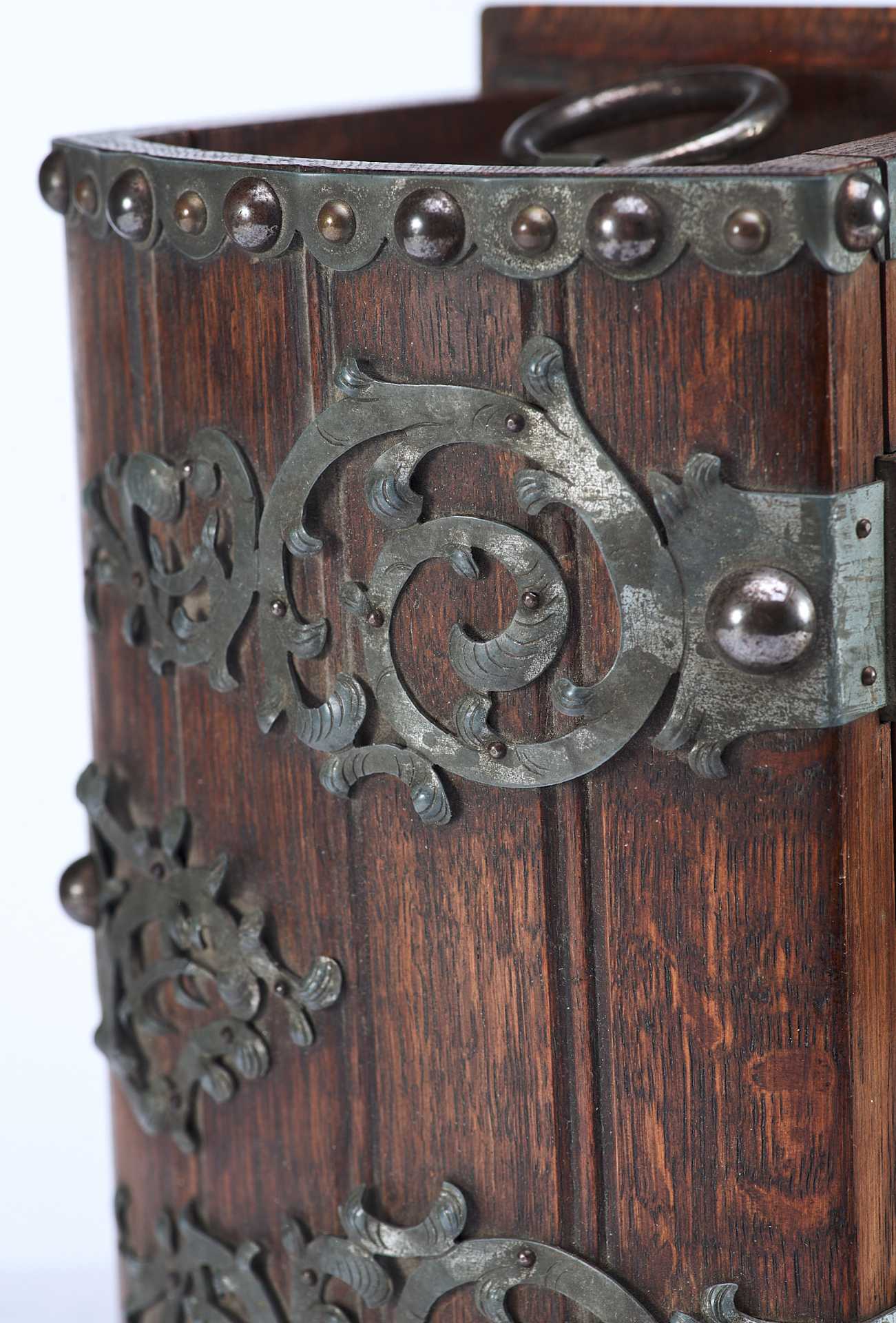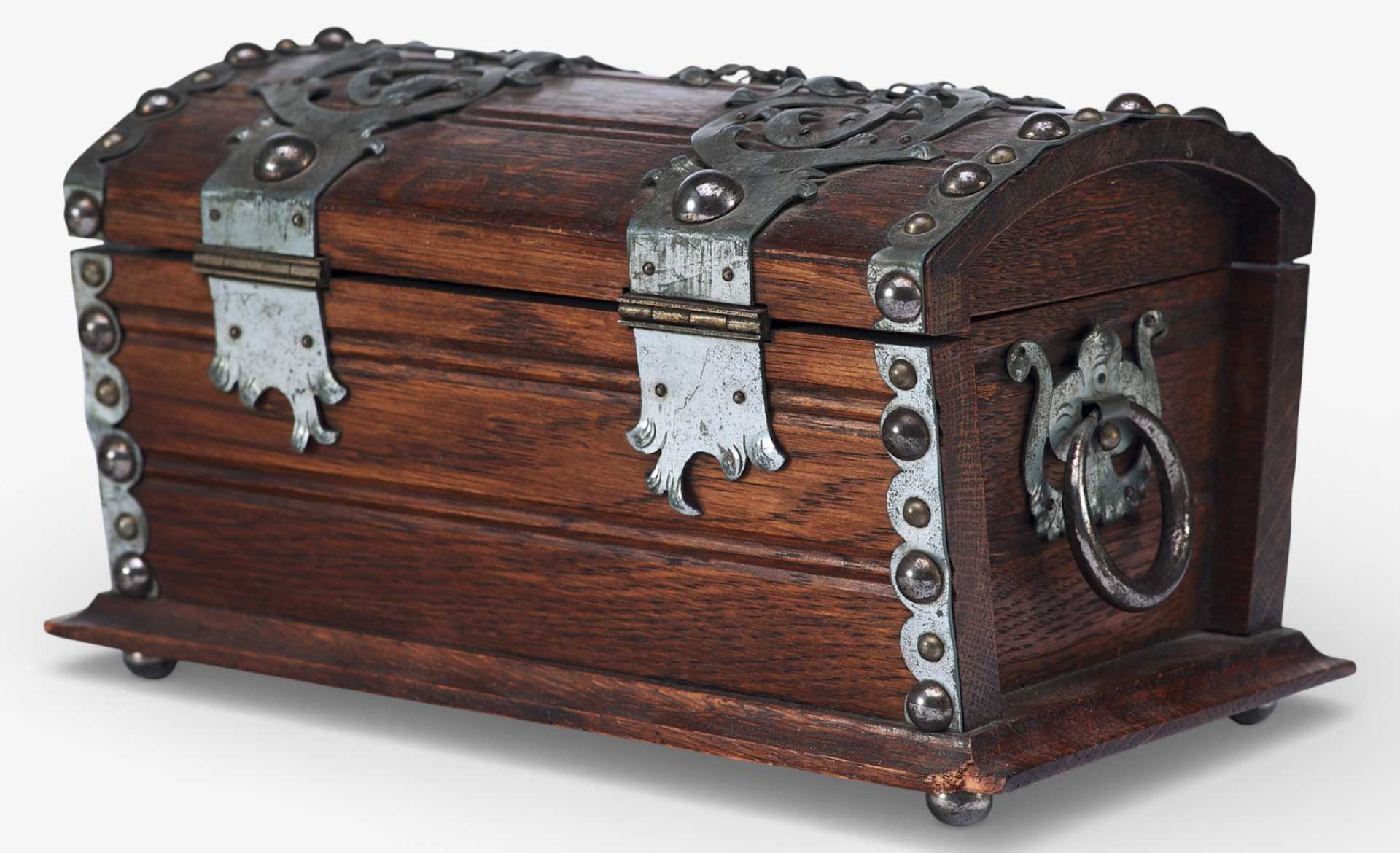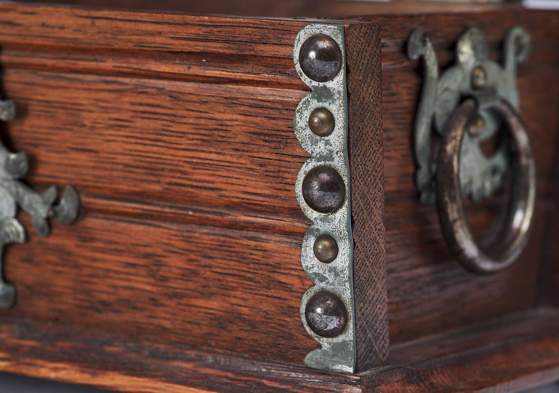 Представлен сундучок, украшенный жестяными накладками, и окованный по углам полосками металла. Художественное оформление и сочетание материалов сундучка сочетает в себе стилевые признаки мебели романского периода и орнаментальные элементы рококо. Такое сочетание стилевых элементов использовалось в дизайне предметов интерьера, украшенных в псевдоисторических стилях.