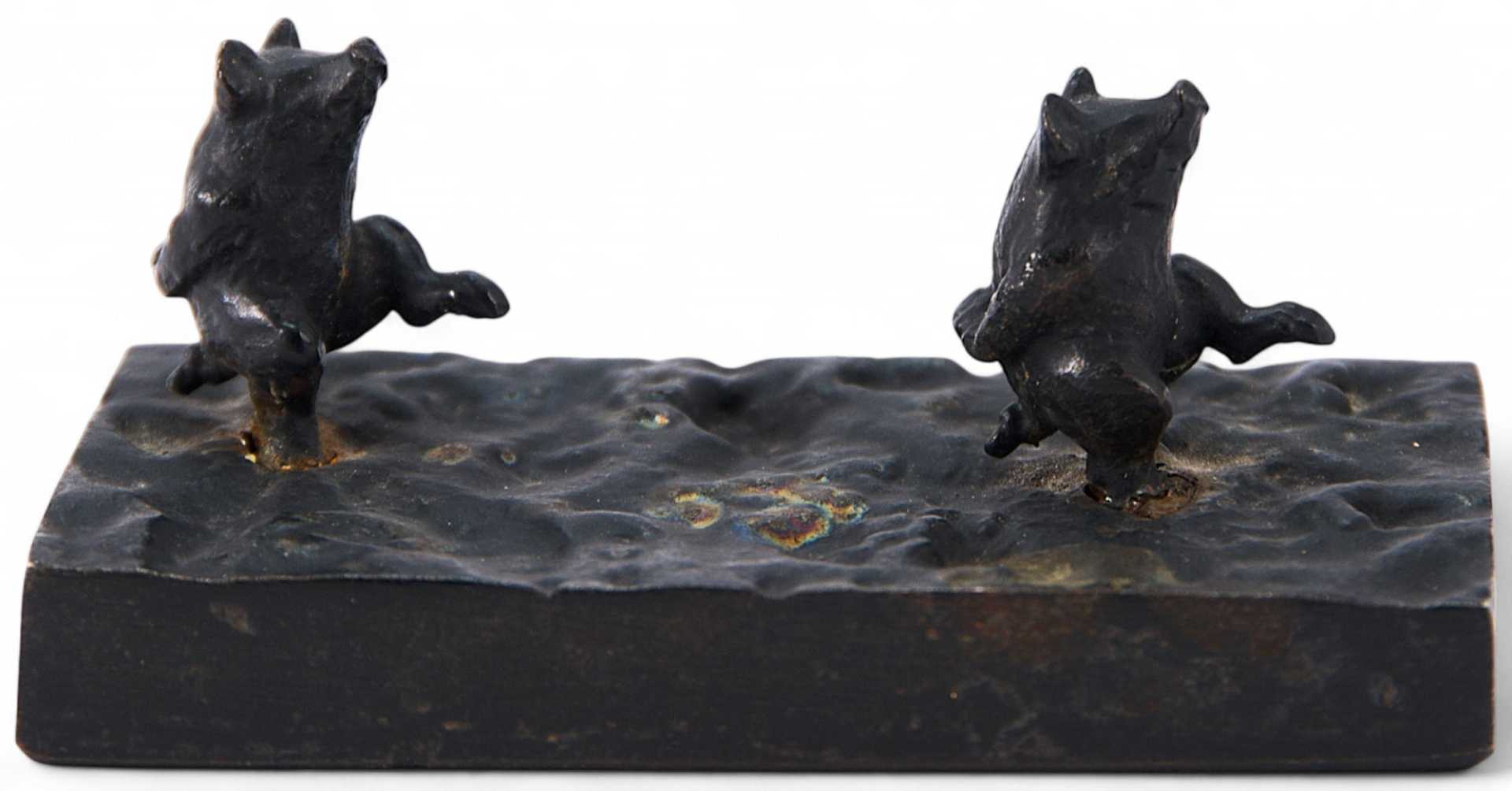 Пресс-папье в виде анималистической композиции, представляющей приплясывающих поросят на прогулке. На основании надпись: «Касли». В репринтном издании каталога-прейскуранта «Литье Каслинского завода Кыштымского округа. Художественные вещи» этот предмет указан под номером 40, в разделе «Пресс-папье».