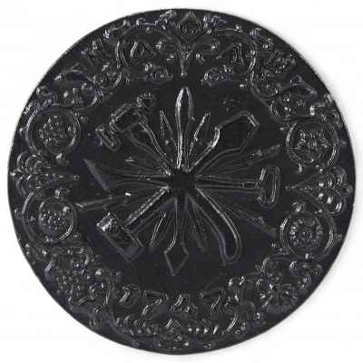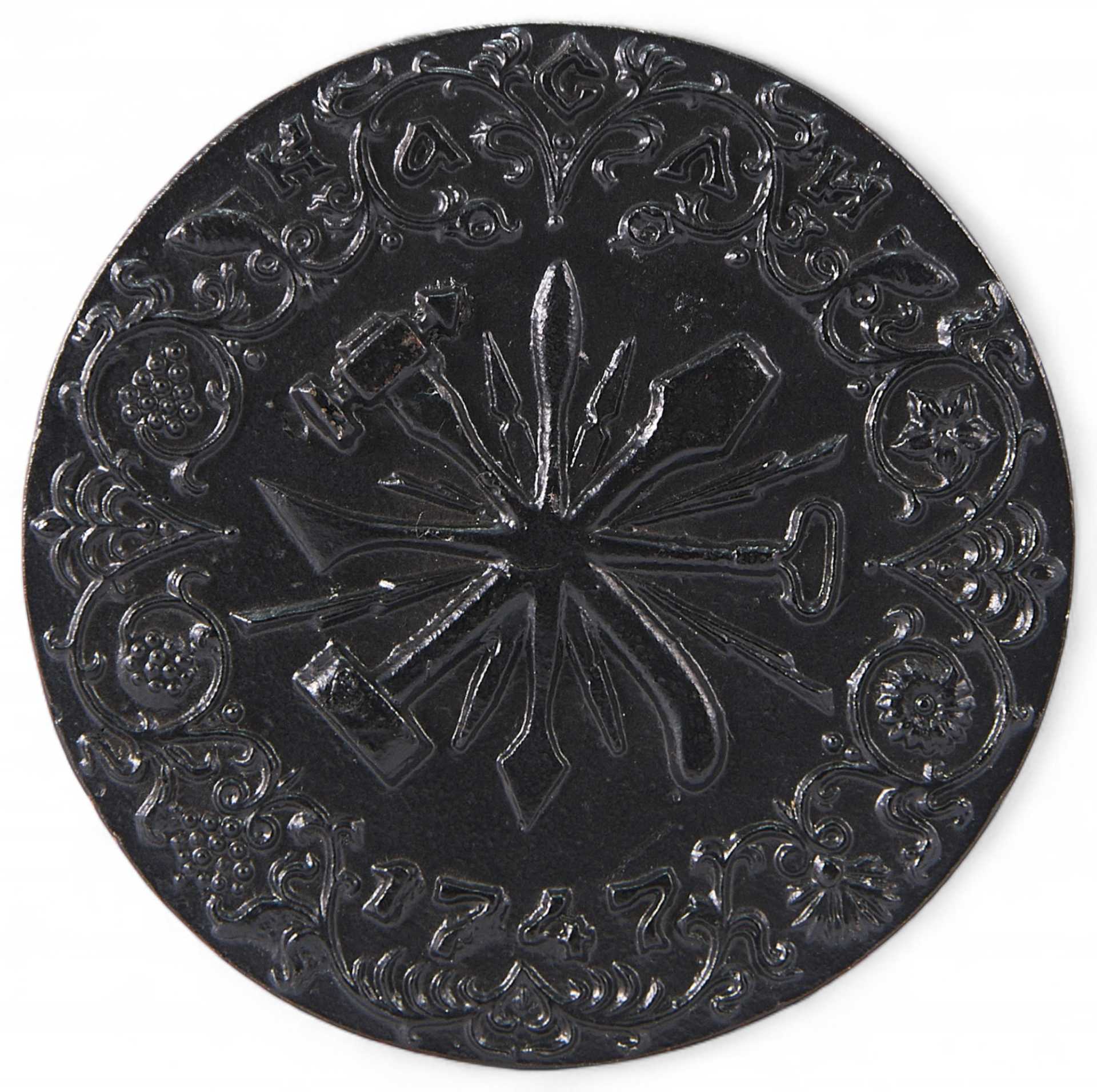 орнамента надпись “КАСЛИ”, в нижней указана дата 1747. В центре медали изображены инструменты каслинских мастеров.