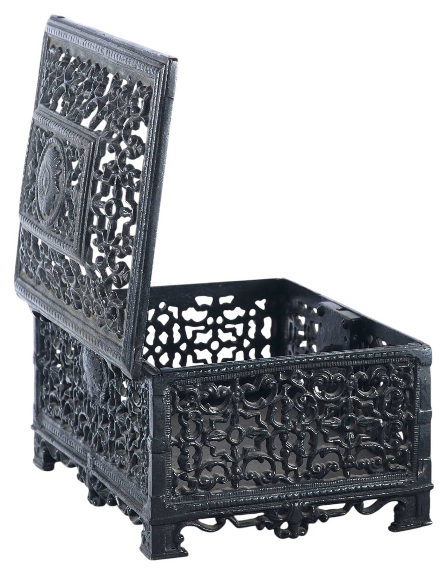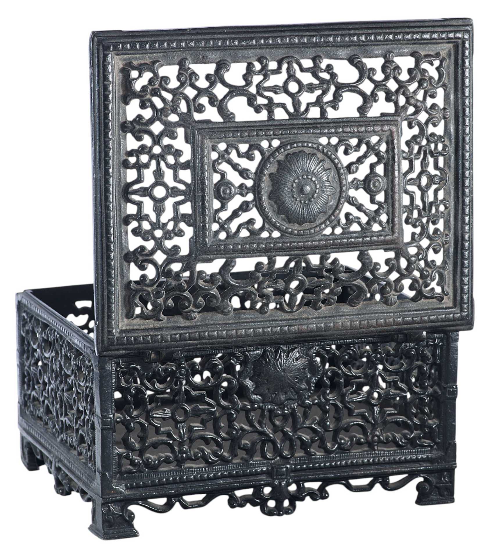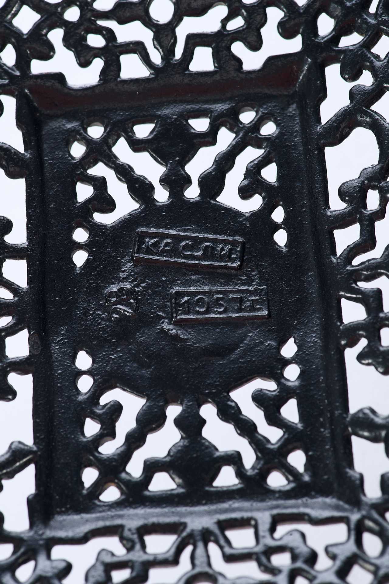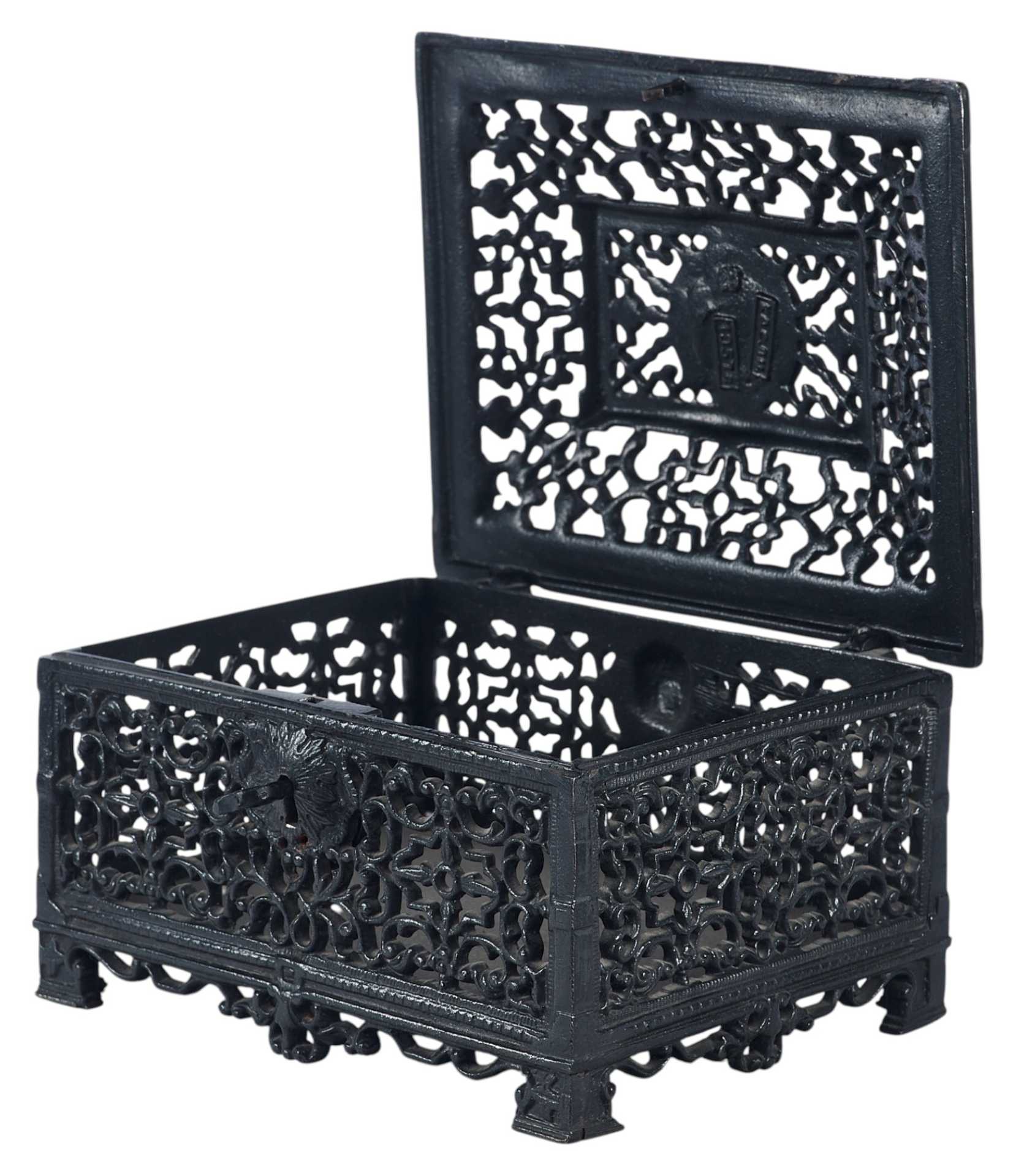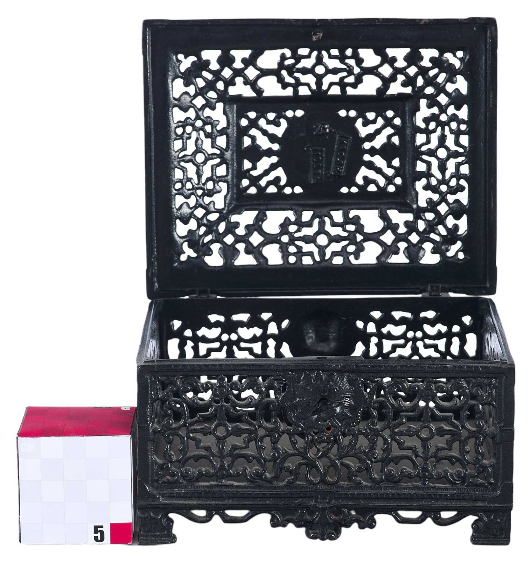 Шкатулка ажурная с маскароном. На основании клейма: «КАСЛИ», «1957 г.», «28». Отливка 1957 года по модели 1830 г. Прусского королевского литейного завода в Берлине. Шкатулка опубликована в альбоме-каталоге «Художственное литье XIX - XX вв. в собрании Екатеринбургского музея изобразительных искусств». Авт.-сост. - О.П. Губкин, Г.П. Шайдурова — Екатеринбург, Изд. дом «Автограф», 2005 с. 144 — кат. №338-339.