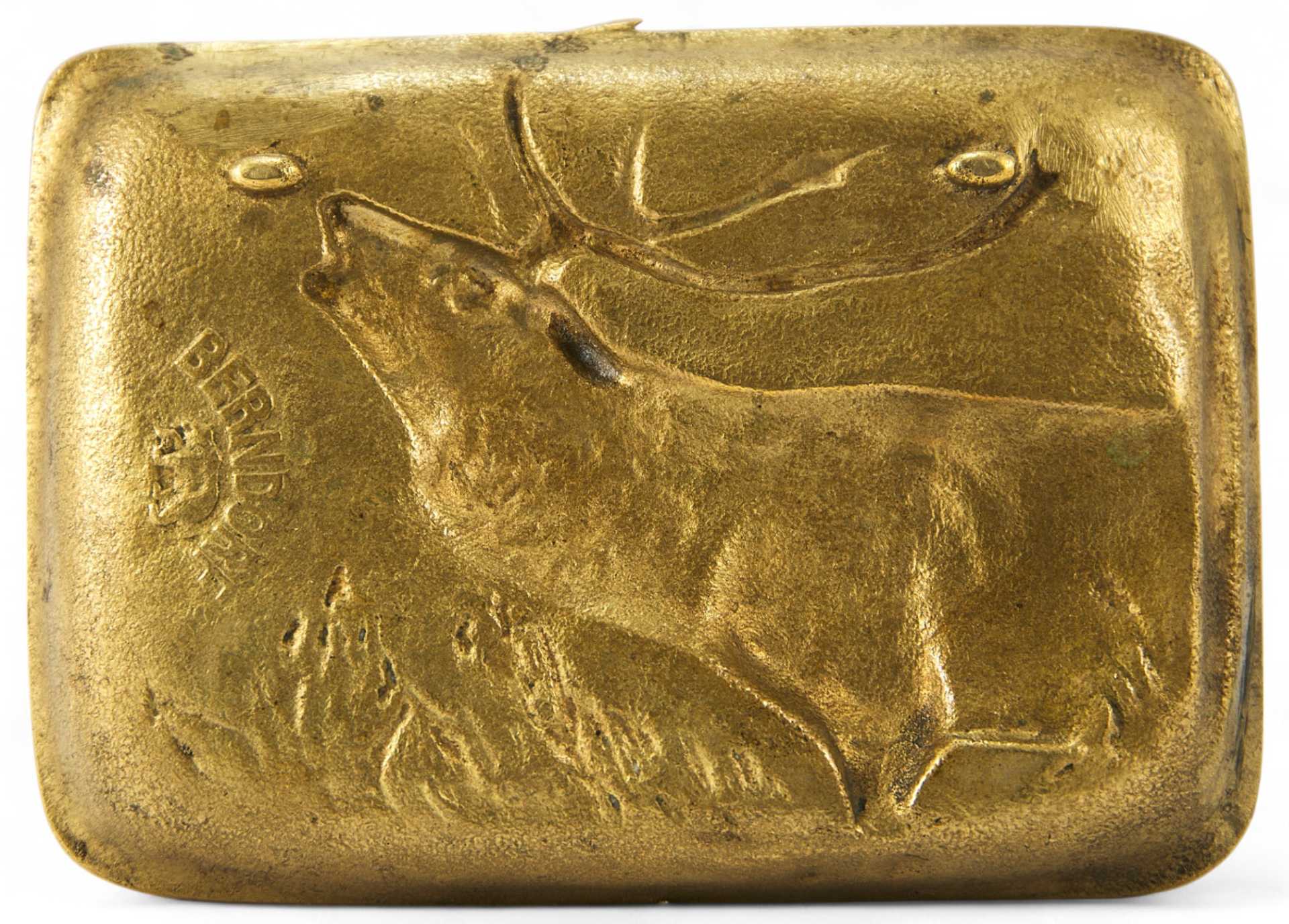 Панно-пепельница плоская, прямоугольная, с рельефным изображением благородного оленя в зарослях травы. На обороте клеймо: “Berndorf” и изображение медведя.