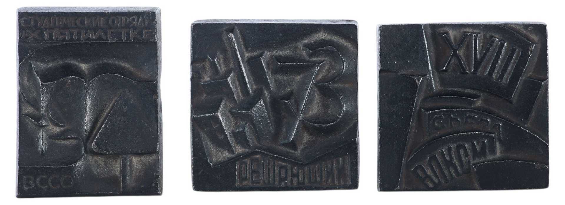Три плакетки посвященные ВССО (Всесоюзным студенческим стройотрядам). На левой плакетке стилизованная надпись XVII съезд ВЛКСМ. На центральной плакетке изображен мастерок на фоне открытой книги, надпись сверху: "Студенческие отряды IX пятилетие ВССО/слева внизу: "ВССО". НА правой плакетке стилизованное изображение фрагмента города и цифра 73, ниже: "Решающий". На обороте плакеток клейма: "КАСЛИ1989".