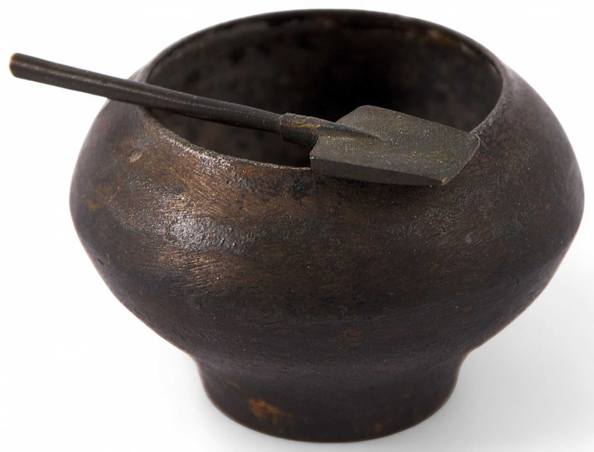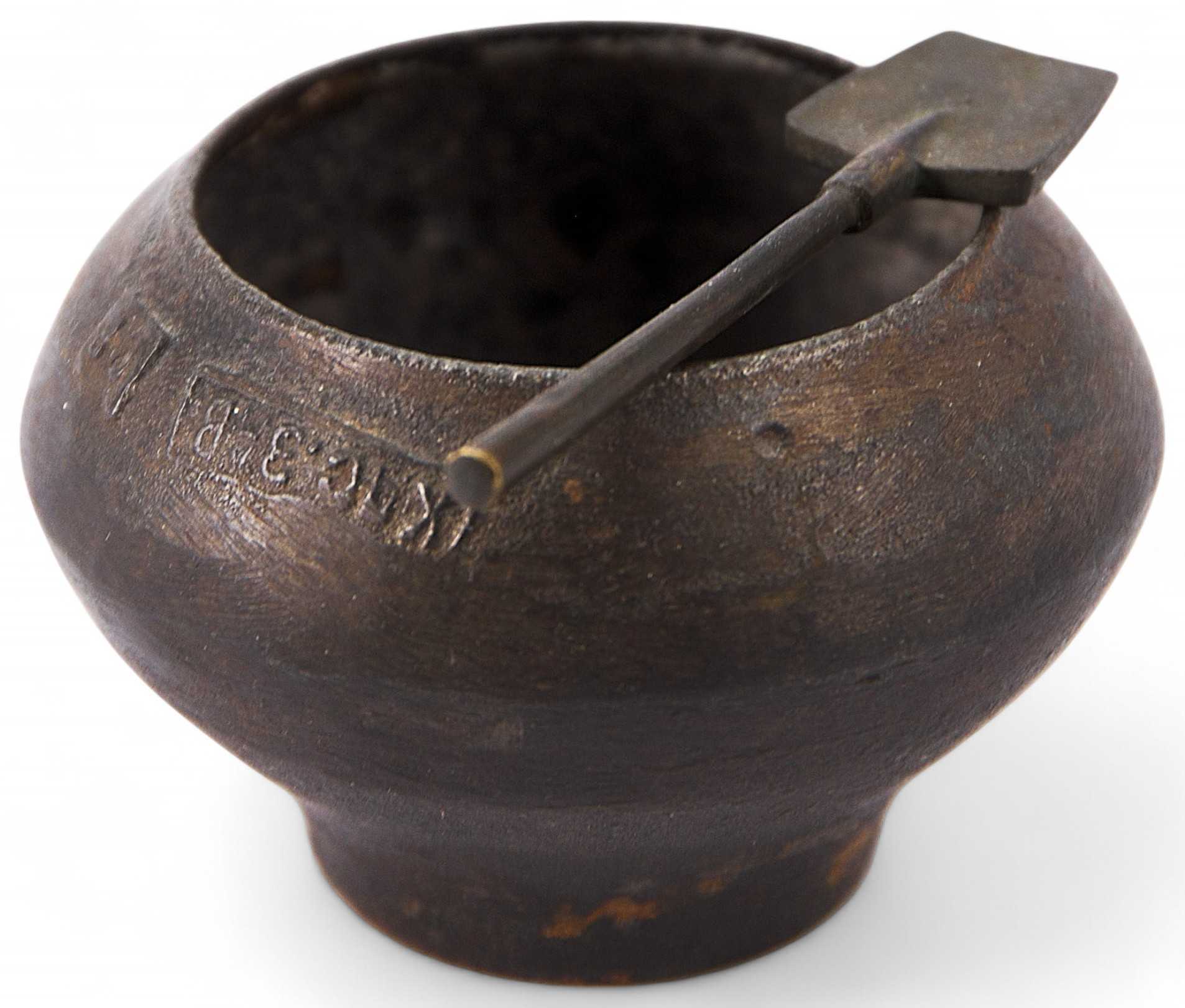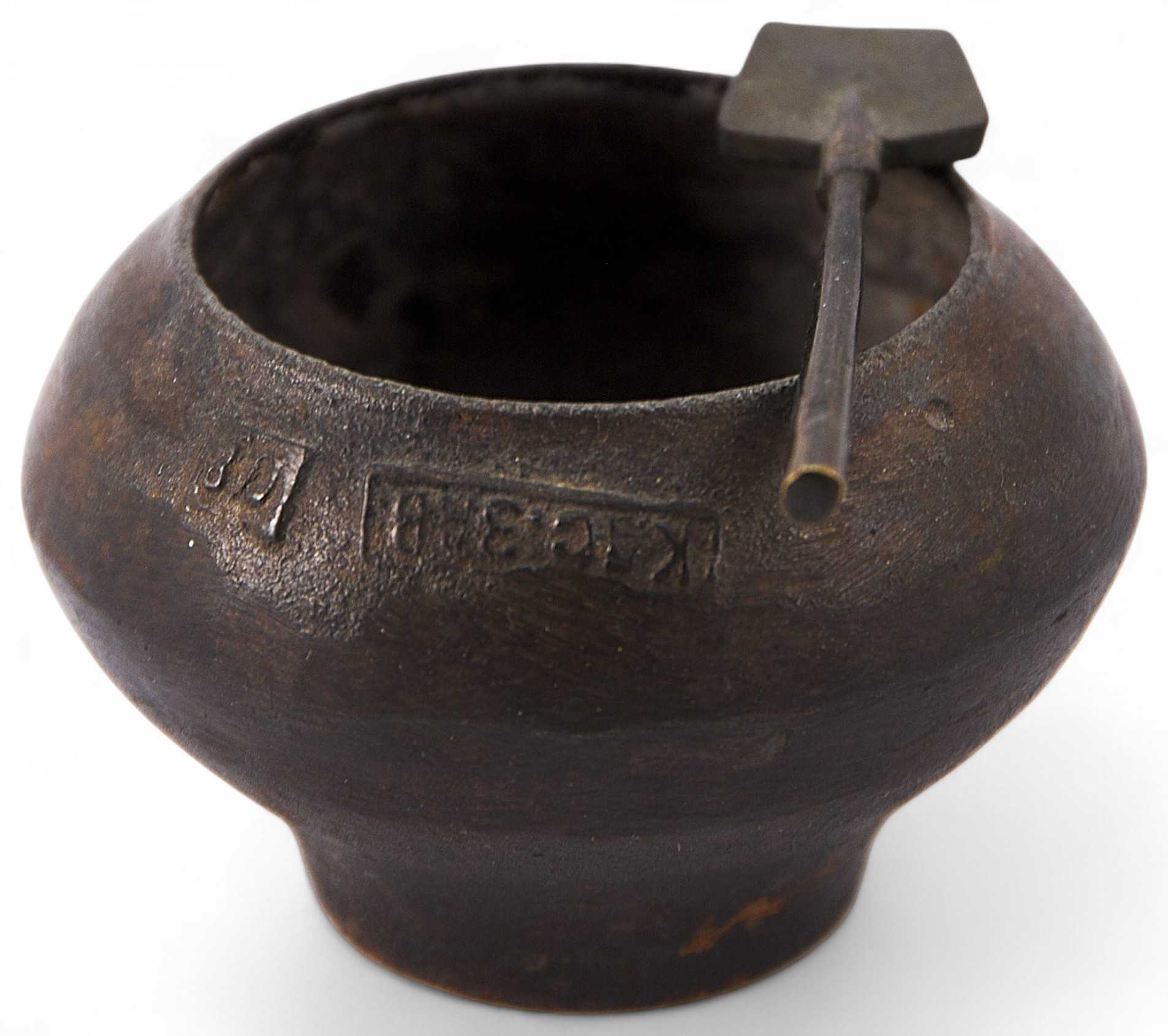 Пепельница «Чугунок» («Горшок»), На предмете клеймо изготовителя и номер: «КАС.ЗАВ.», «08». Отливка 1946г. по авторской модели 1890-х гг. С 1948г. на предметах художественного производства Каслинского чугунолитейного завода ставилось клеймо «ЗАВ. КАС.».