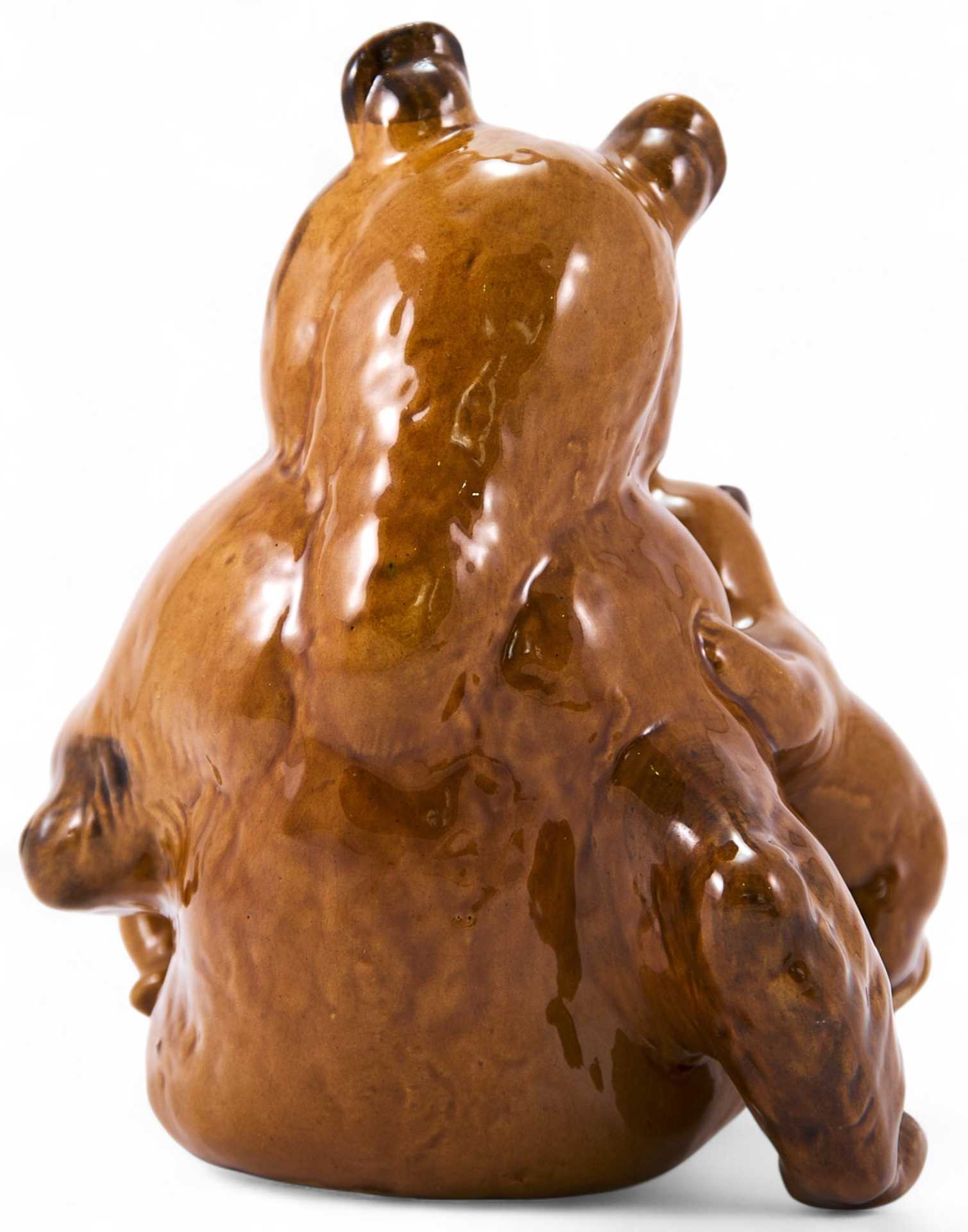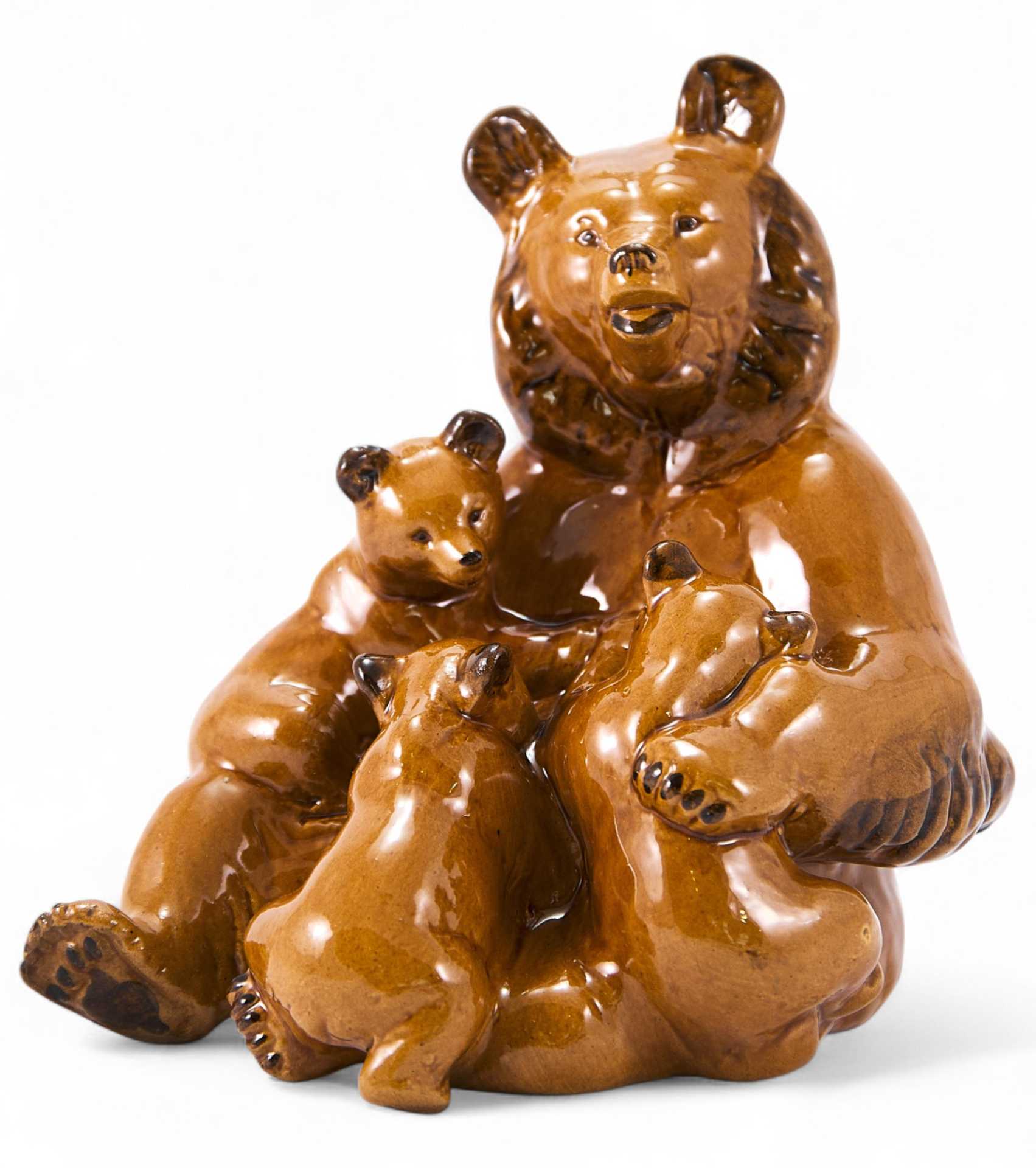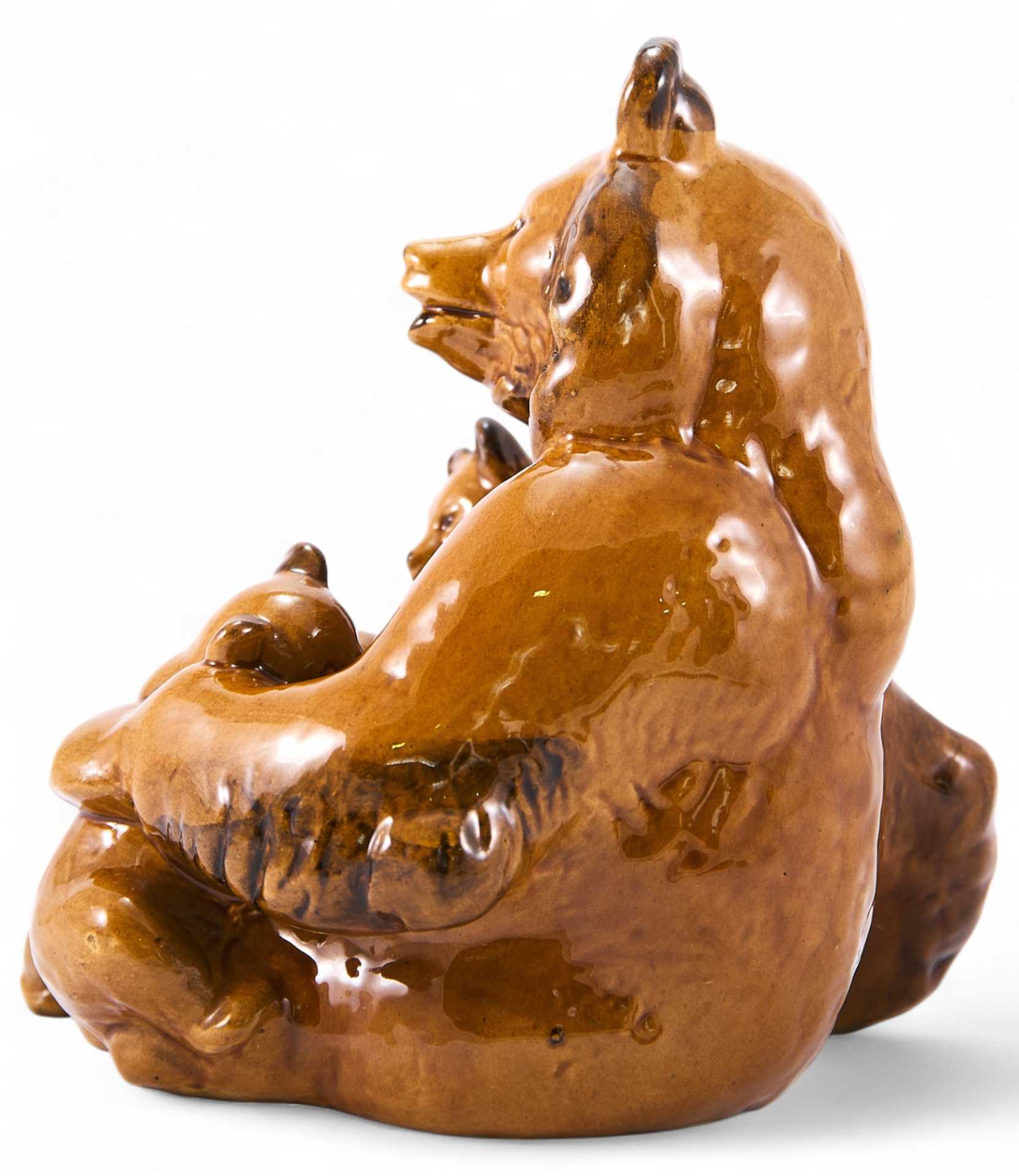 Скульптура медведицы, обнимающей медвежат. Скульптура выполнена из керамики и покрыта цветной обливной глазурью.